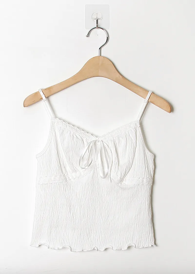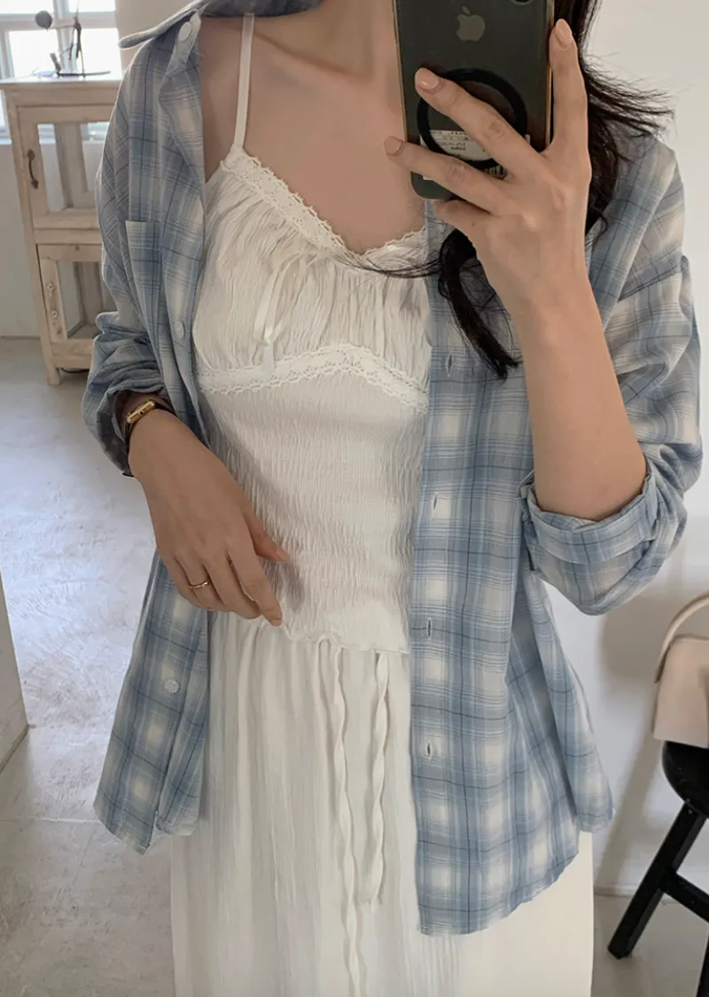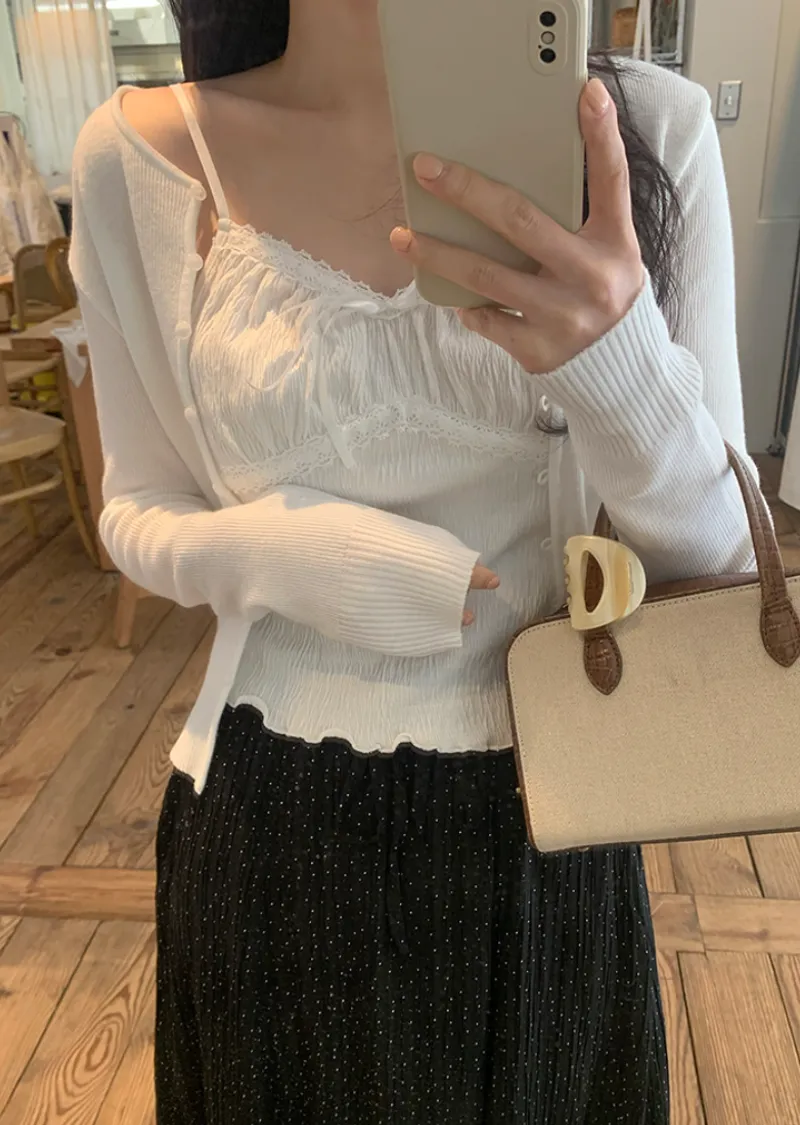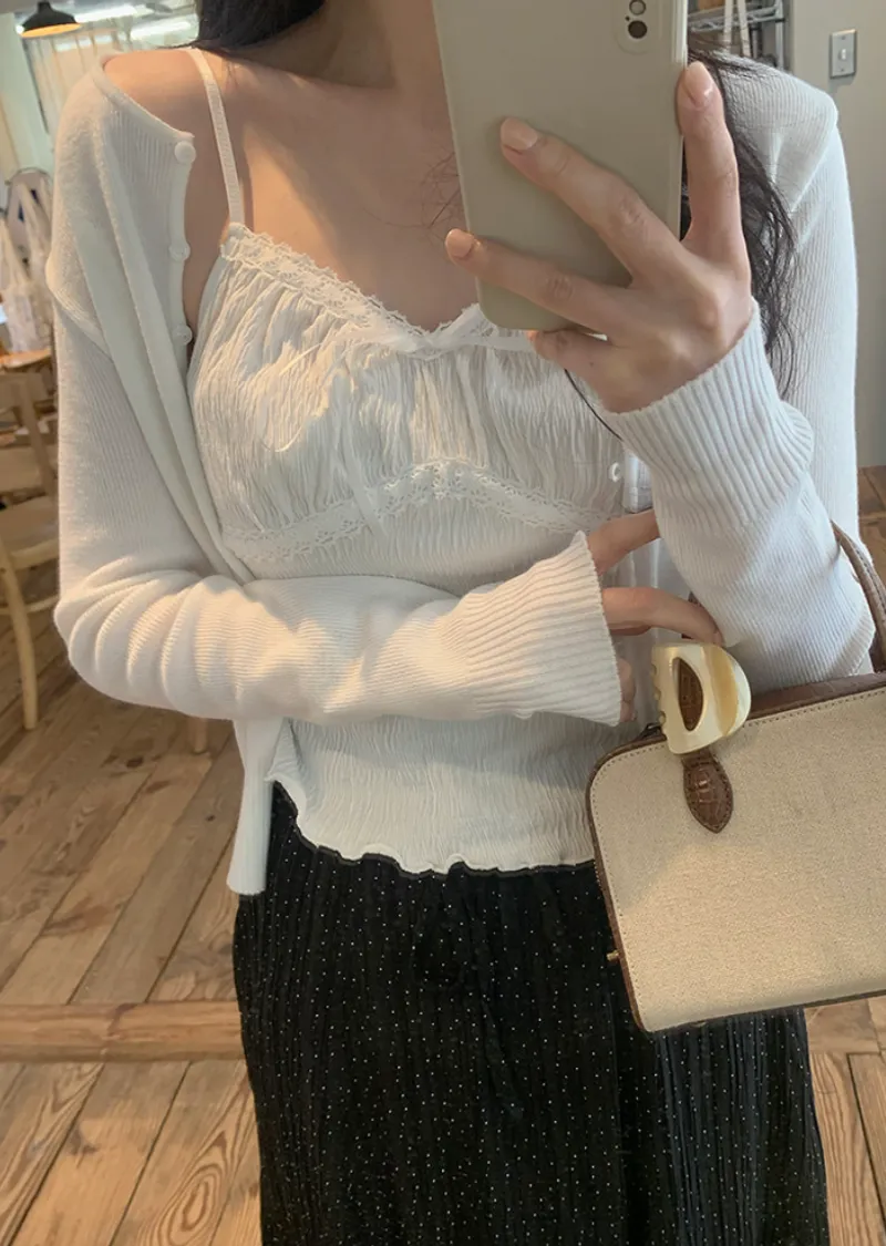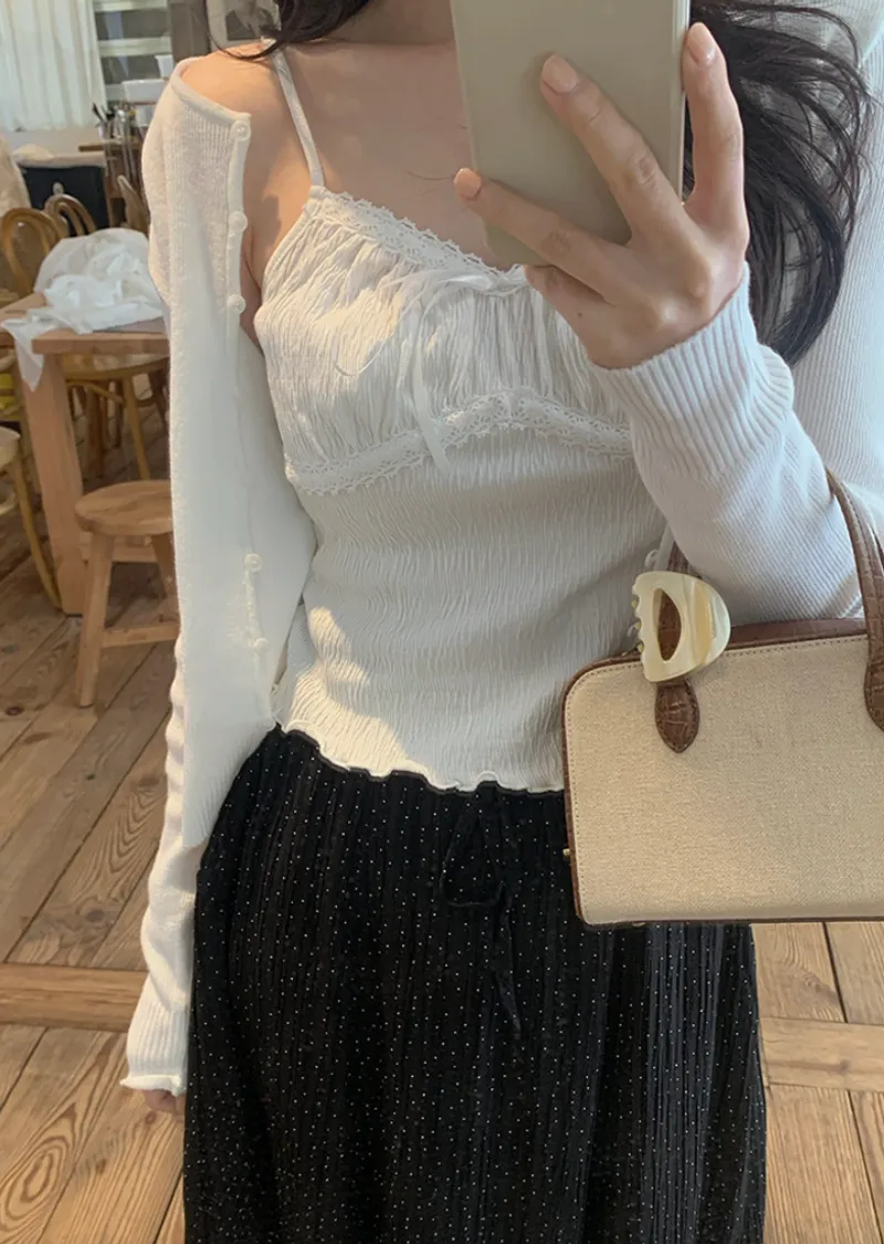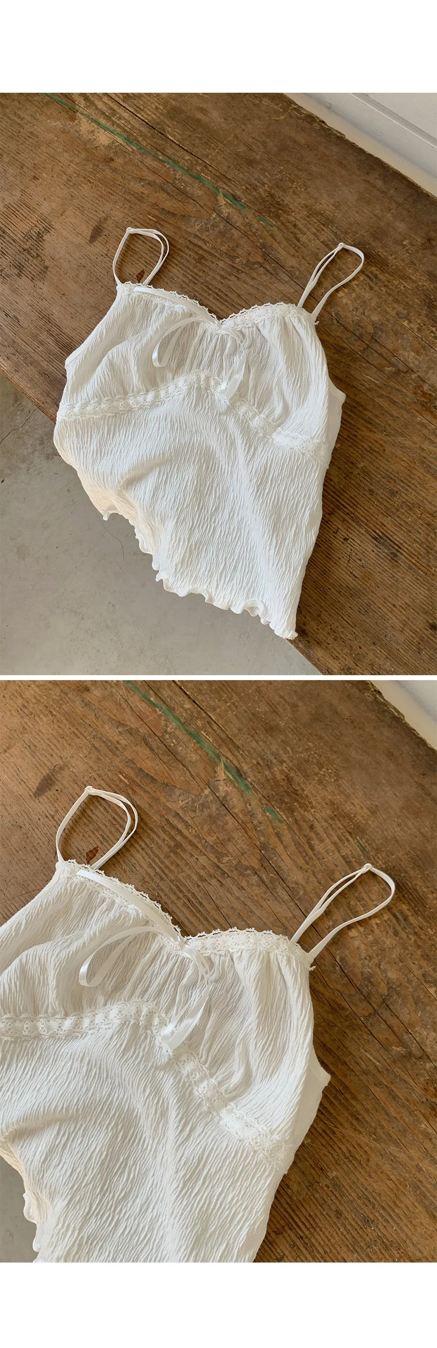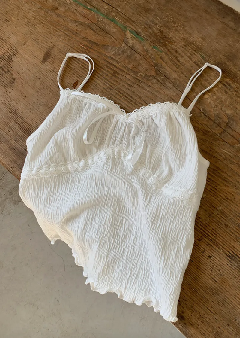 材質:97% 棉 + 3% 氨綸。充滿女性化的無袖上衣♡在領口和胸線處飾以蕾絲細節,營造出柔美的氛圍。 搭配各種上衣時, 蕾絲線條若隱若現, 更添幾分嫵媚動人。緞帶繫帶和波浪下擺的設計更添可愛 ,纖細的肩帶勾勒出精緻的身形。夏季單穿再適合不過,換季時節,它也是內搭的理想選擇。布料上的細微褶皺設計,增添了一抹獨特的亮點,避免了單調感。 這款無袖上衣散發著濃鬱的女性魅力 :)