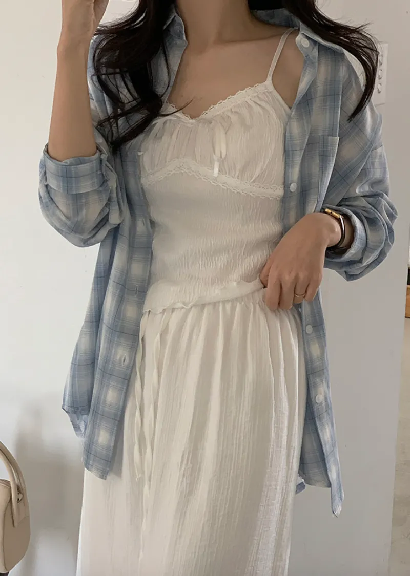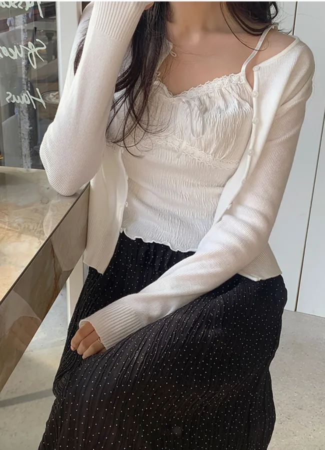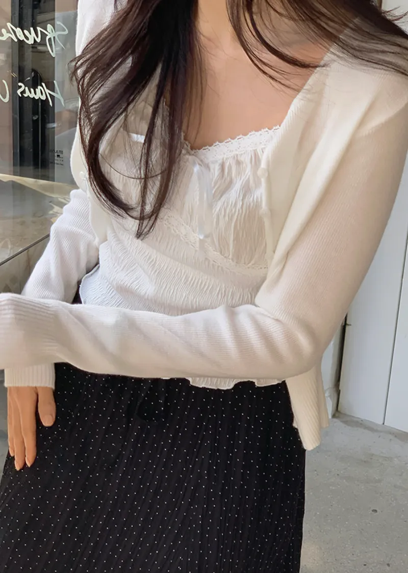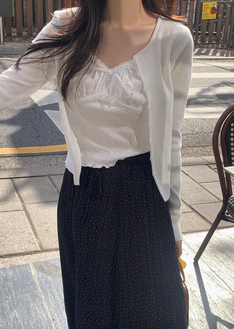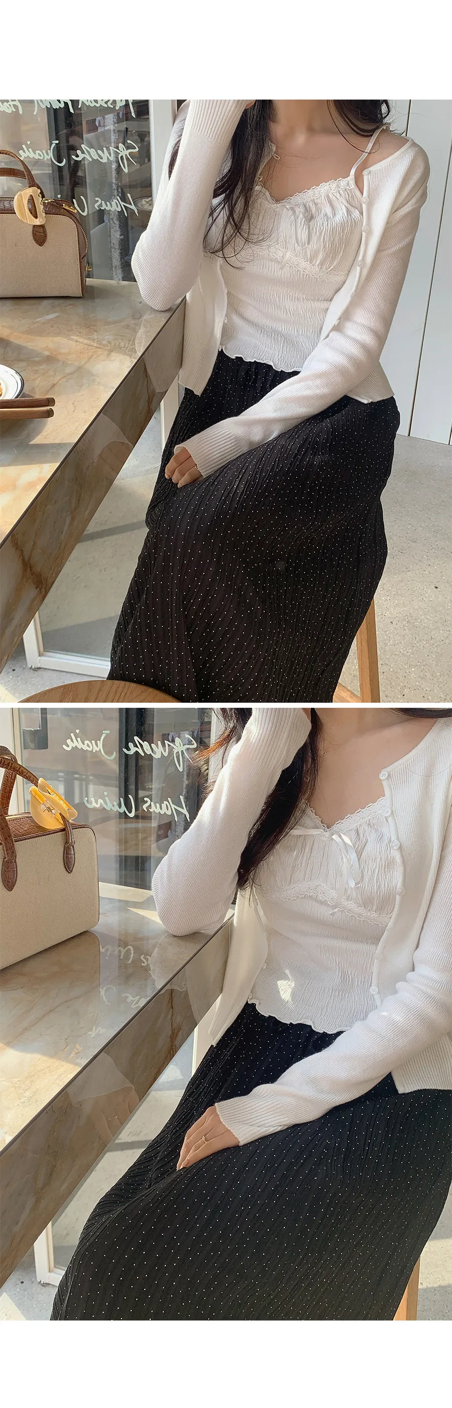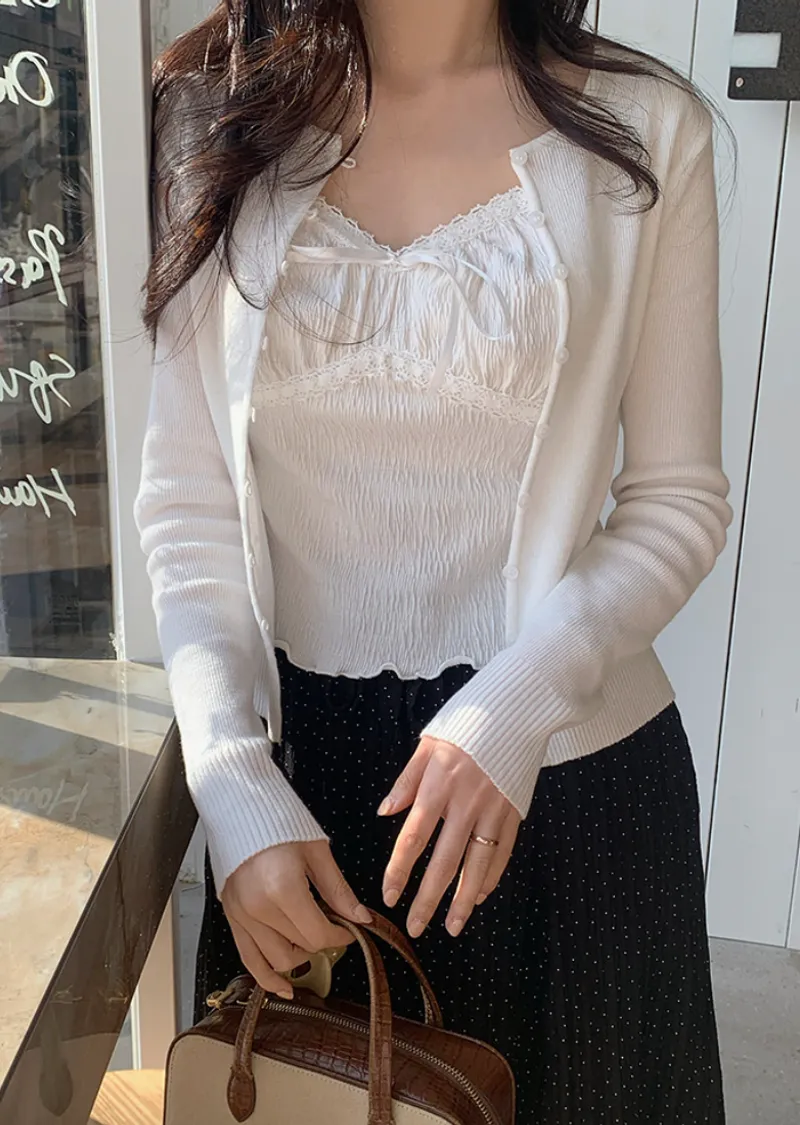 材質:97% 棉 + 3% 氨綸。充滿女性化的無袖上衣♡在領口和胸線處飾以蕾絲細節,營造出柔美的氛圍。 搭配各種上衣時, 蕾絲線條若隱若現, 更添幾分嫵媚動人。緞帶繫帶和波浪下擺的設計更添可愛 ,纖細的肩帶勾勒出精緻的身形。夏季單穿再適合不過,換季時節,它也是內搭的理想選擇。布料上的細微褶皺設計,增添了一抹獨特的亮點,避免了單調感。 這款無袖上衣散發著濃鬱的女性魅力 :)