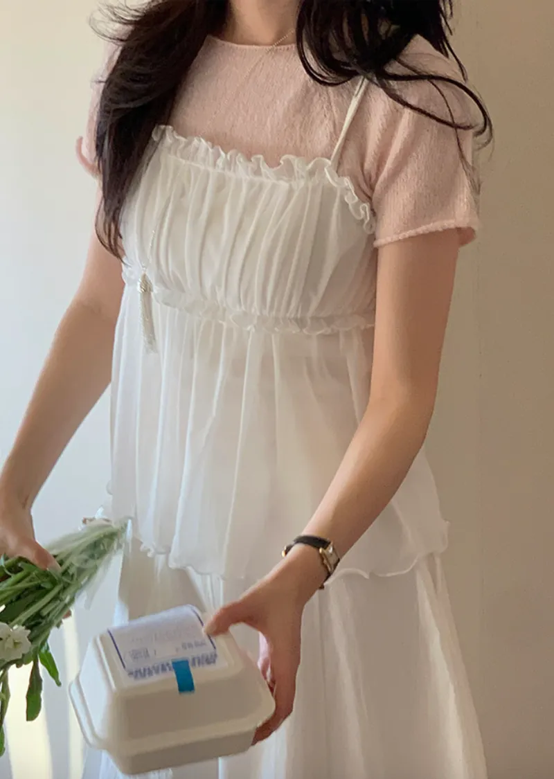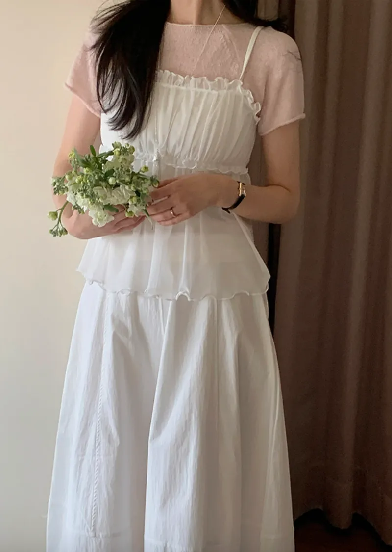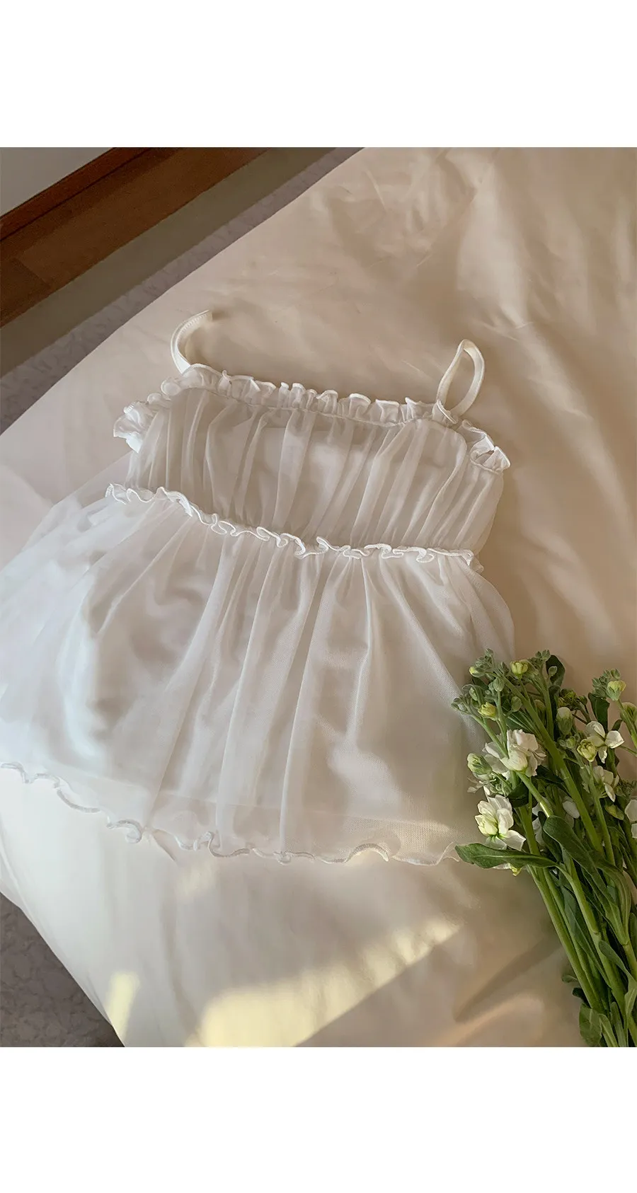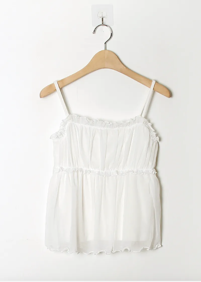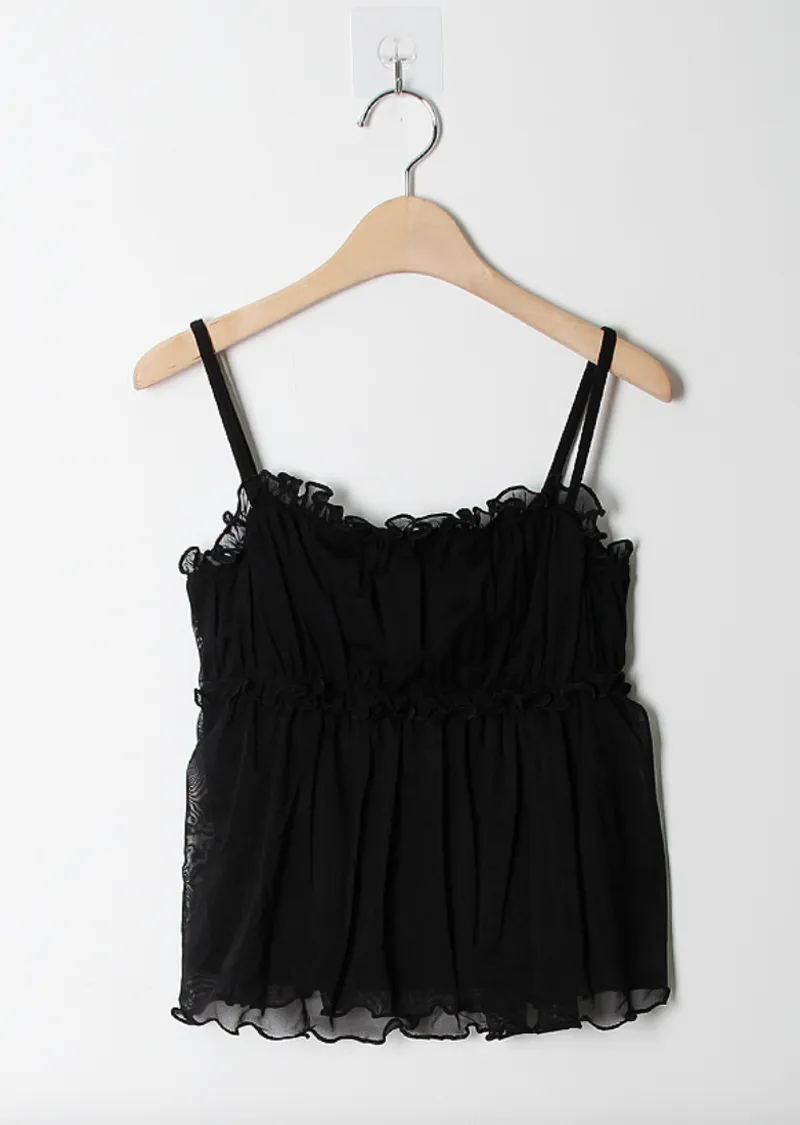 材質:95% 棉 + 5% 氨綸。充滿了女性化細節的無袖上衣♡領口和胸線的荷葉邊設計營造出柔美的氛圍。棉質面料上覆蓋著層疊的雪紡蕾絲,更添幾分嫵媚動人:) 飄逸的蕾絲布料帶來飄逸感,胸前的褶皺設計增添了一絲嫵媚,纖細的肩帶勾勒出精緻的輪廓♡ 夏季單穿再合適不過,換季時節,它也可以作為內搭,與各種針織衫疊穿, 打造層次感 :)推薦將這款上衣加入你的衣櫥, 一件輕鬆打造女性魅力:)