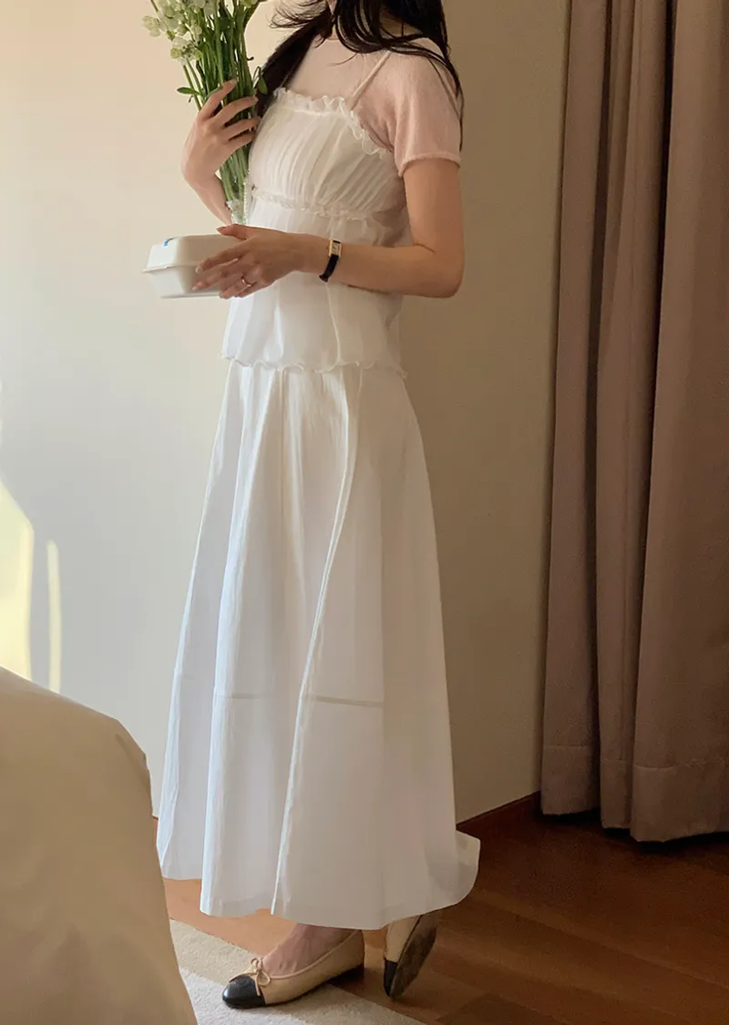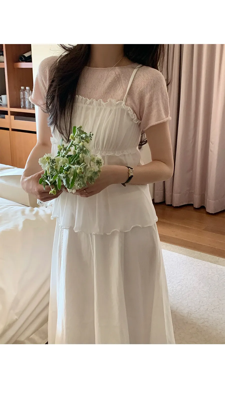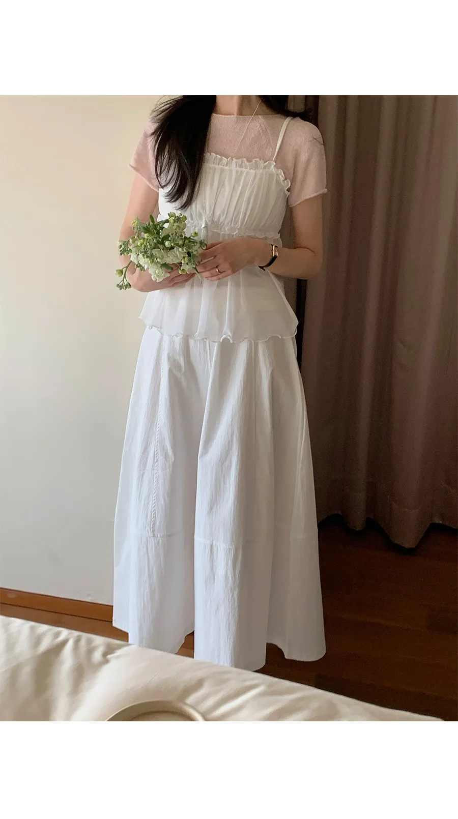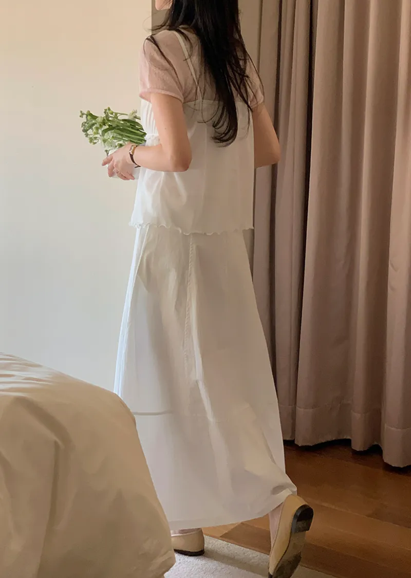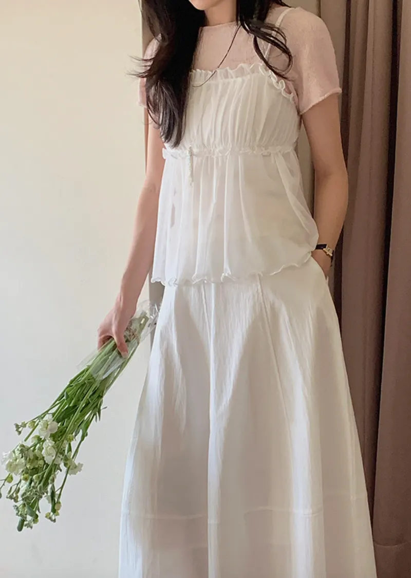 材質:95% 棉 + 5% 氨綸。充滿了女性化細節的無袖上衣♡領口和胸線的荷葉邊設計營造出柔美的氛圍。棉質面料上覆蓋著層疊的雪紡蕾絲,更添幾分嫵媚動人:) 飄逸的蕾絲布料帶來飄逸感,胸前的褶皺設計增添了一絲嫵媚,纖細的肩帶勾勒出精緻的輪廓♡ 夏季單穿再合適不過,換季時節,它也可以作為內搭,與各種針織衫疊穿, 打造層次感 :)推薦將這款上衣加入你的衣櫥, 一件輕鬆打造女性魅力:)