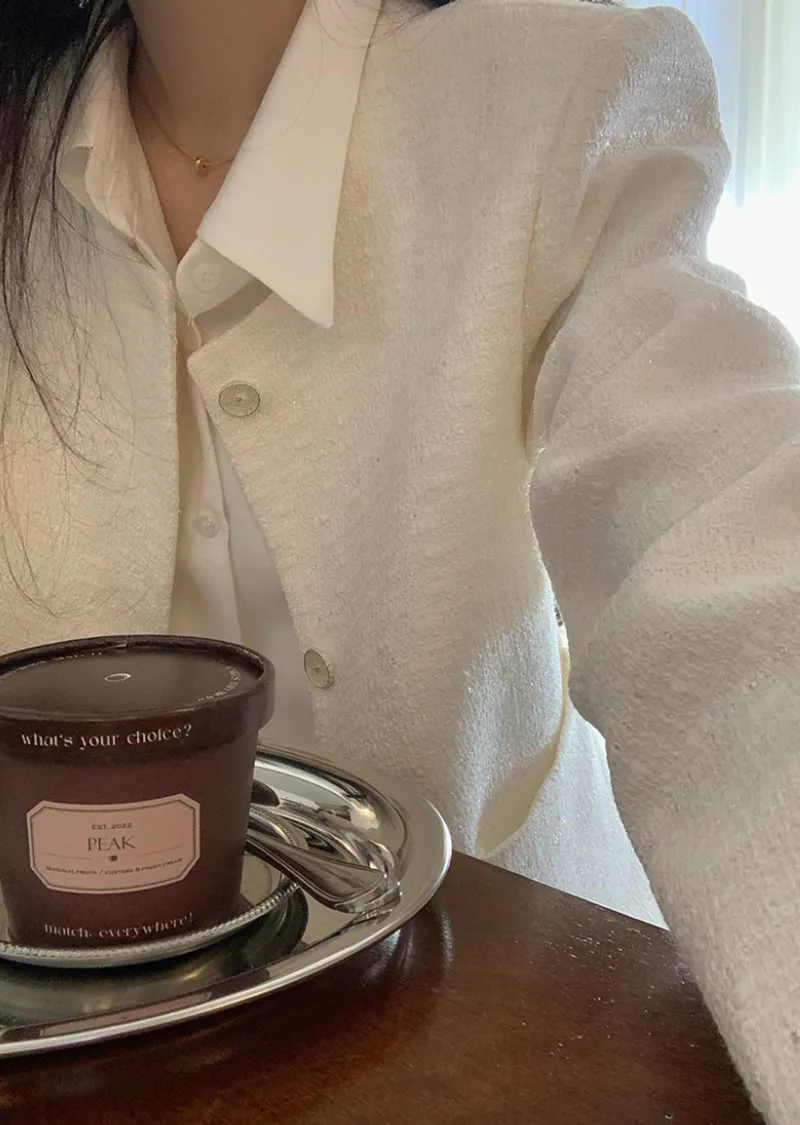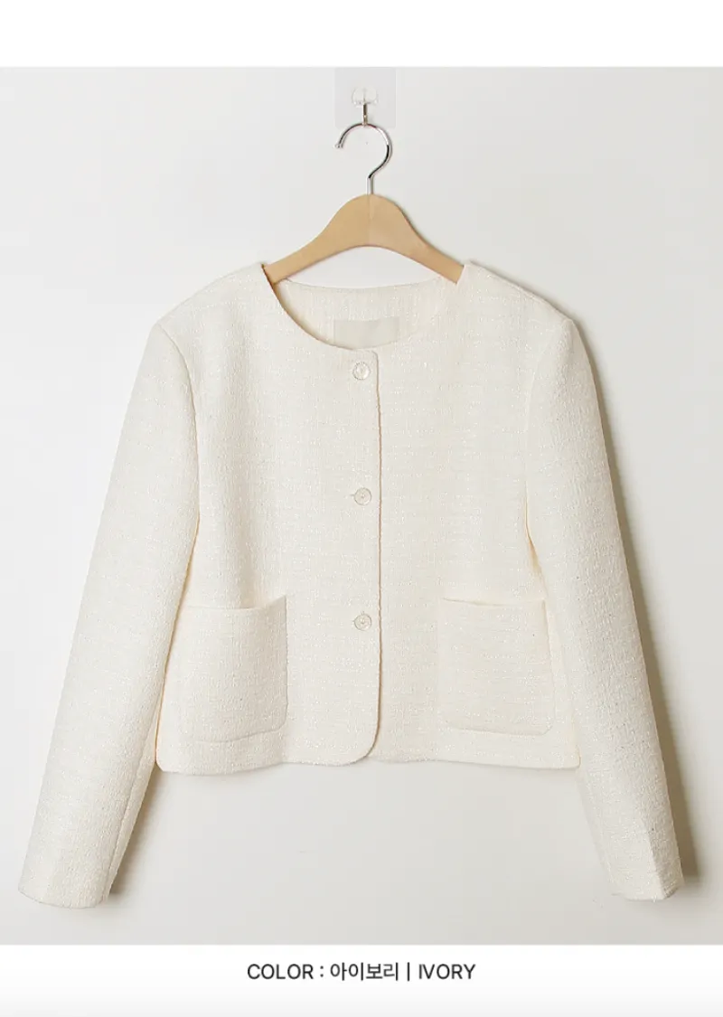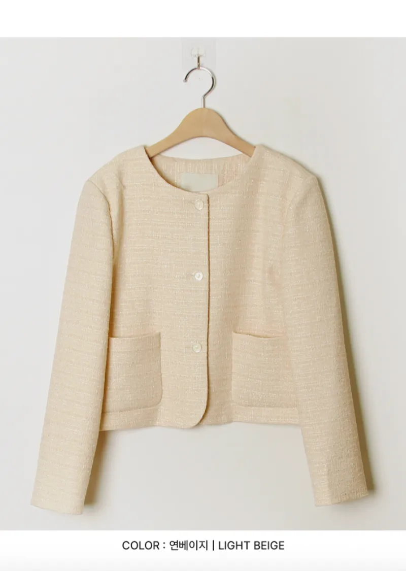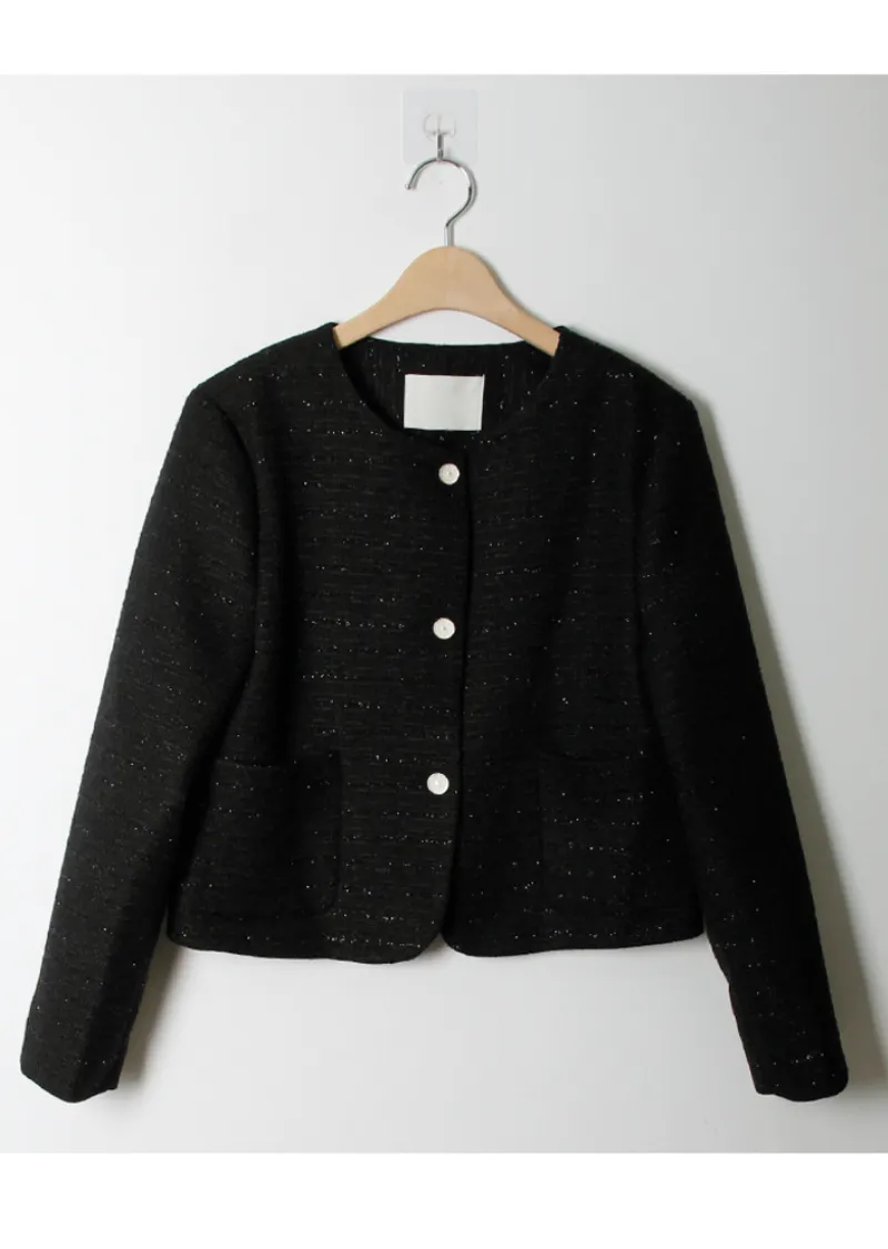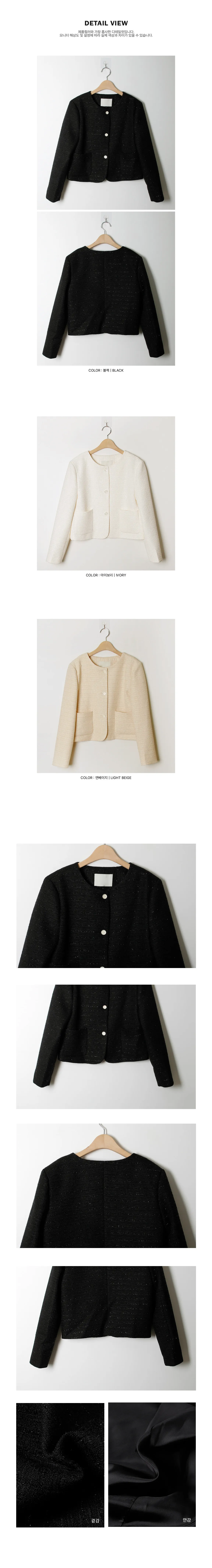 材質:100% 聚酯纖維。散發浪漫氣息的花呢外套 !這款外套是換季時節出席正式場合的完美選擇 。花呢布料與銀線交織,極具精緻感 。標準版型與及臀的短設計,打造出修長腿部線條 。獨特的鈕扣增添了一絲奢華氣息, 而無領圓領則確保了簡潔俐落的造型。 纖薄的墊肩提升了整體的合身度 。作為一款充滿女性魅力的外套, 無論是出席婚禮還是約會,都能輕鬆打造完美造型。
