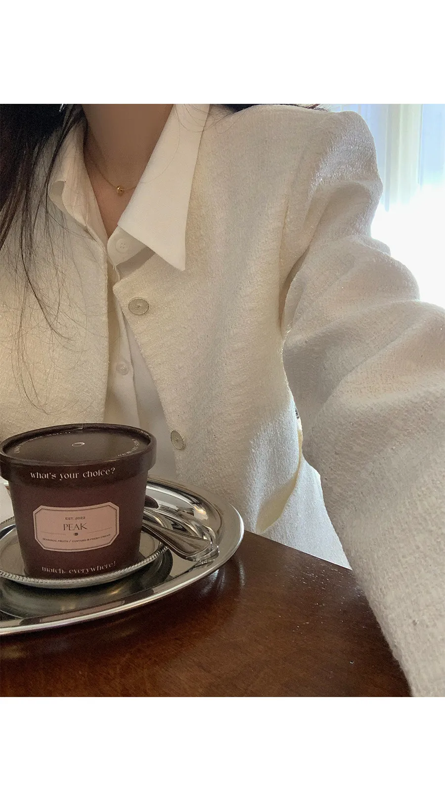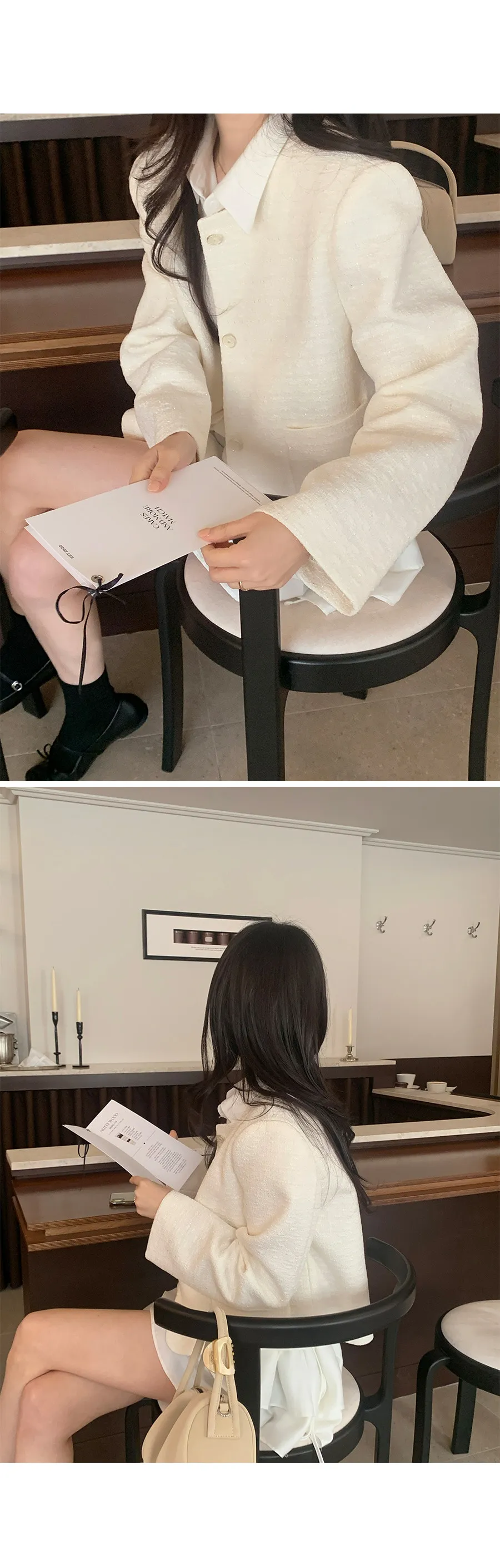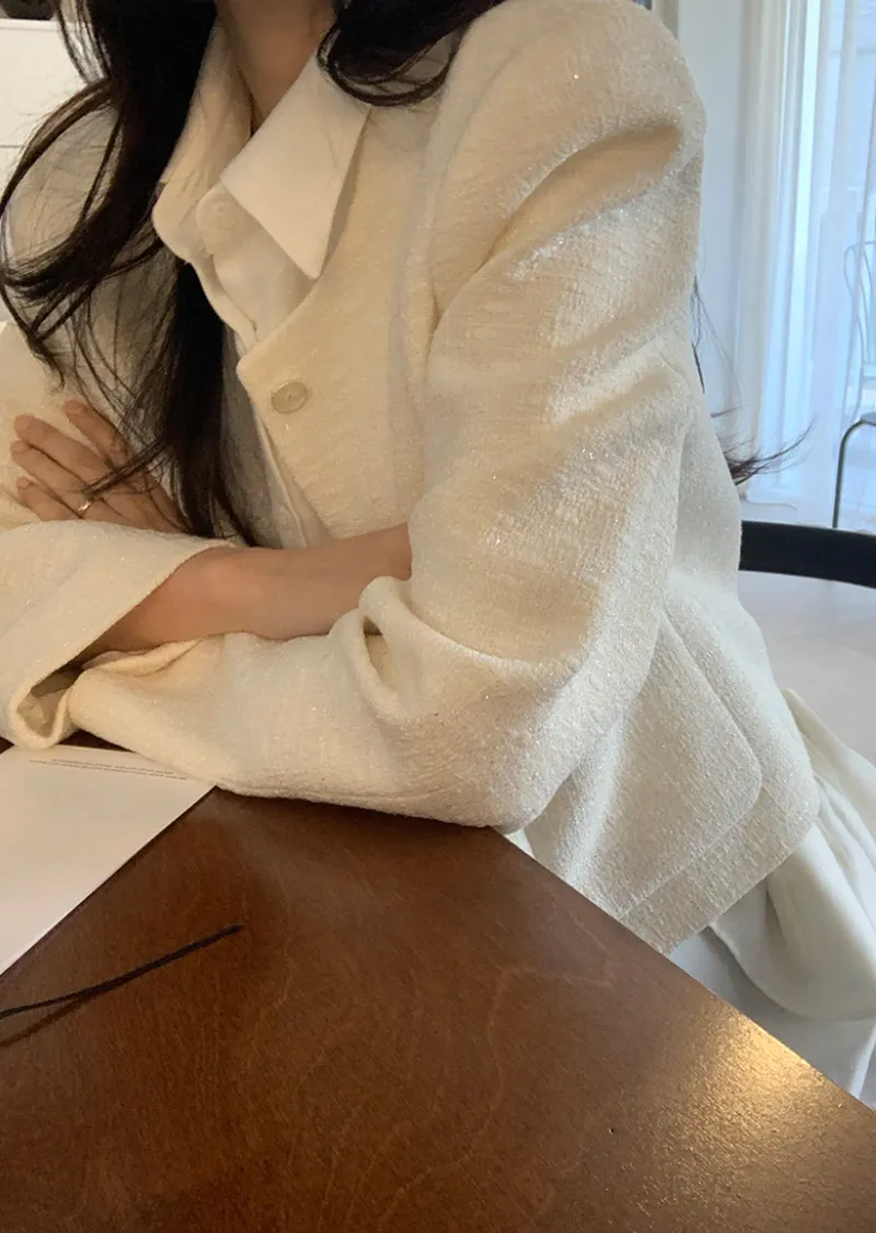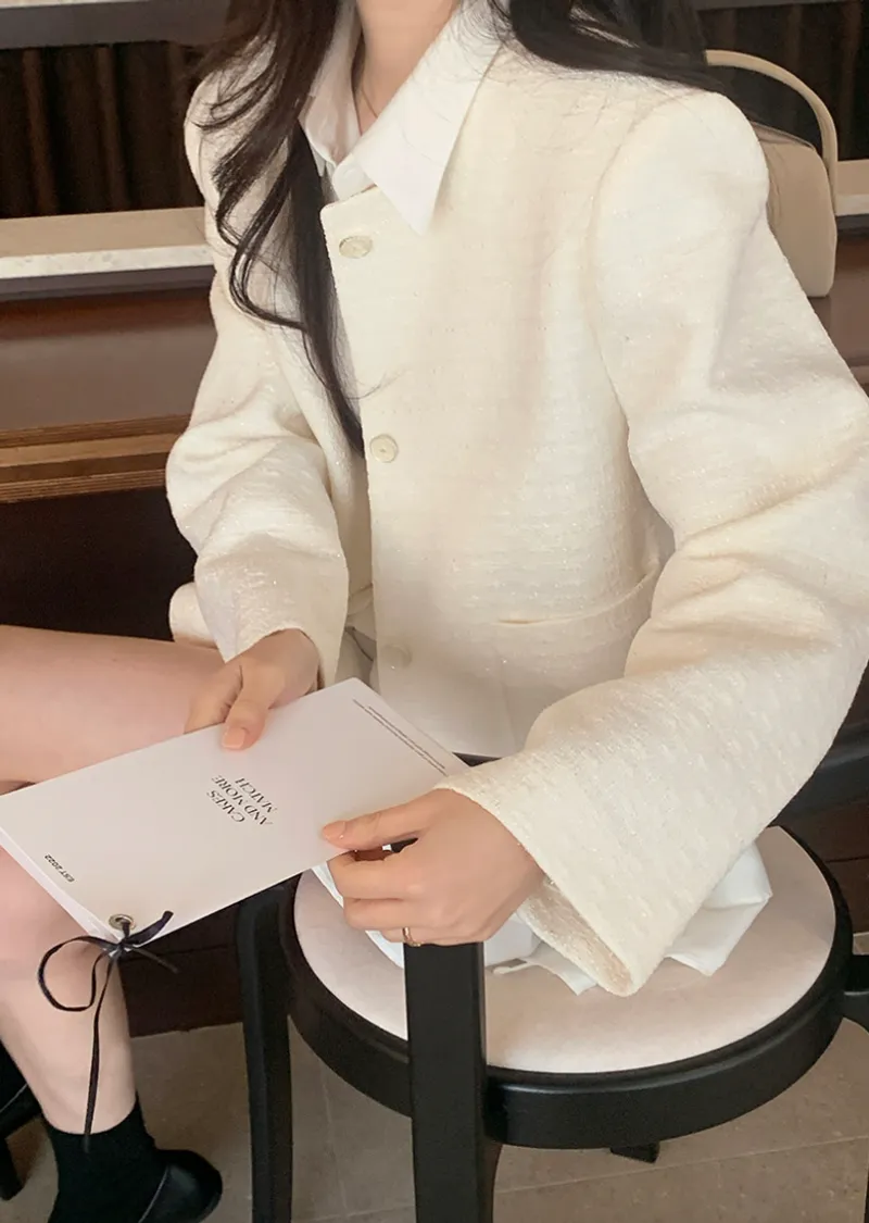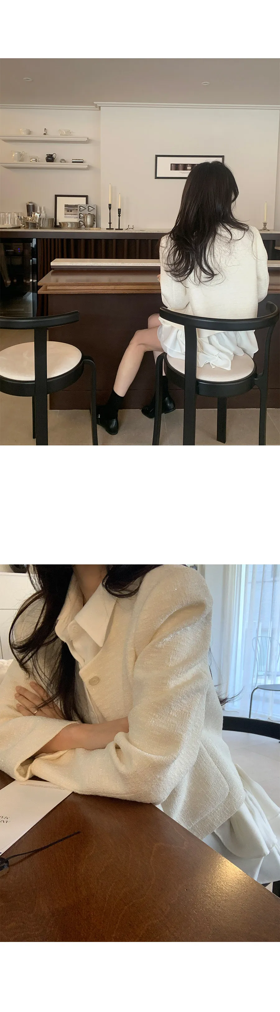 材質:100% 聚酯纖維。散發浪漫氣息的花呢外套 !這款外套是換季時節出席正式場合的完美選擇 。花呢布料與銀線交織,極具精緻感 。標準版型與及臀的短設計,打造出修長腿部線條 。獨特的鈕扣增添了一絲奢華氣息, 而無領圓領則確保了簡潔俐落的造型。 纖薄的墊肩提升了整體的合身度 。作為一款充滿女性魅力的外套, 無論是出席婚禮還是約會,都能輕鬆打造完美造型。