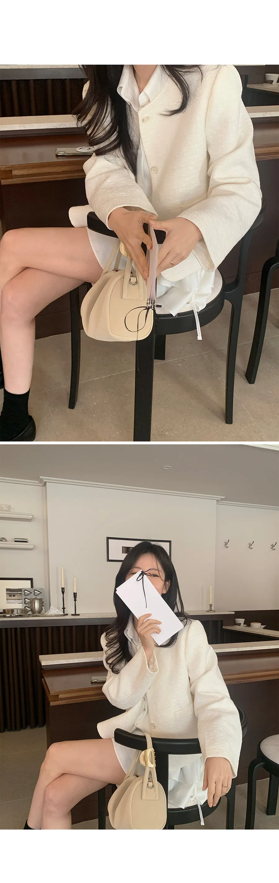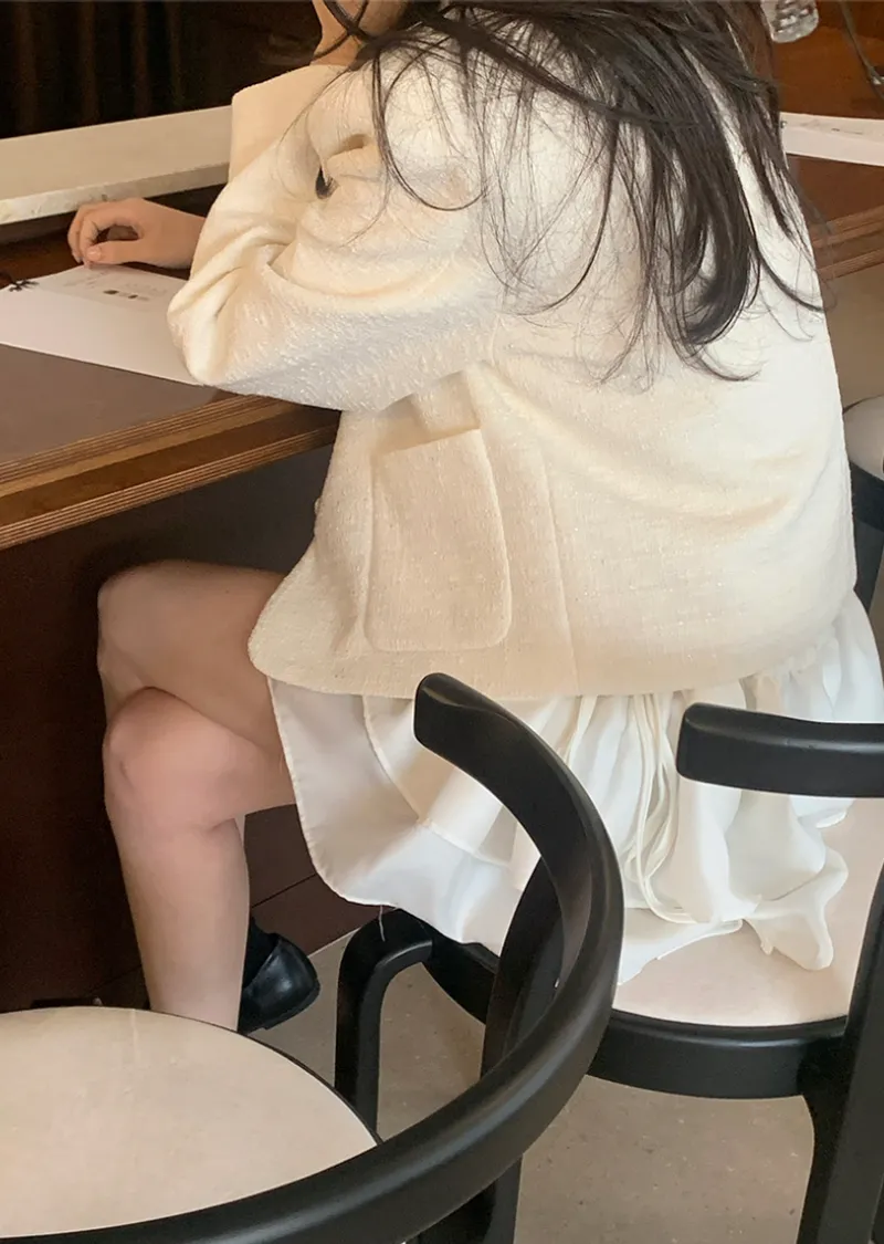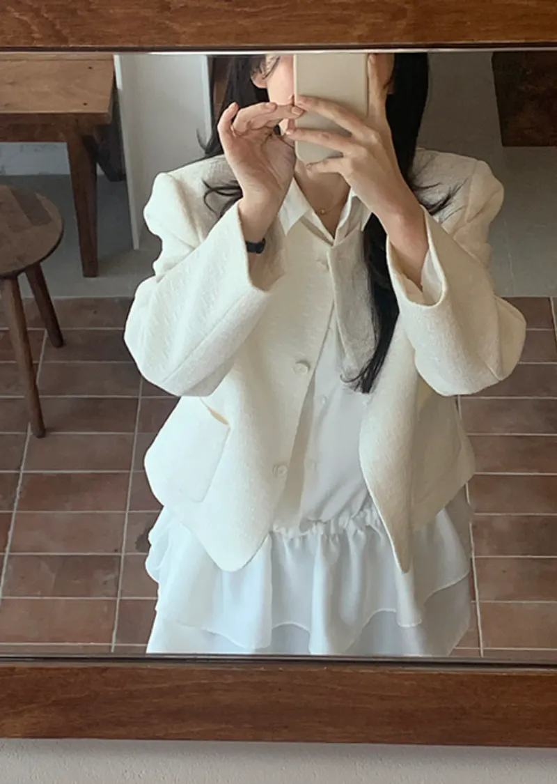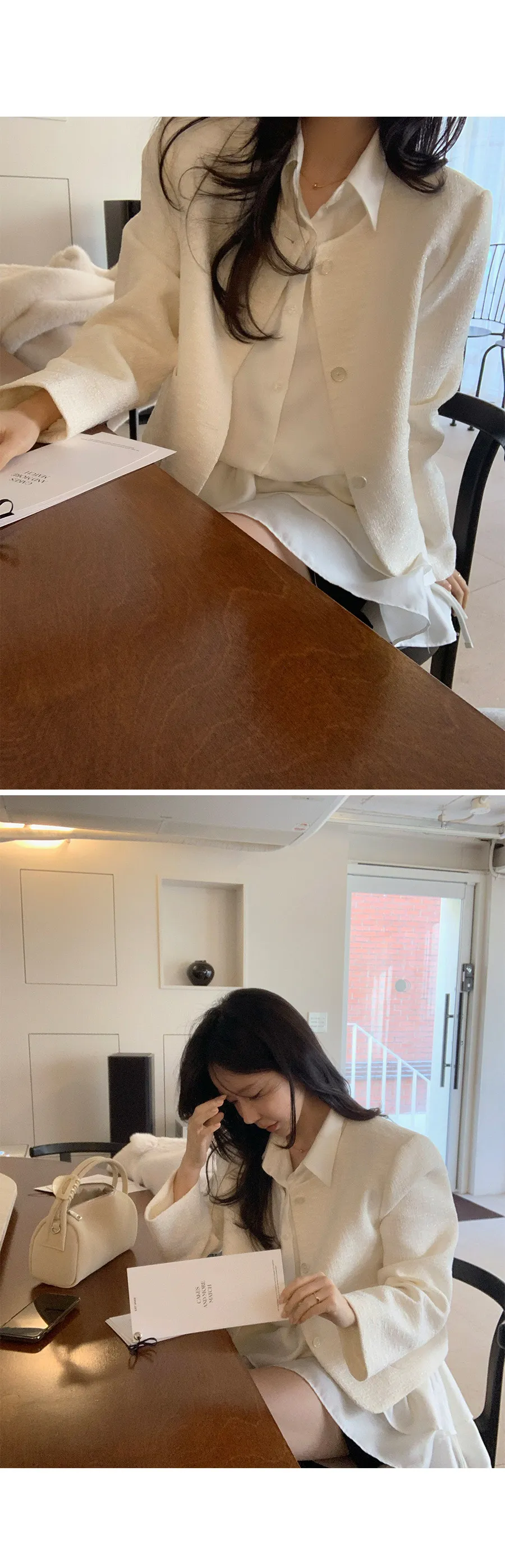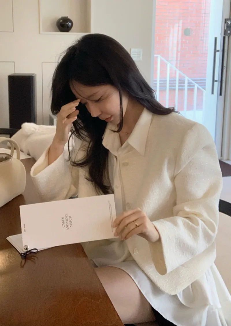 材質:100% 聚酯纖維。散發浪漫氣息的花呢外套 !這款外套是換季時節出席正式場合的完美選擇 。花呢布料與銀線交織,極具精緻感 。標準版型與及臀的短設計,打造出修長腿部線條 。獨特的鈕扣增添了一絲奢華氣息, 而無領圓領則確保了簡潔俐落的造型。 纖薄的墊肩提升了整體的合身度 。作為一款充滿女性魅力的外套, 無論是出席婚禮還是約會,都能輕鬆打造完美造型。
