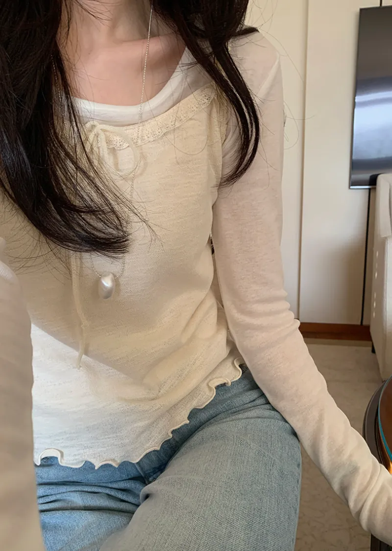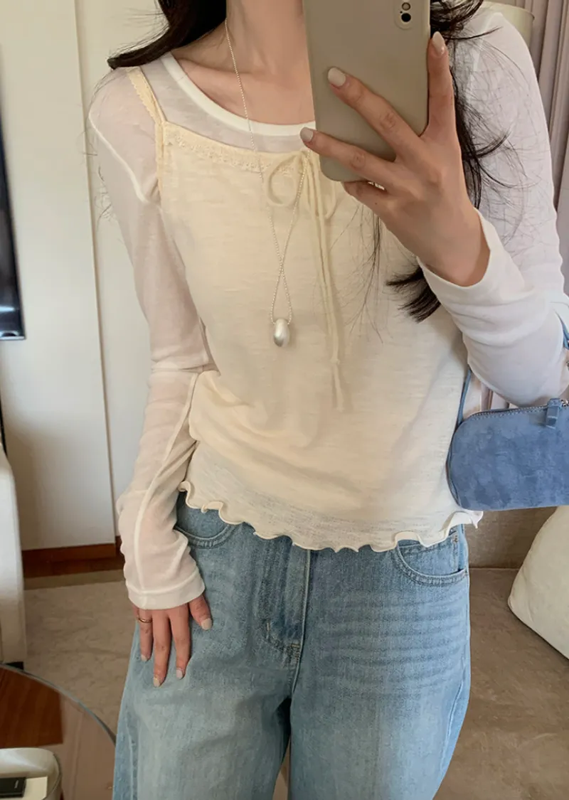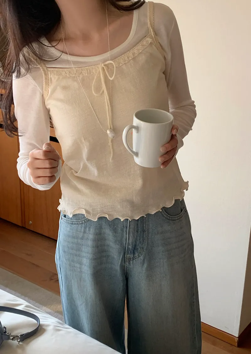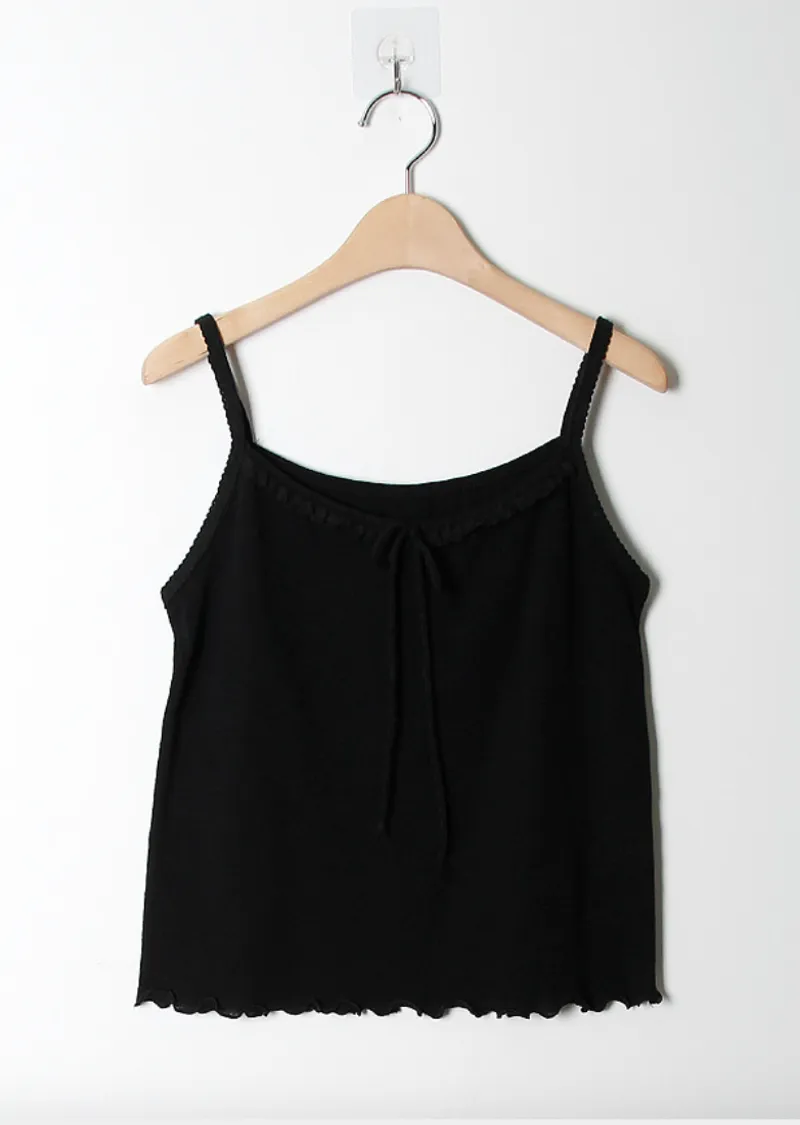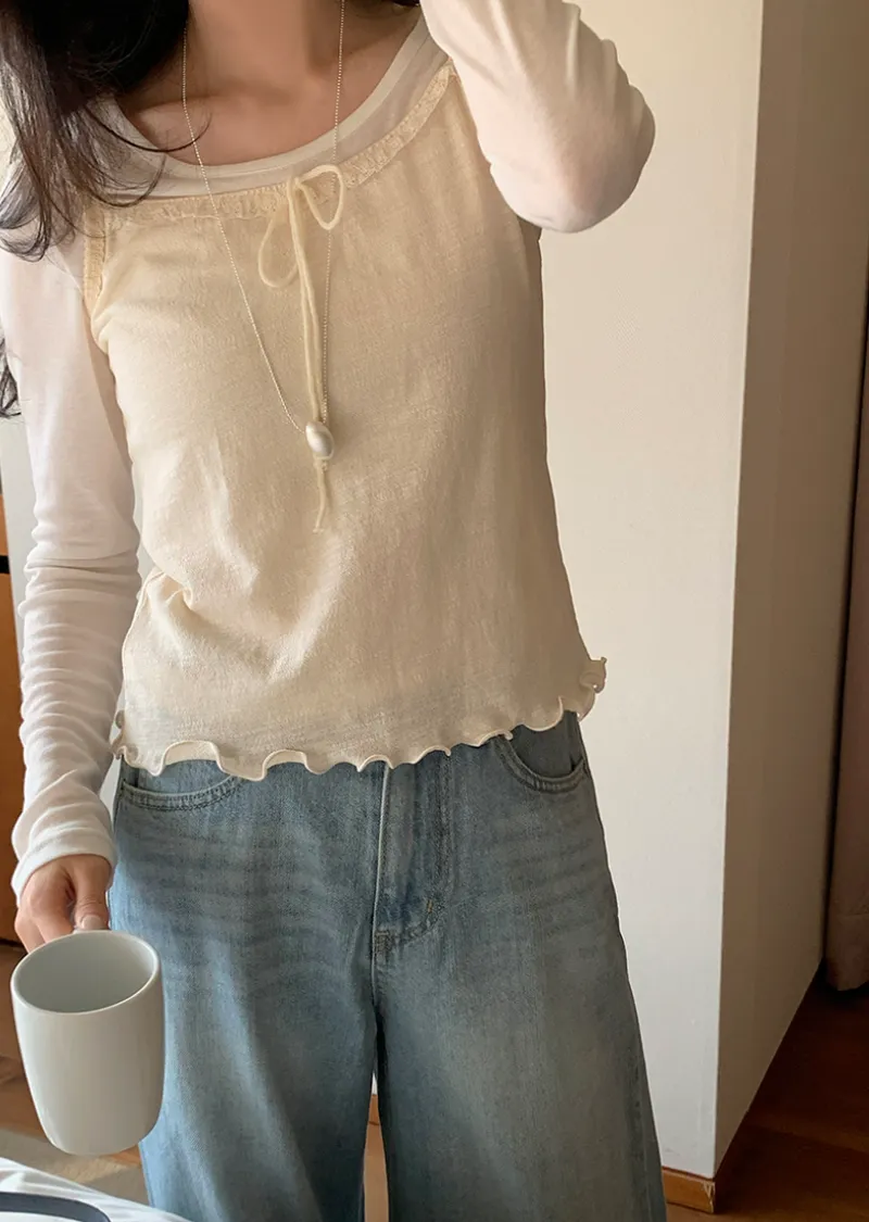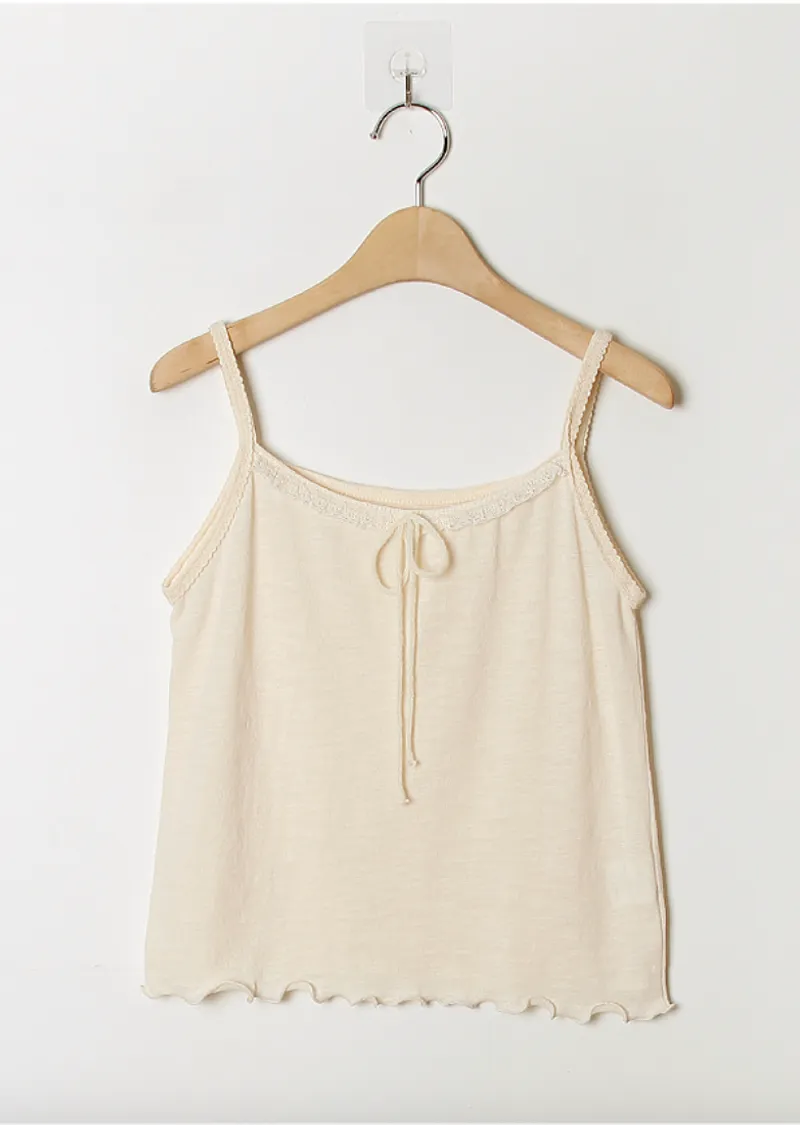 柔美氛圍領口肩帶蕾絲襯邊波浪下擺無袖上衣