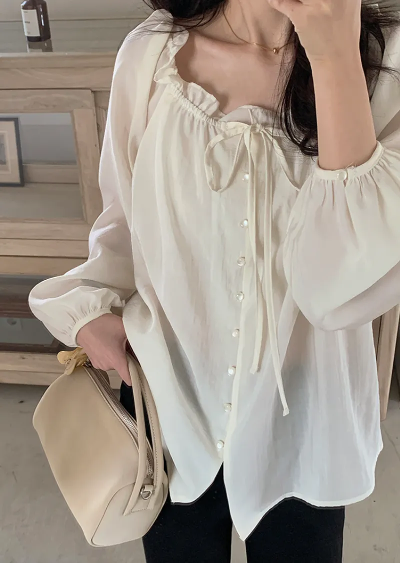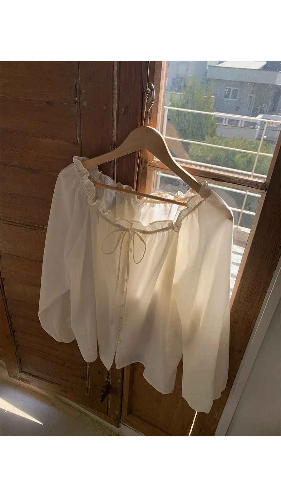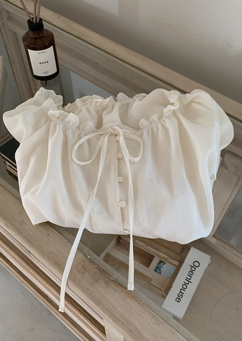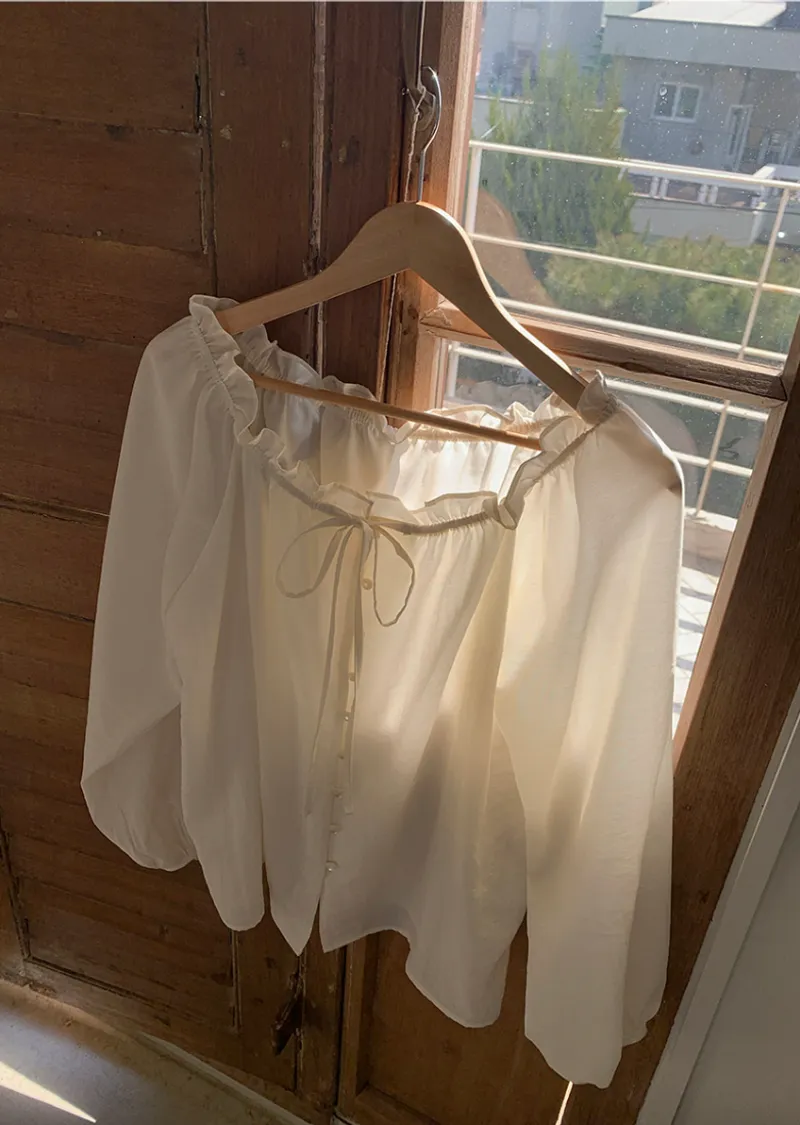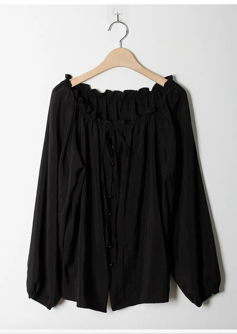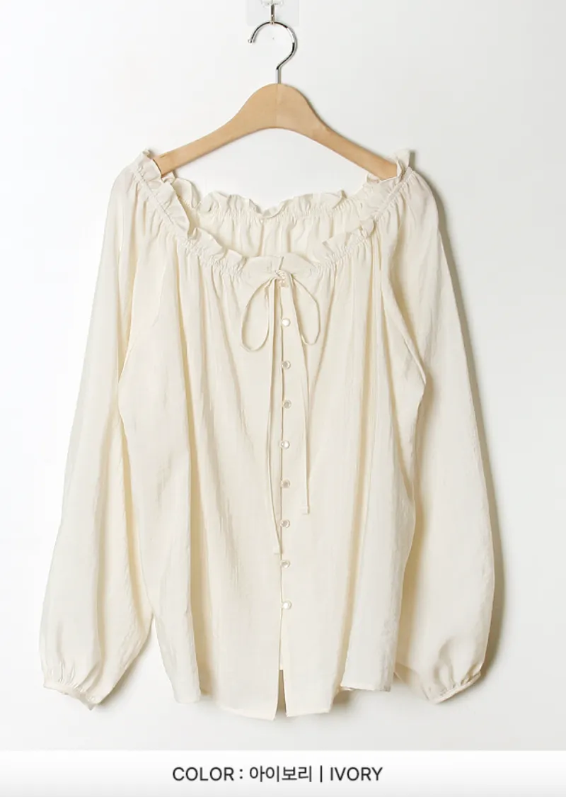 柔美氣質領口摺邊綁帶兩穿可露肩排扣上衣