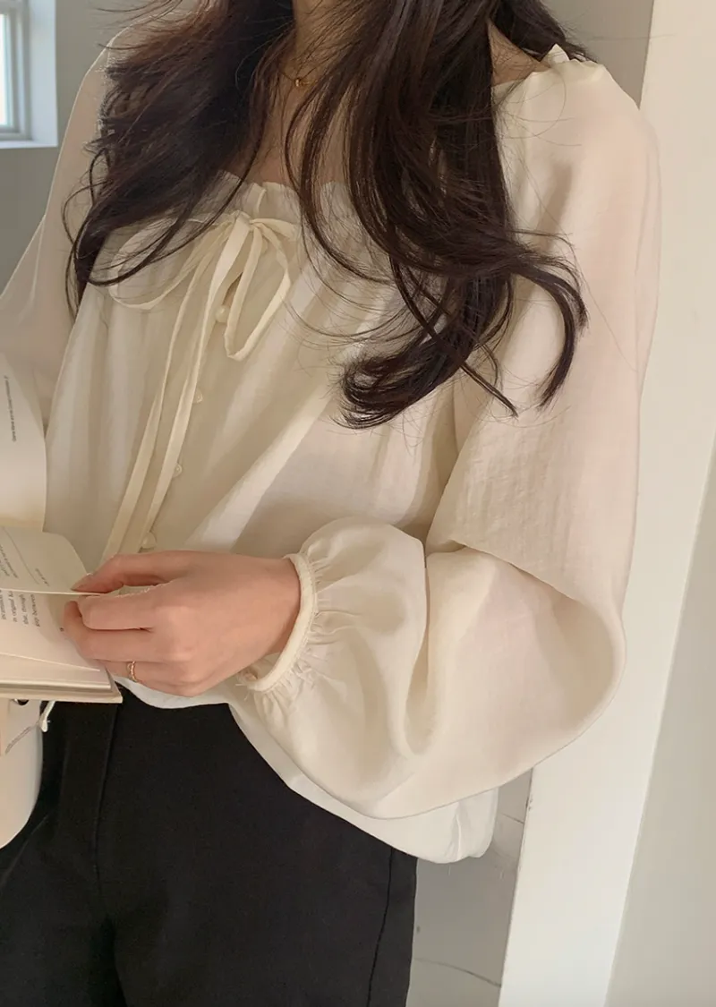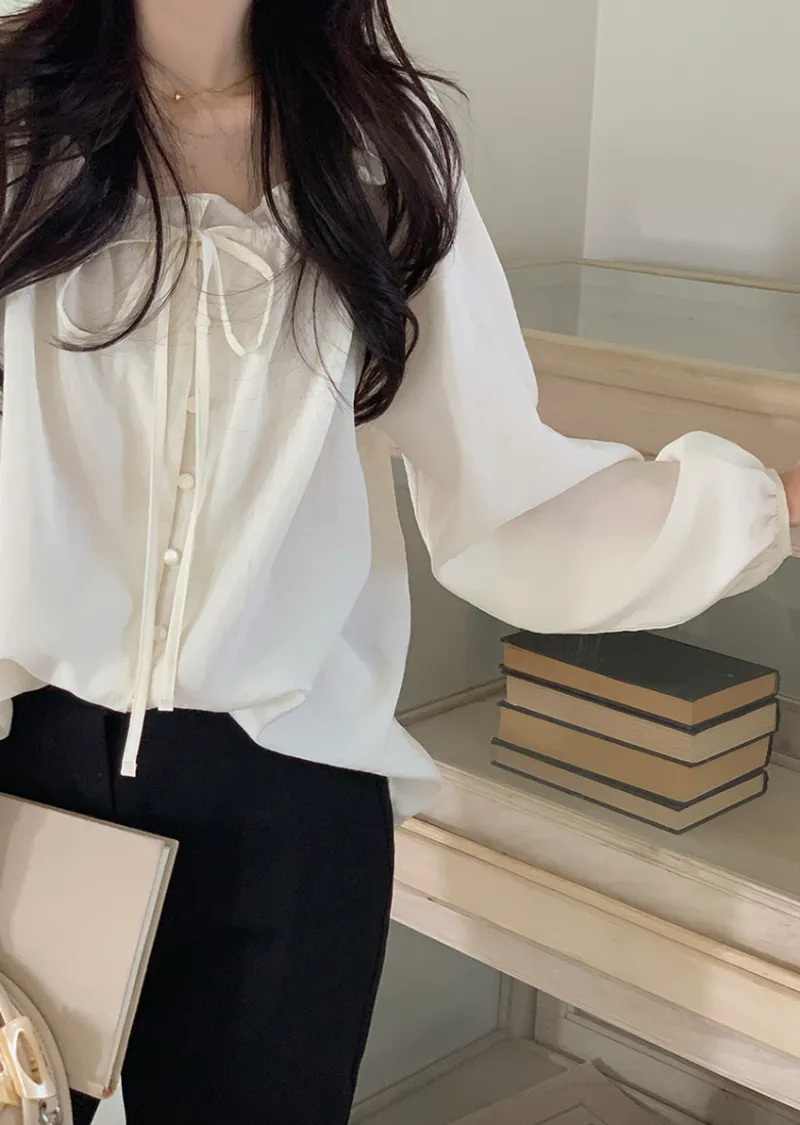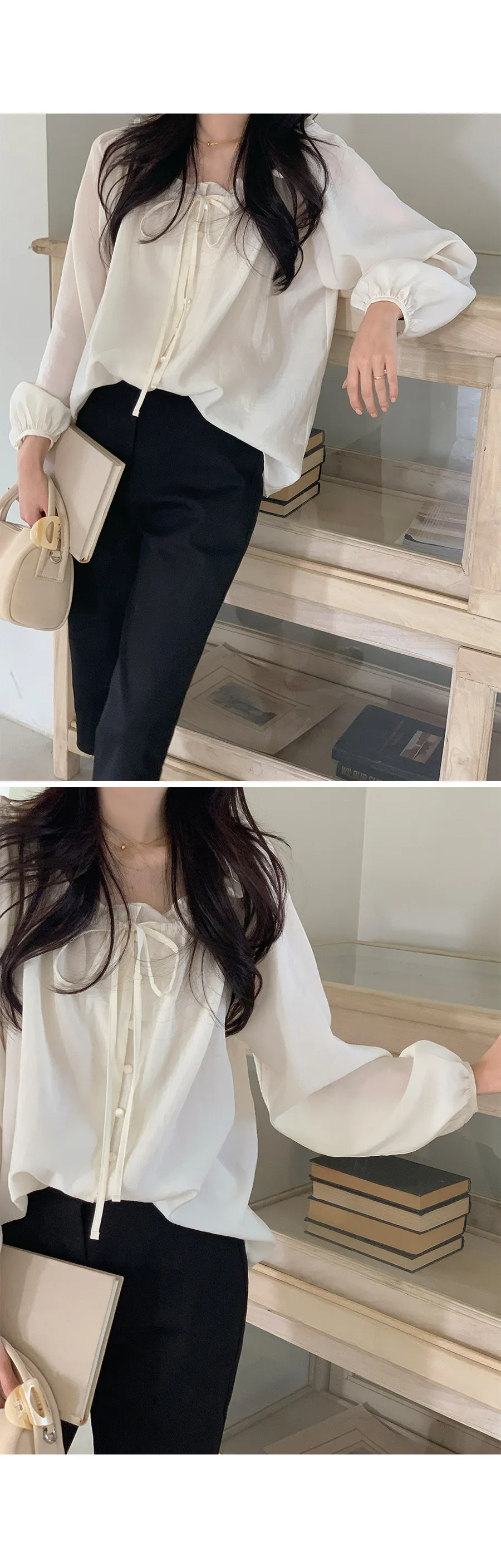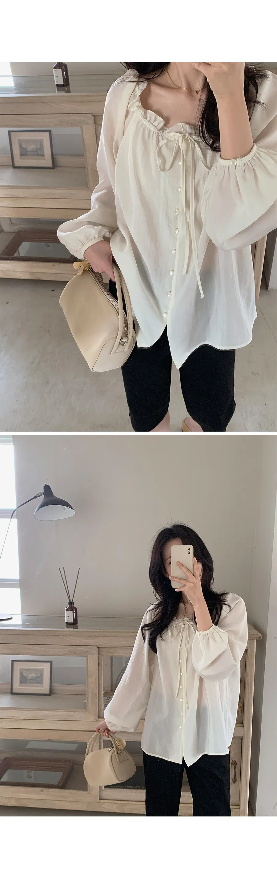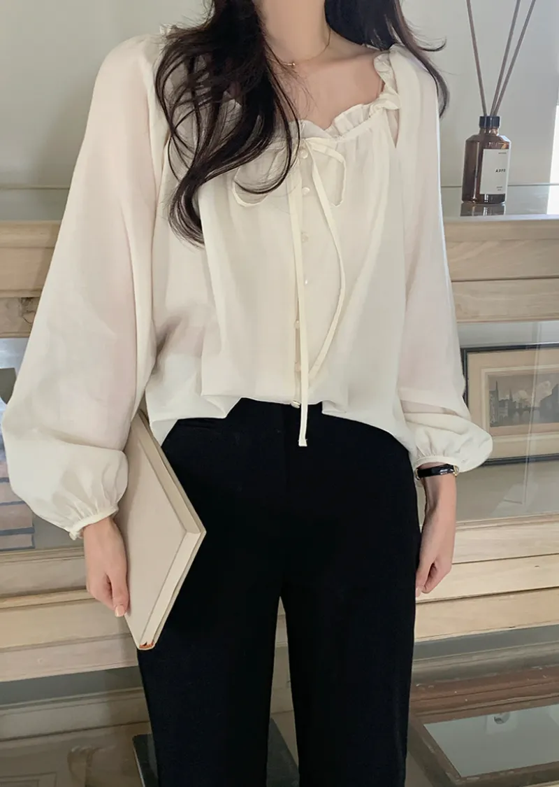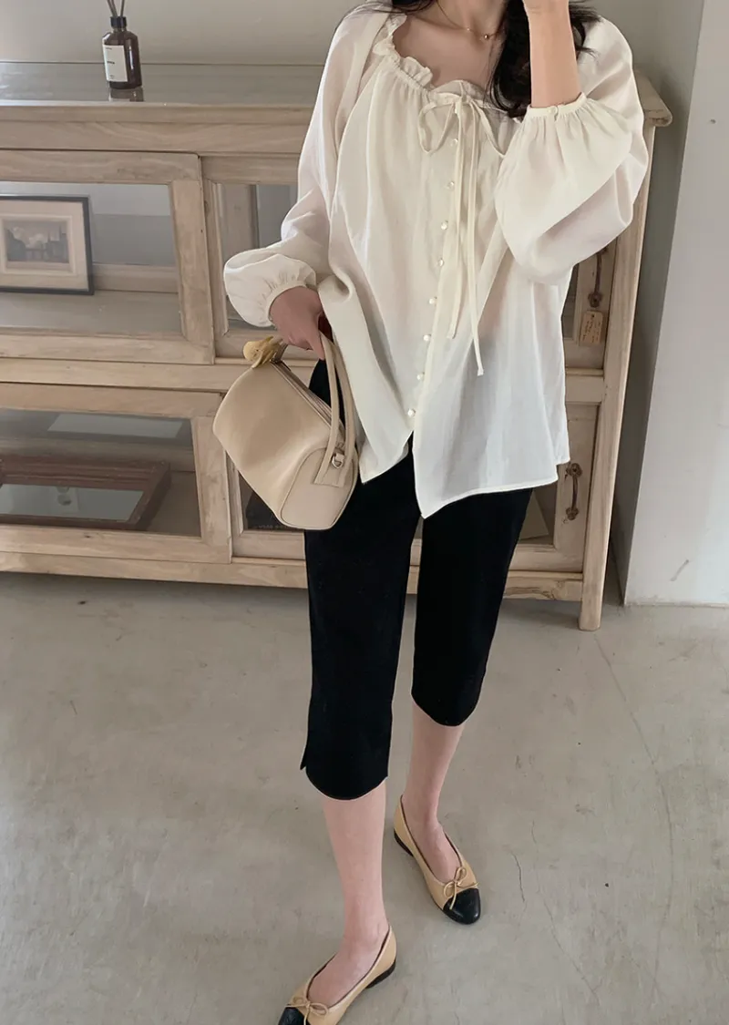 柔美氣質領口摺邊綁帶兩穿可露肩排扣上衣