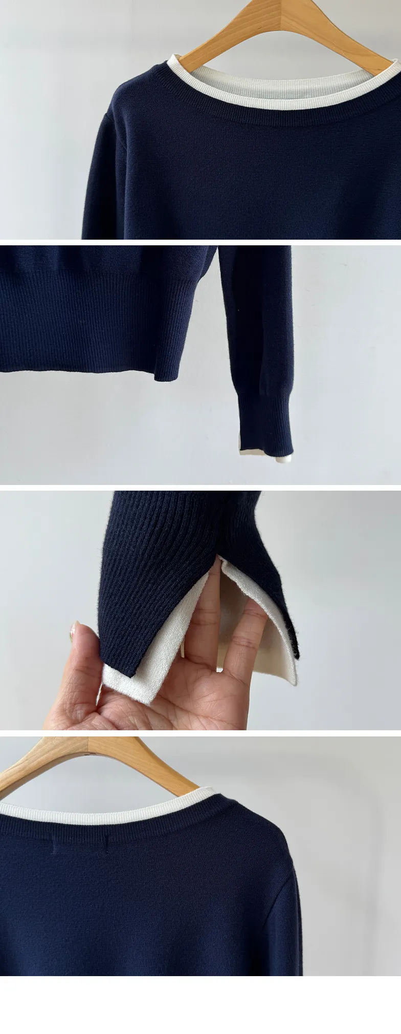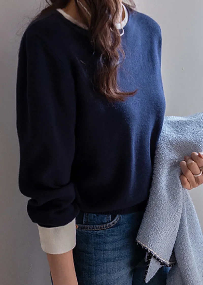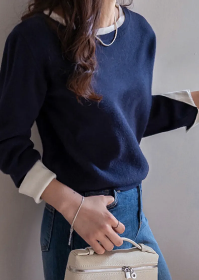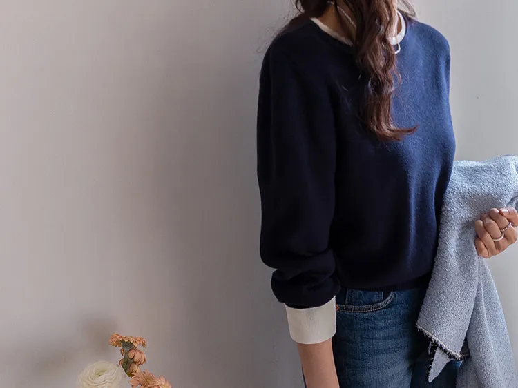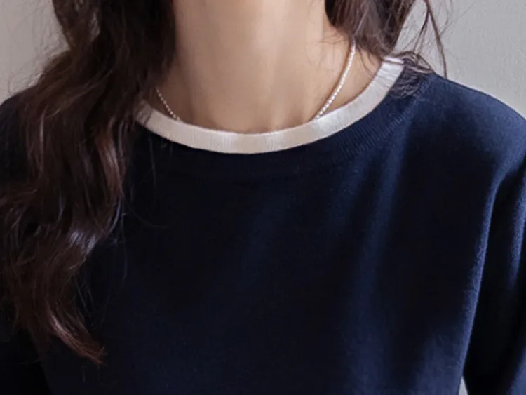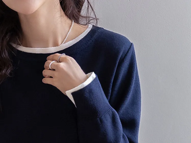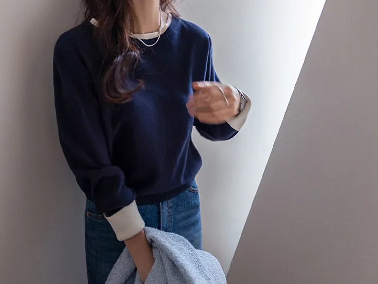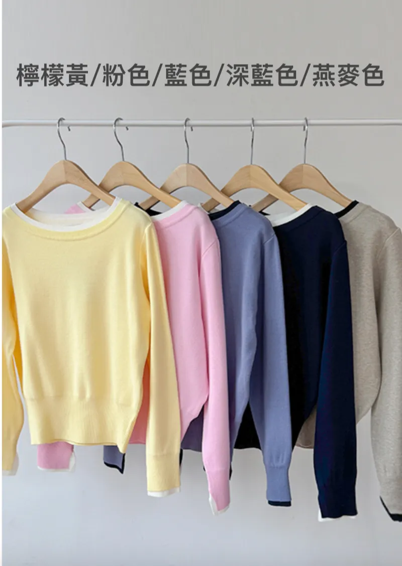 【船領設計,打造精緻領口線條】【領口與袖口雙色拼接細節,展現優雅氣質】【無論捲起袖子還是放下袖子,色彩搭配都非常漂亮】【簡潔精緻的日常針織衫】
