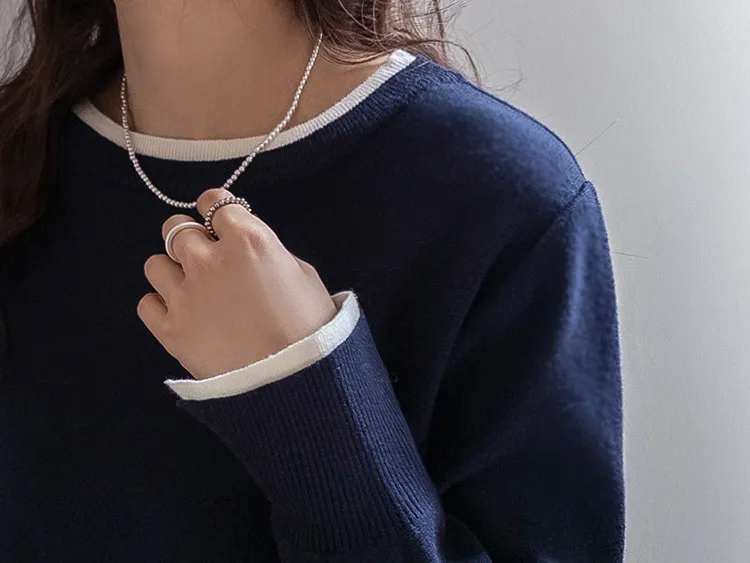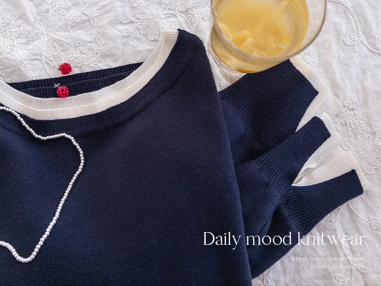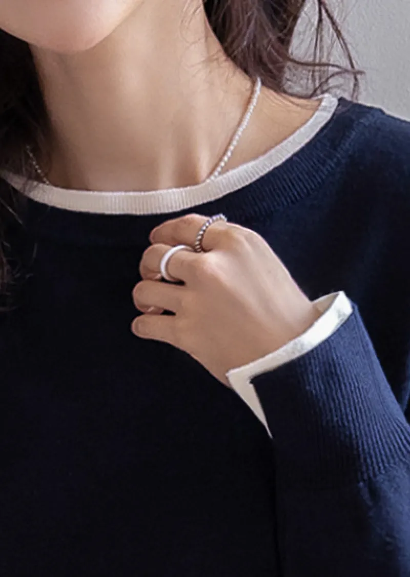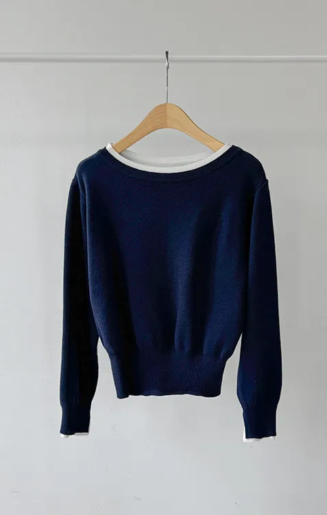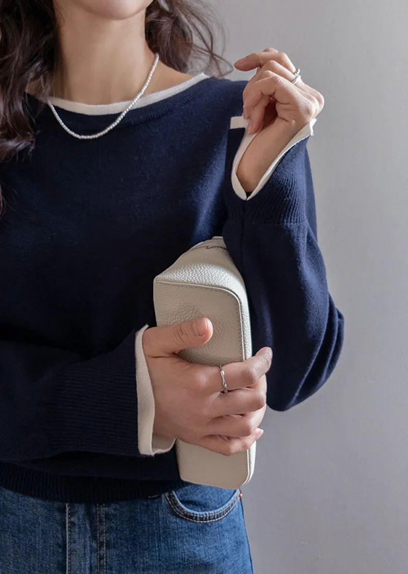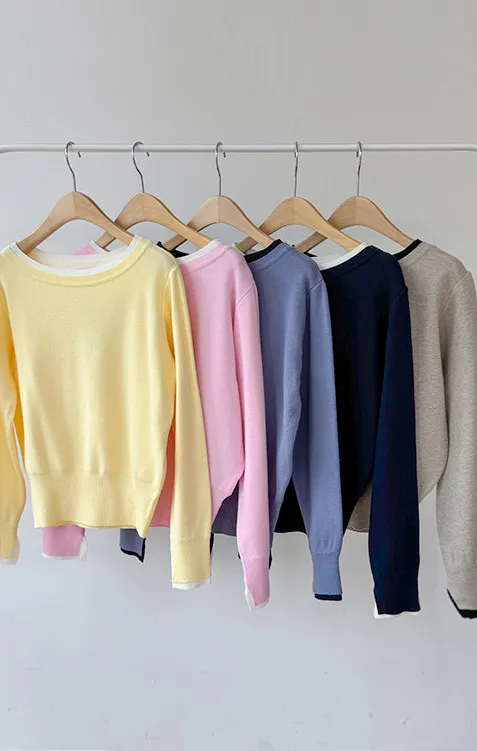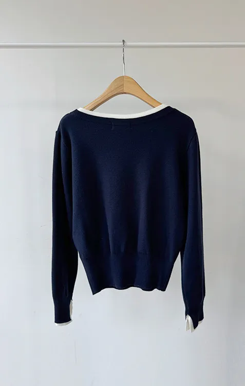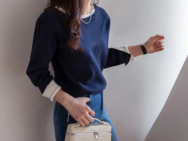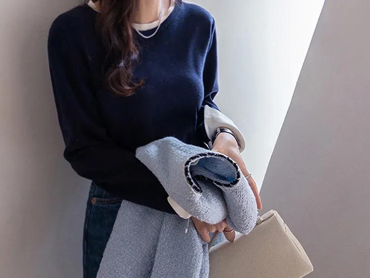 【船領設計,打造精緻領口線條】【領口與袖口雙色拼接細節,展現優雅氣質】【無論捲起袖子還是放下袖子,色彩搭配都非常漂亮】【簡潔精緻的日常針織衫】