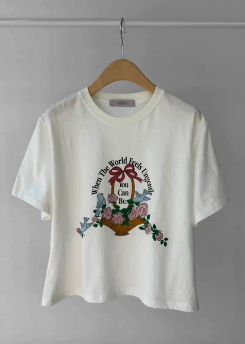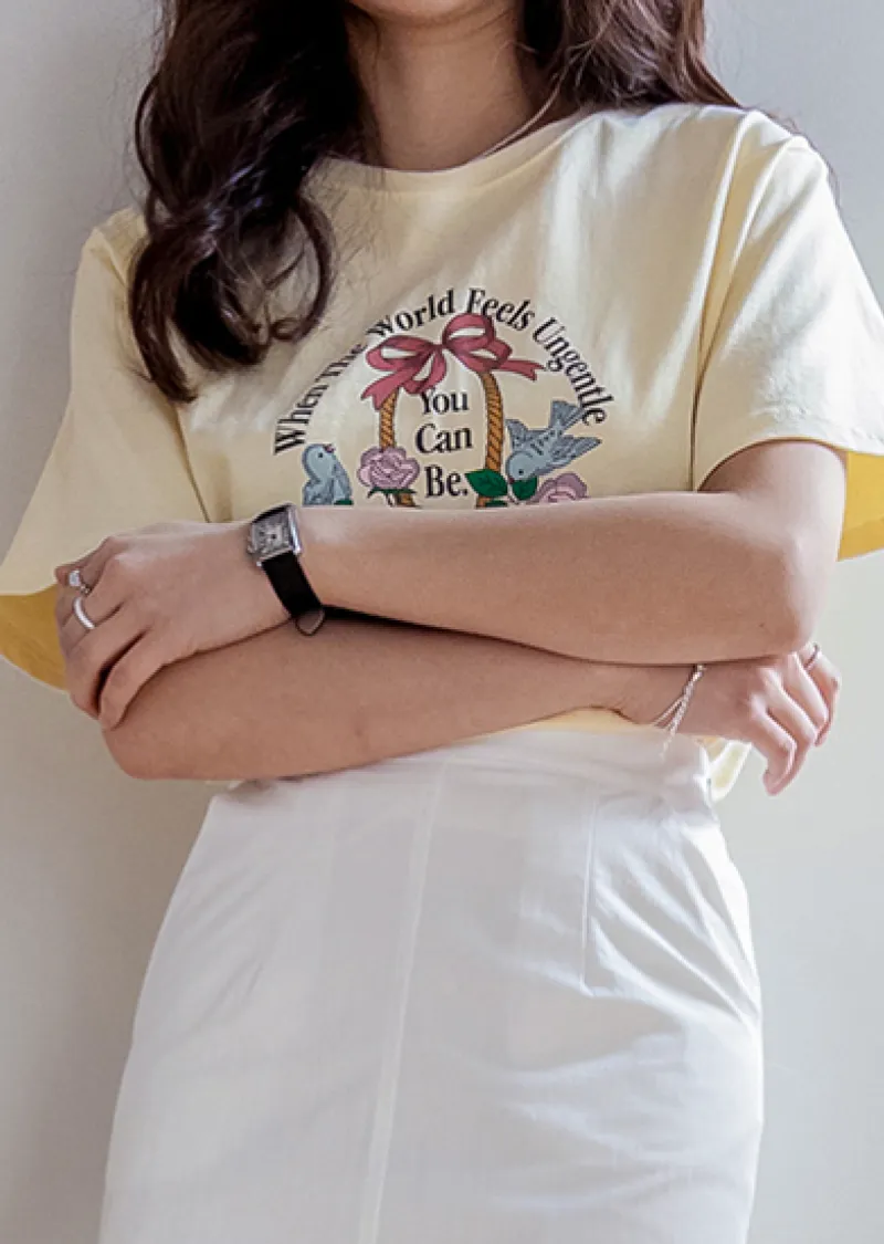 明亮色彩花朵鳥兒印花圓領短袖上衣