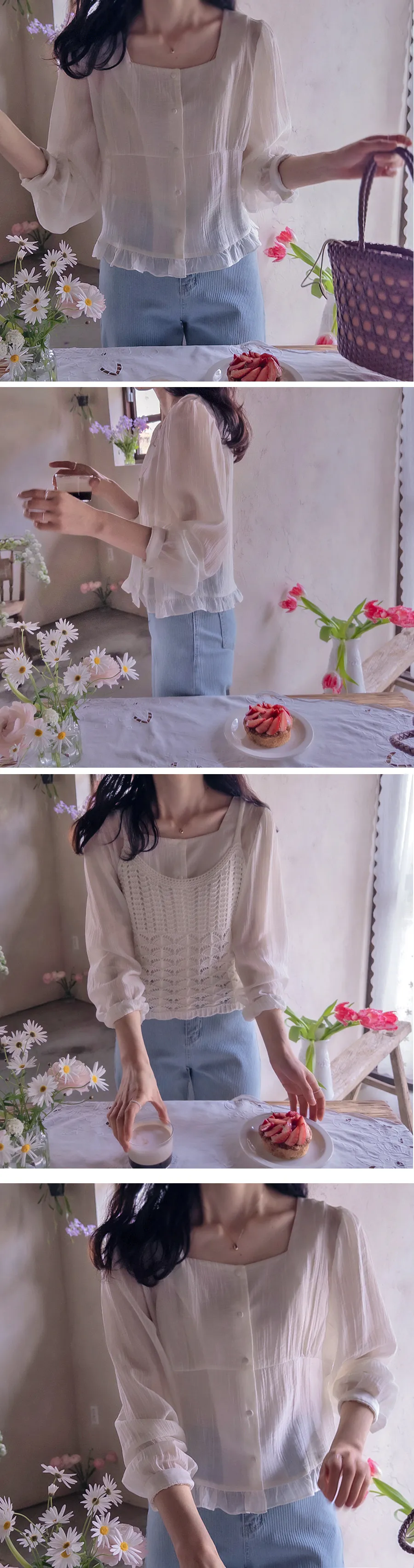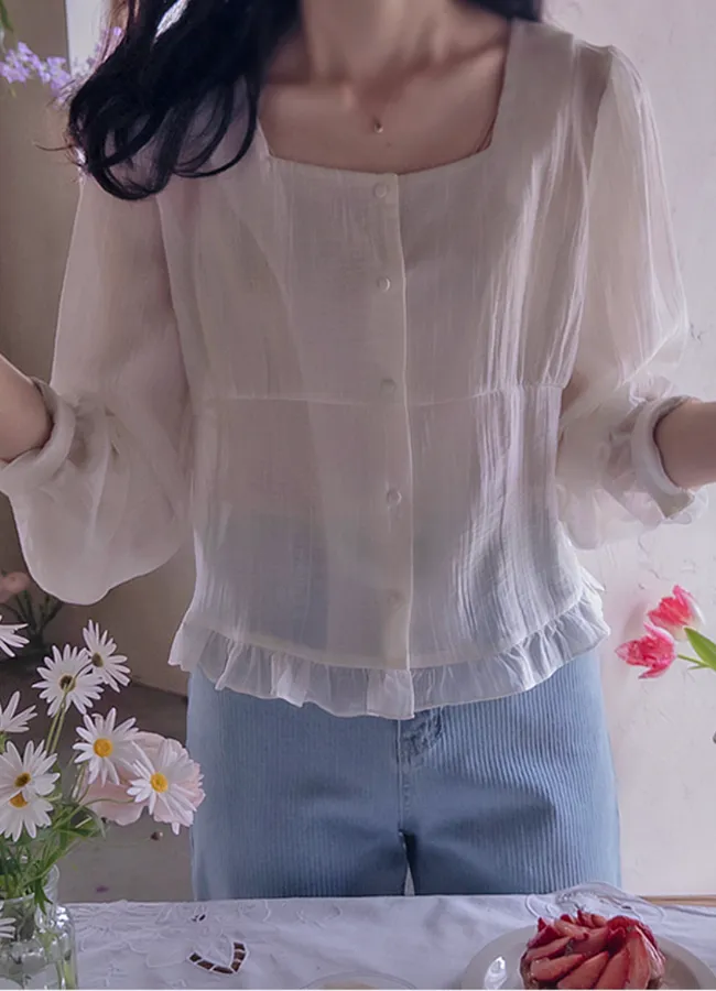 優雅方領摺邊下擺附領綁帶排扣上衣
