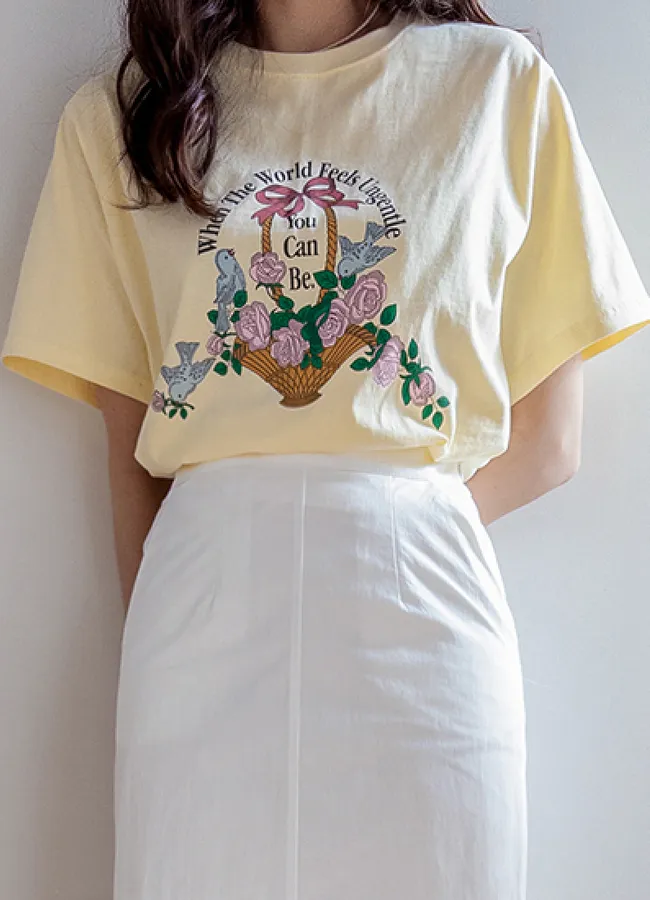 明亮色彩花朵鳥兒印花圓領短袖上衣