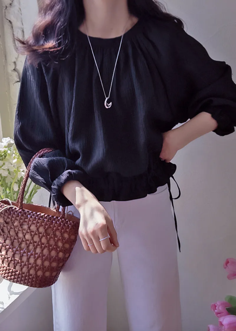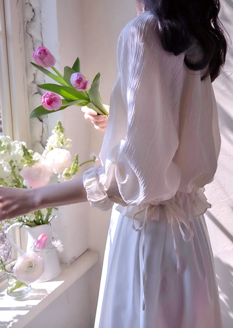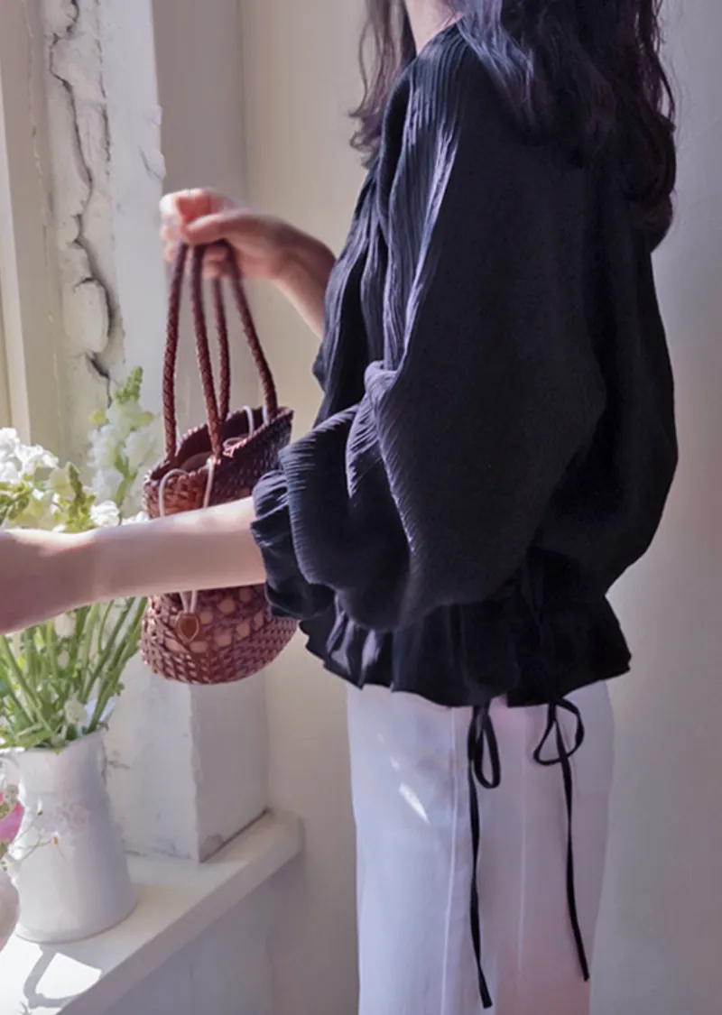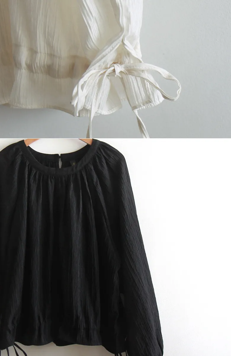 優雅氣質圓領褶皺綁帶收腰上衣