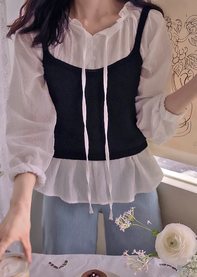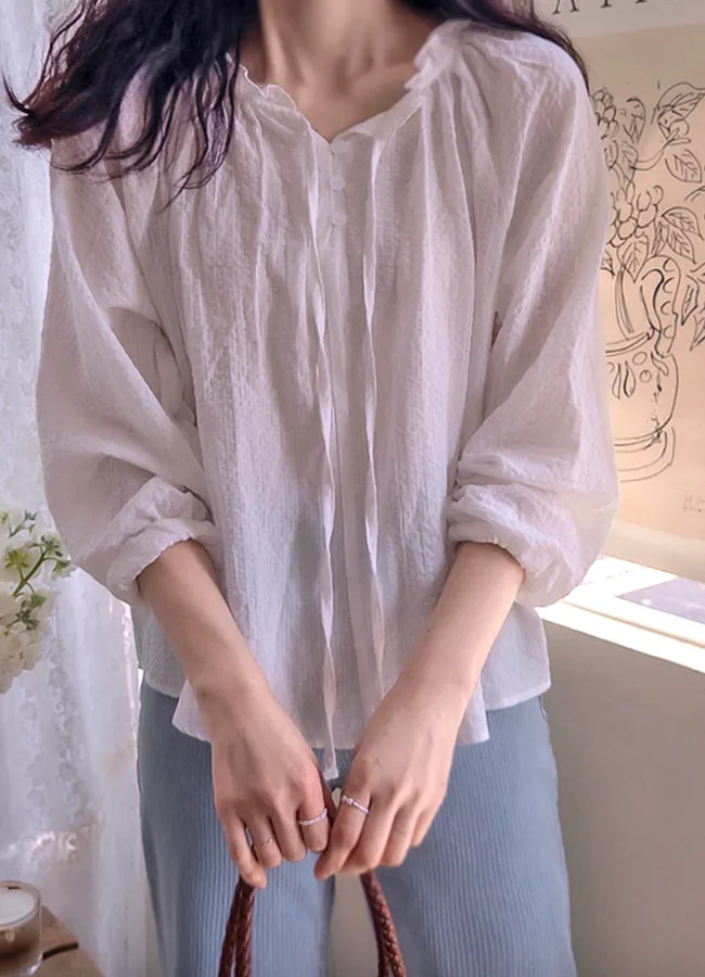 優雅領口摺邊綁帶自然剪裁摺皺上衣