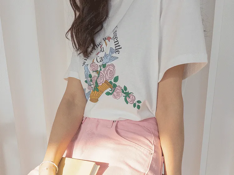 明亮色彩花朵鳥兒印花圓領短袖上衣