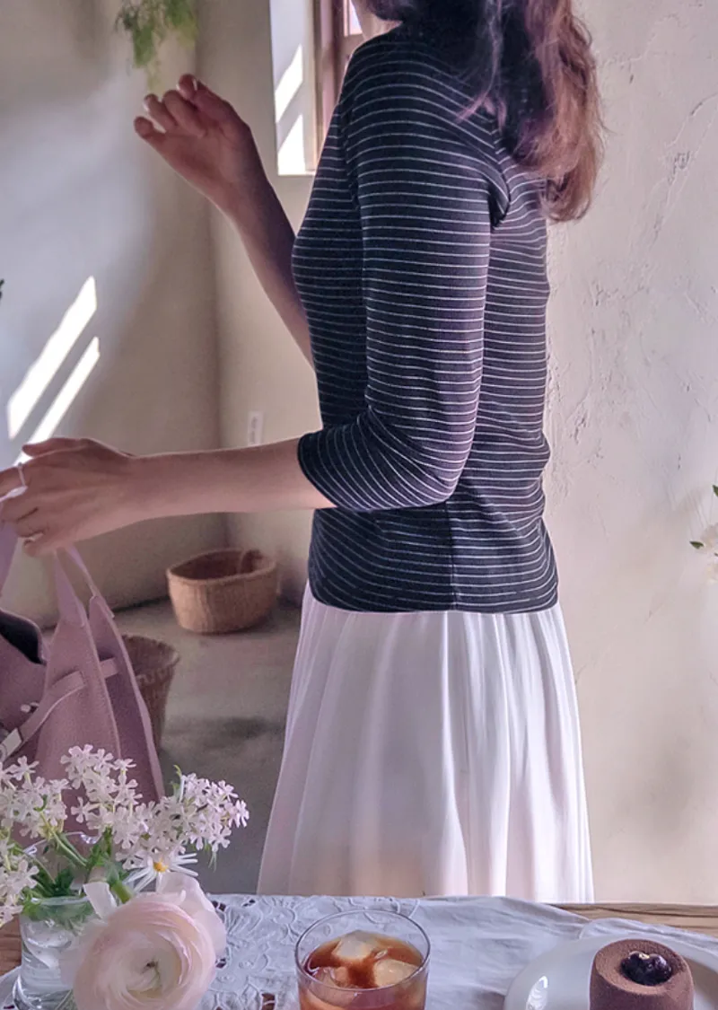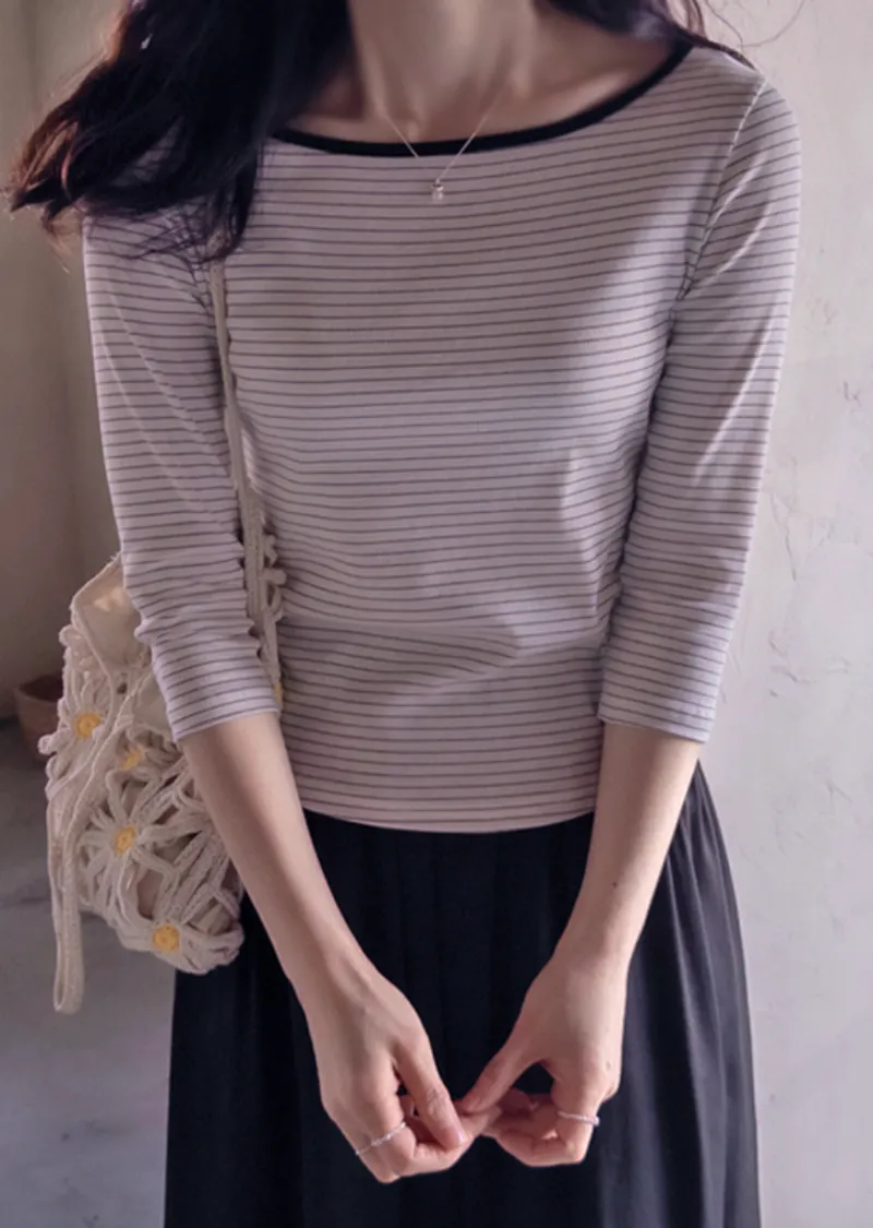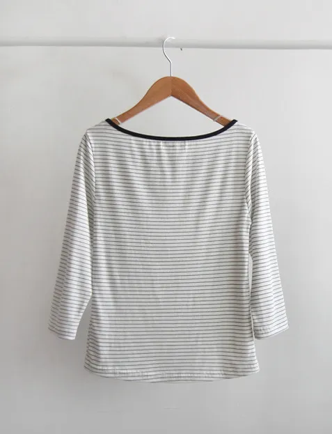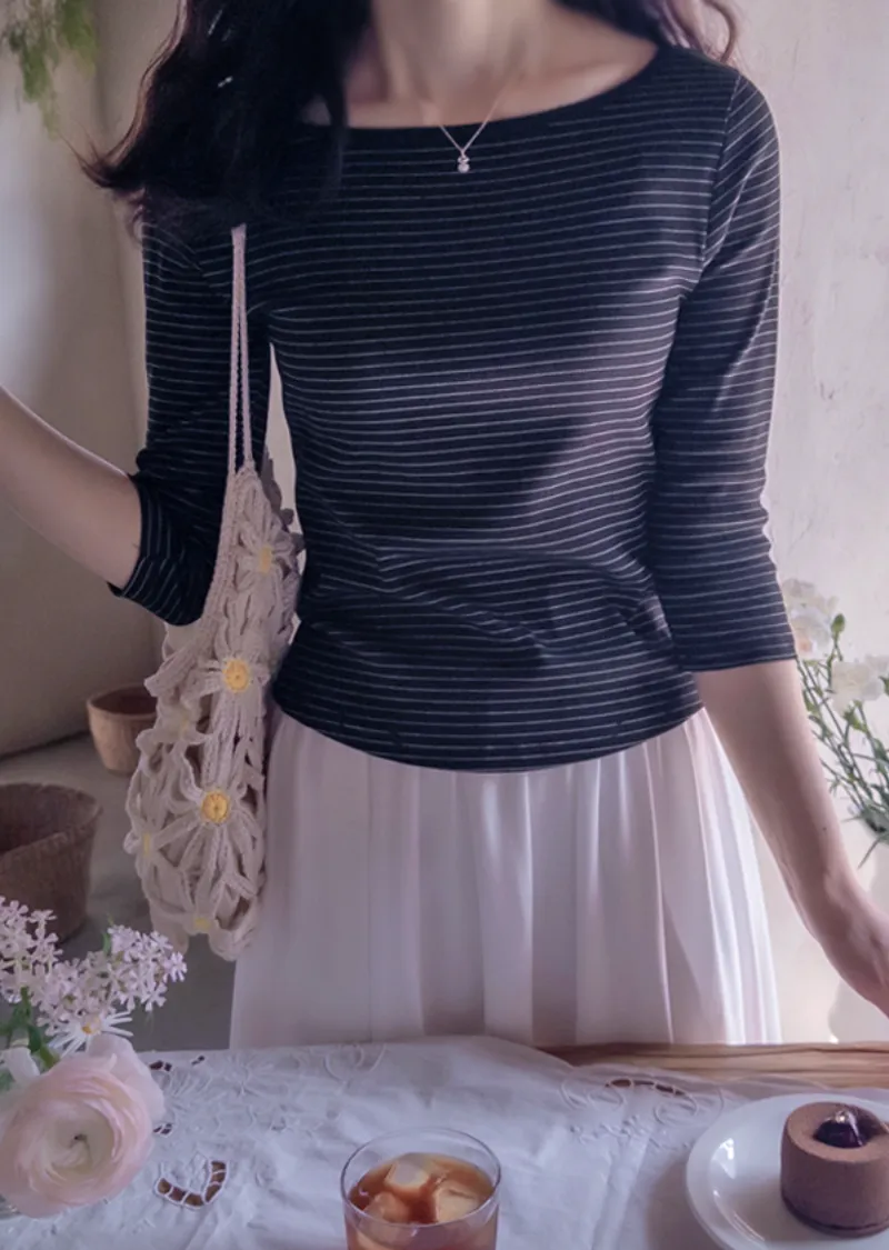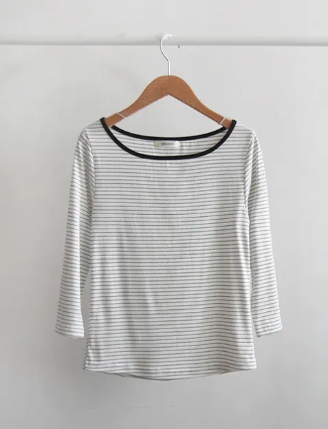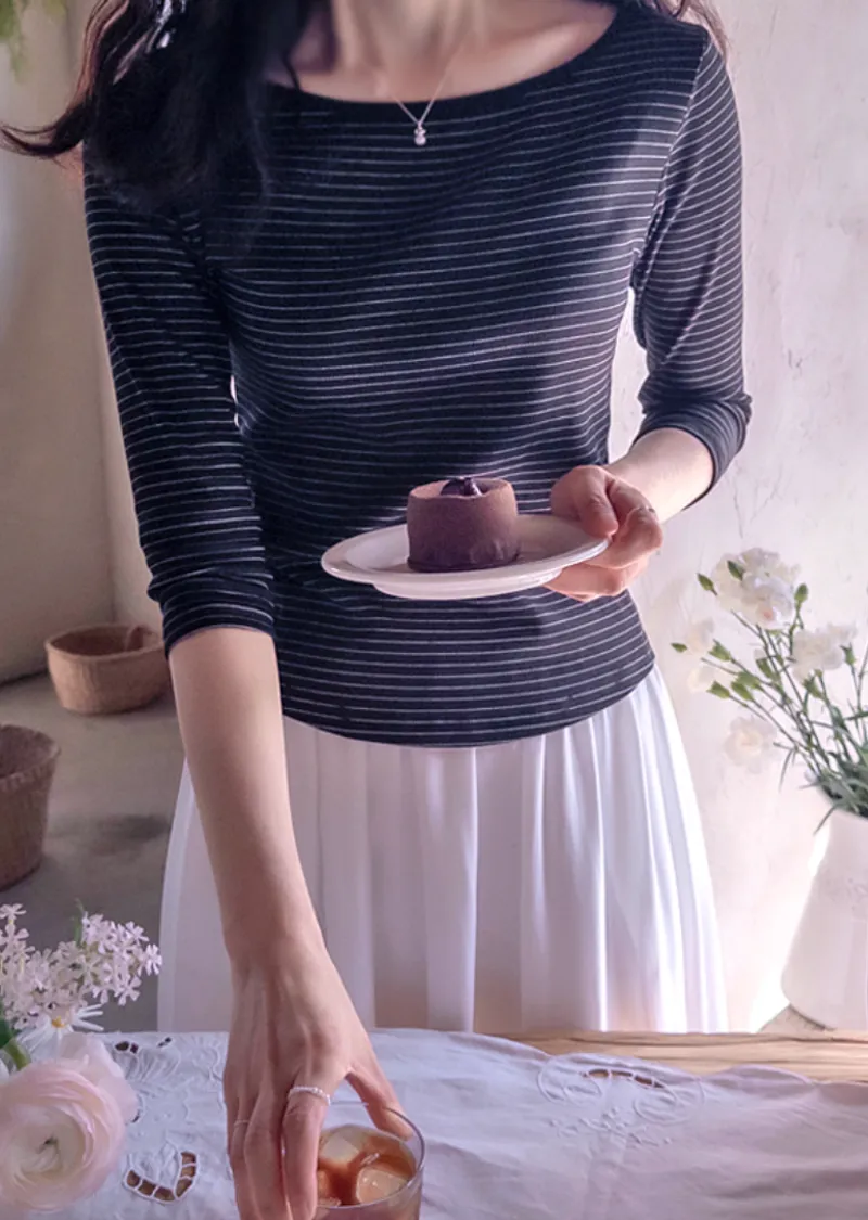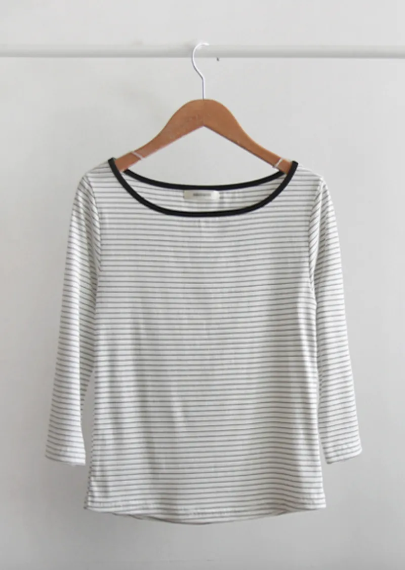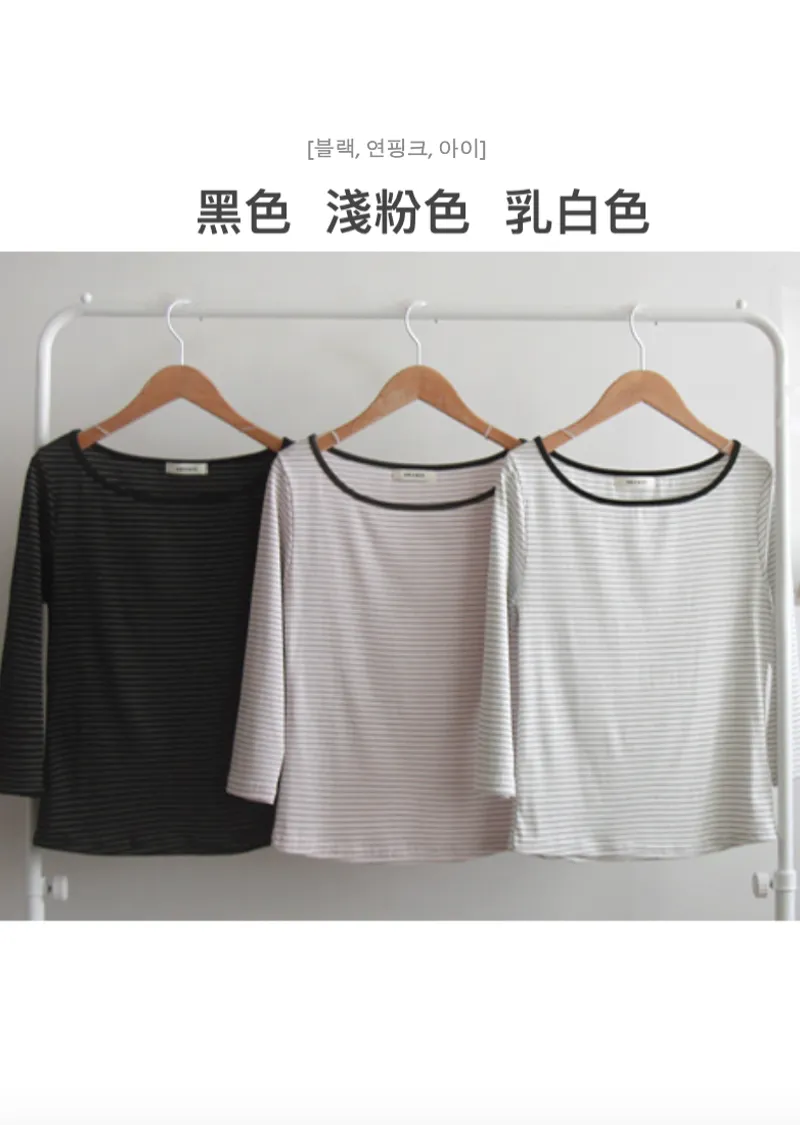 修身剪裁配色領口線條舒適彈性條紋上衣