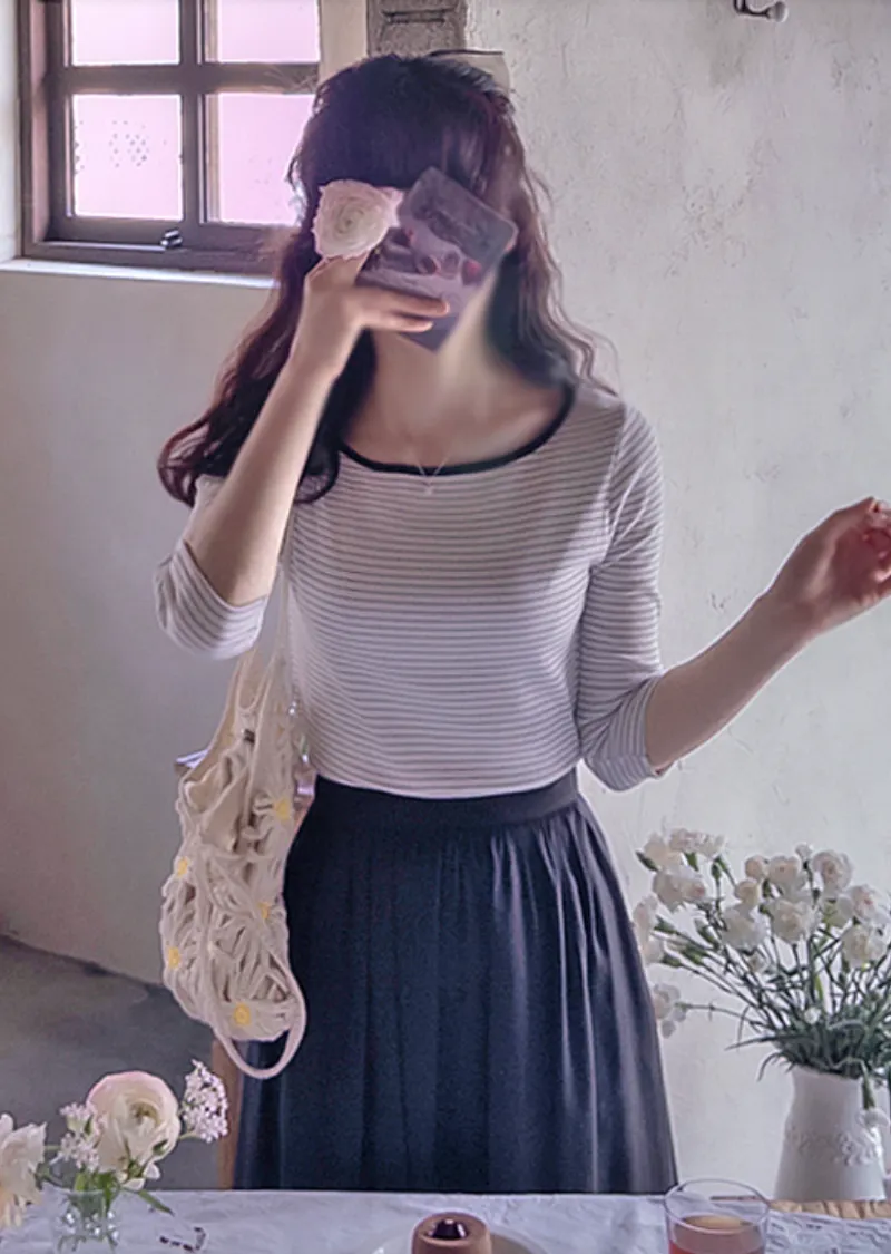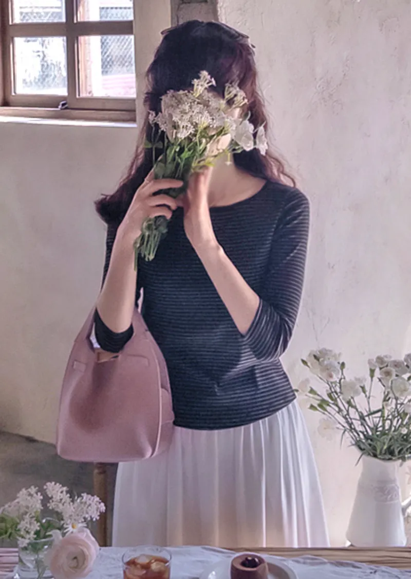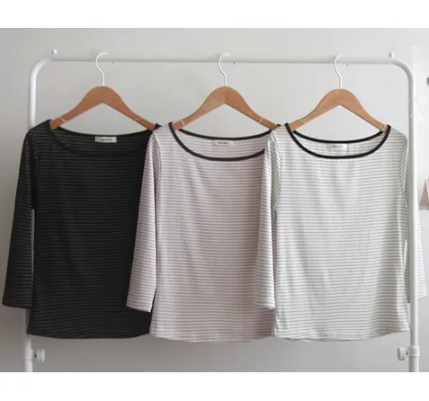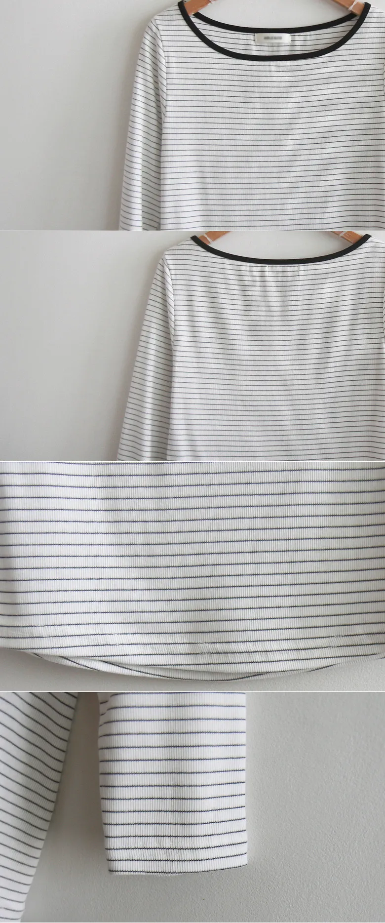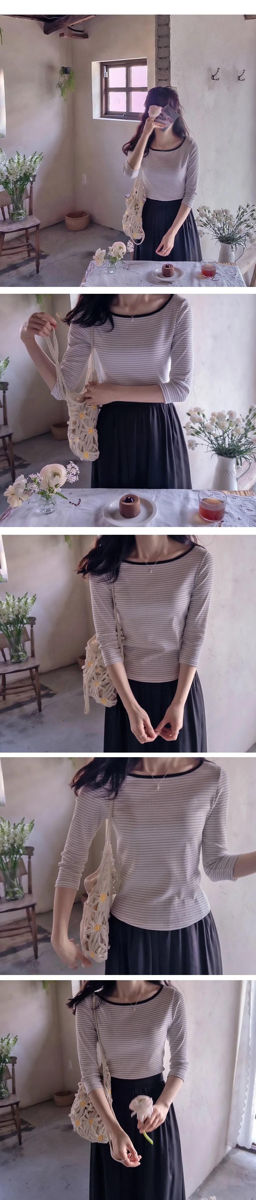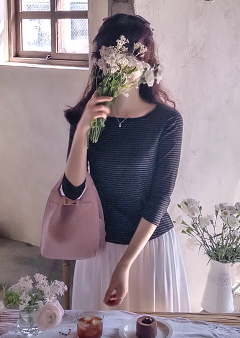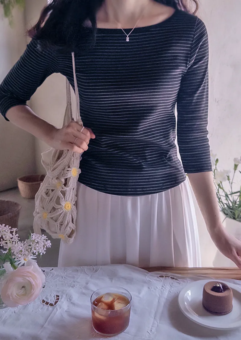 修身剪裁配色領口線條舒適彈性條紋上衣
