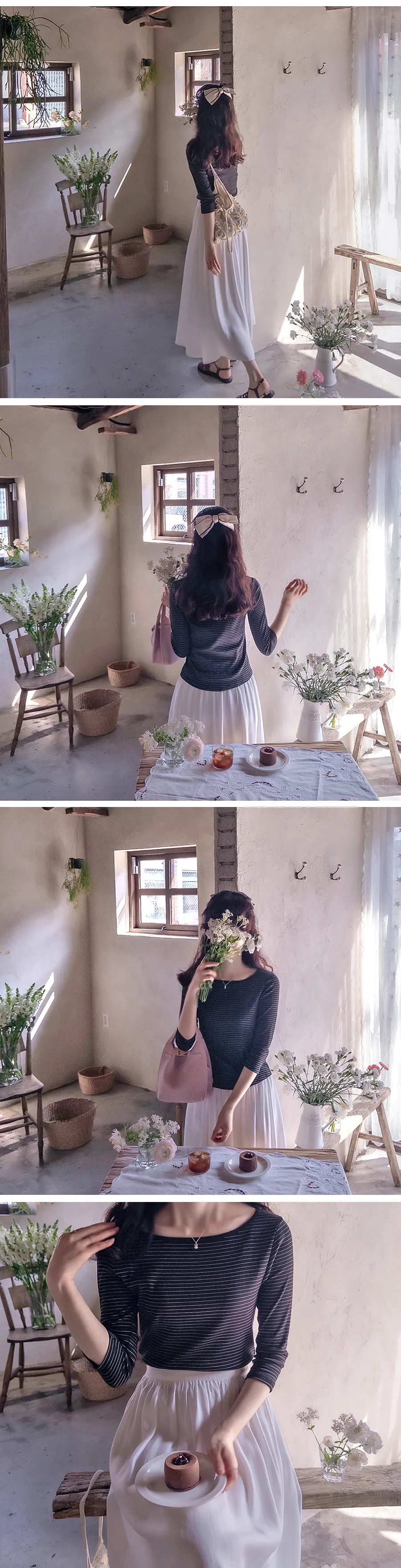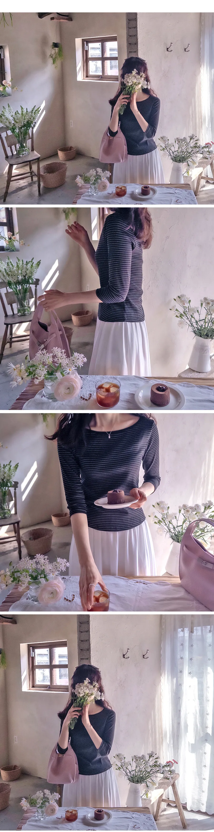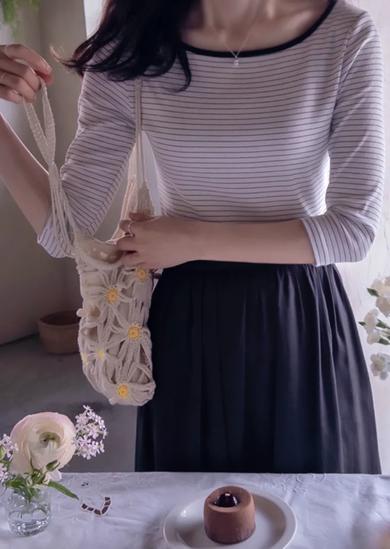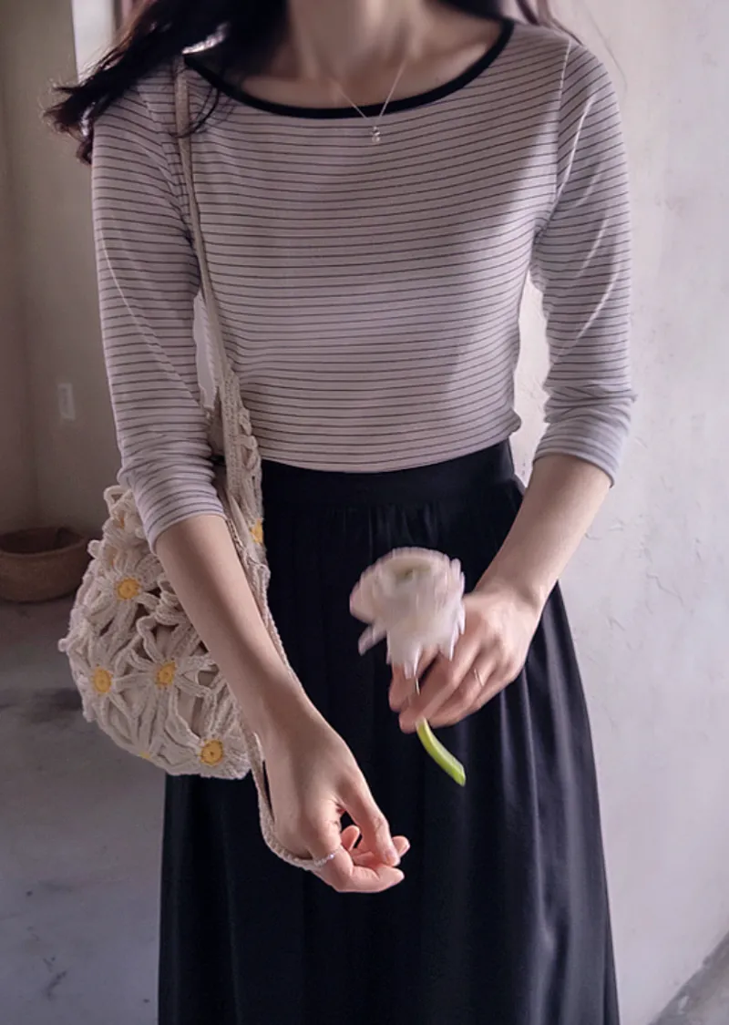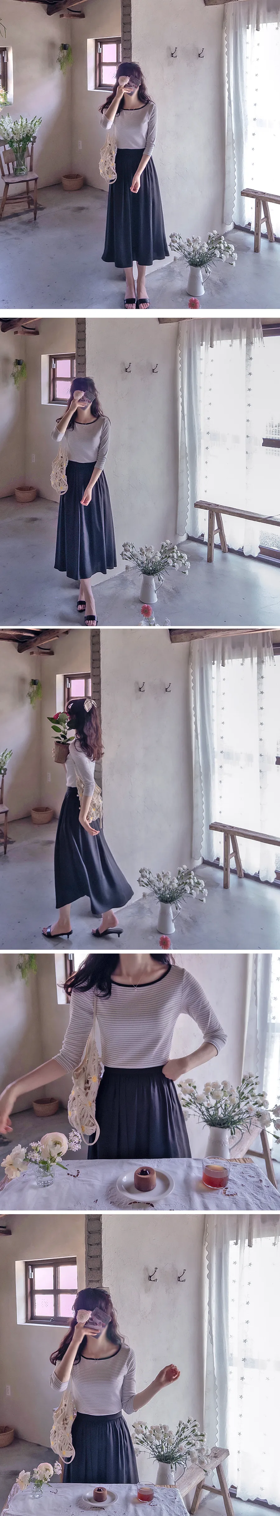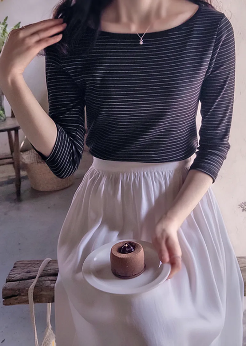 修身剪裁配色領口線條舒適彈性條紋上衣
