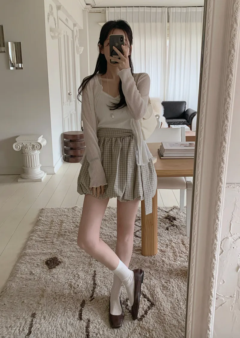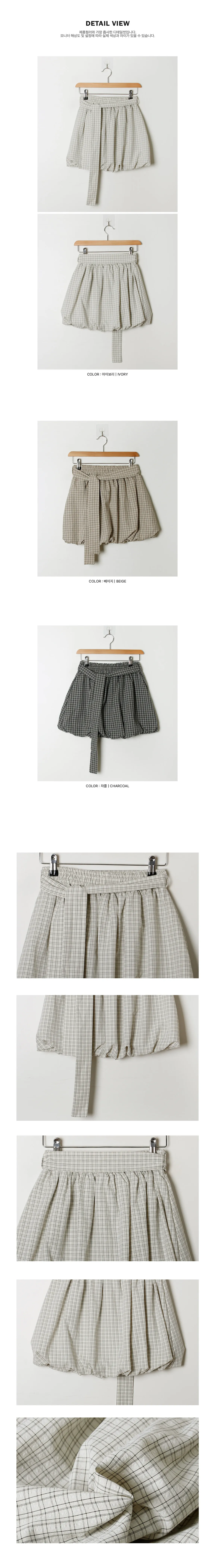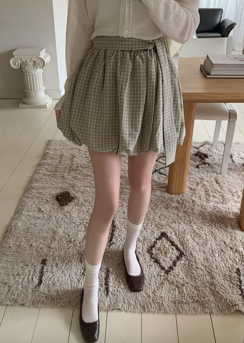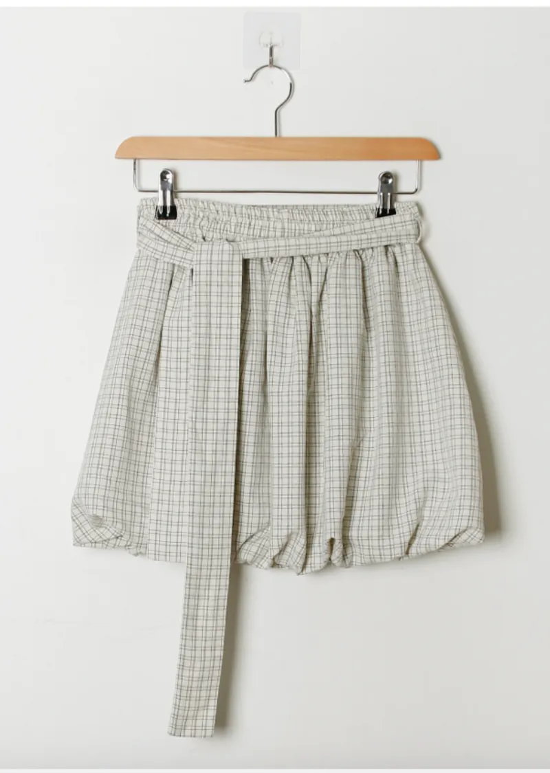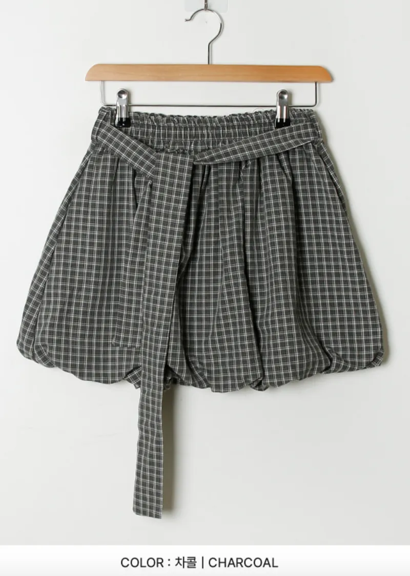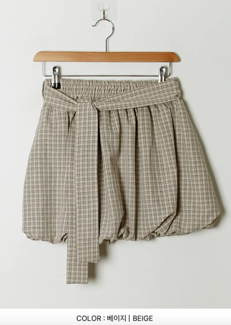 活潑休閒氣息燈籠式垂墜綁帶設計格紋短裙