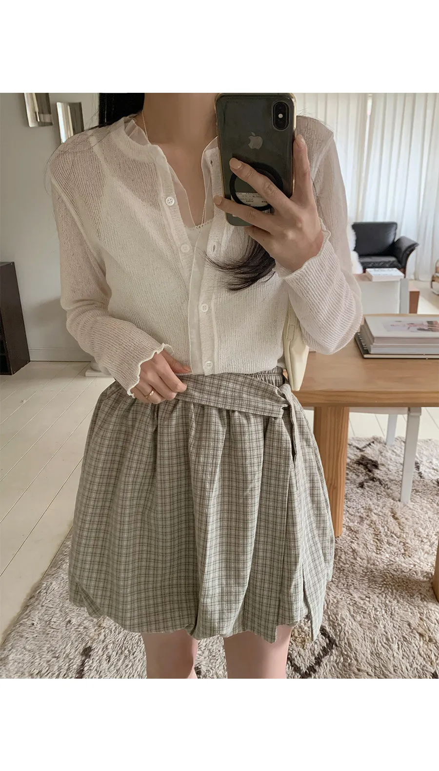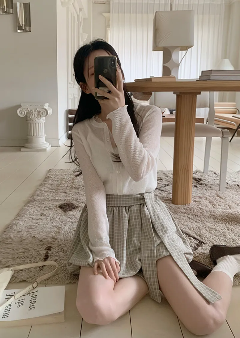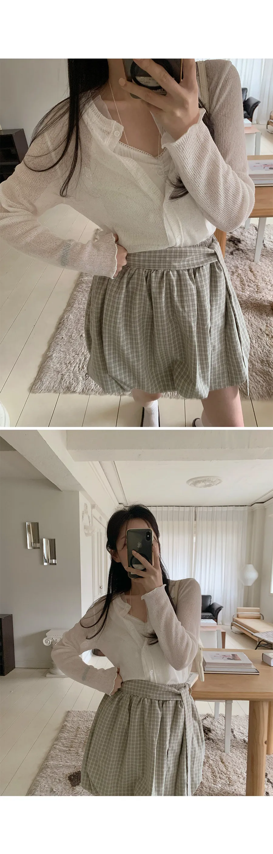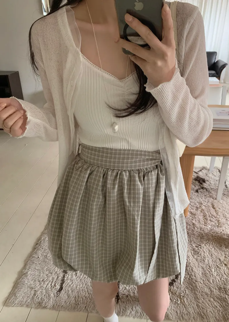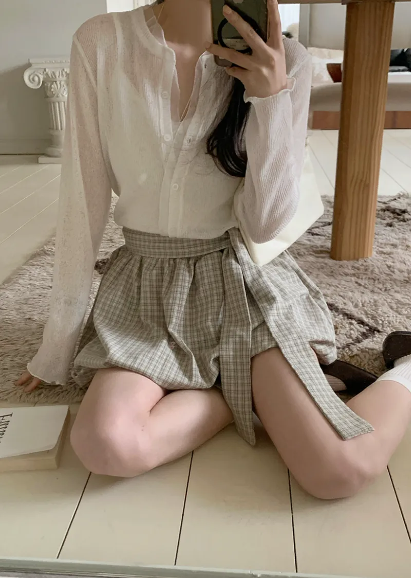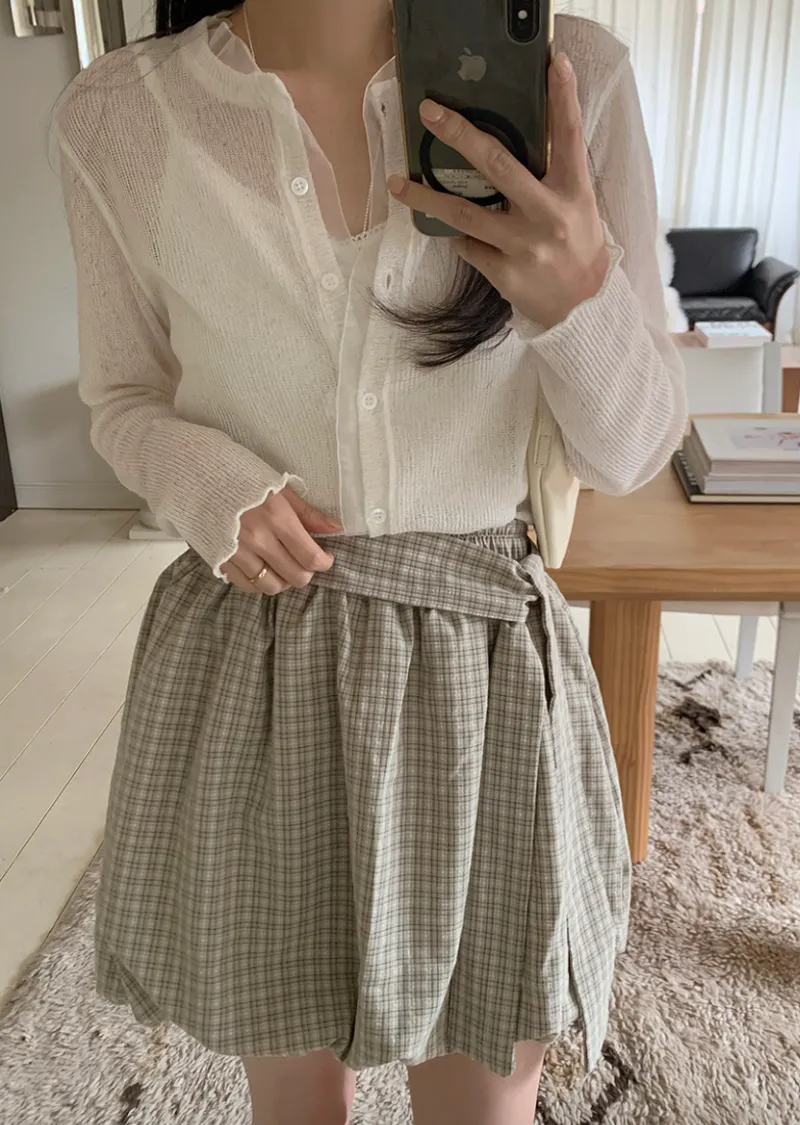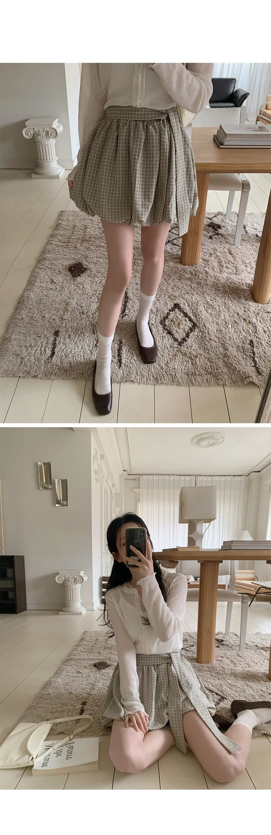 活潑休閒氣息燈籠式垂墜綁帶設計格紋短裙