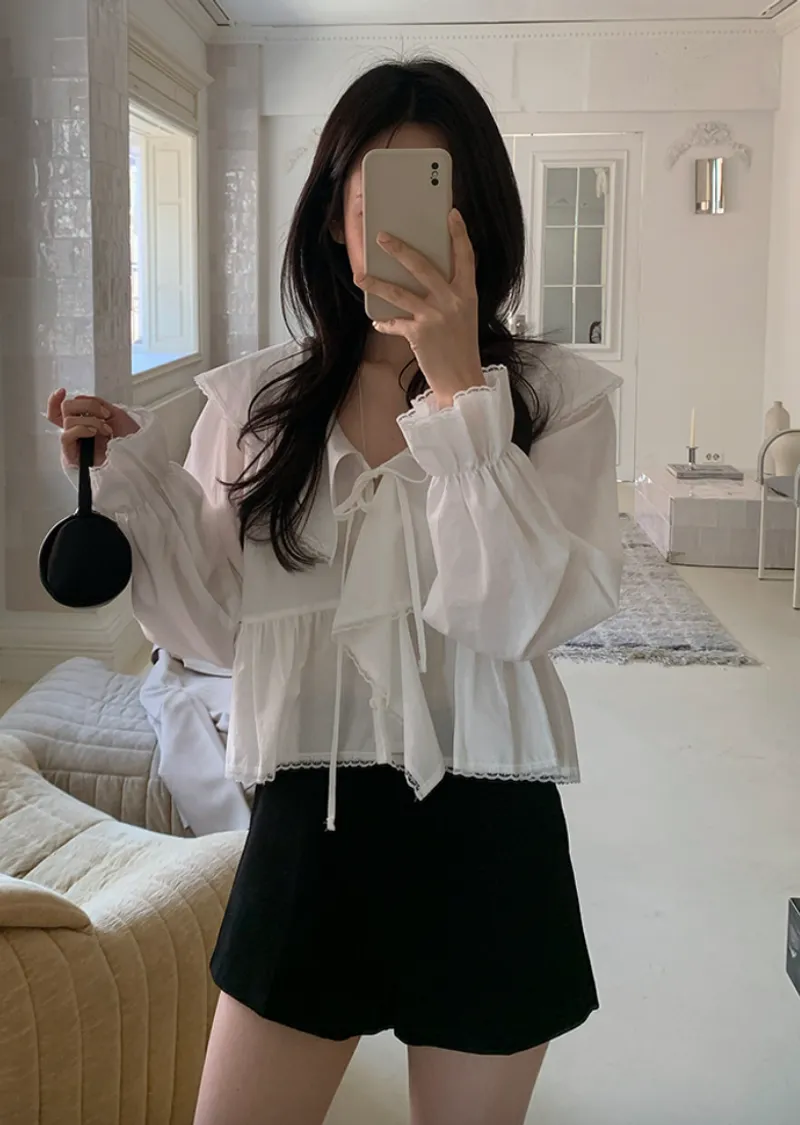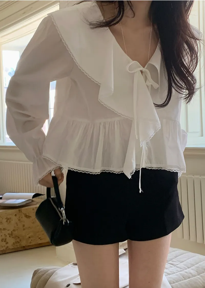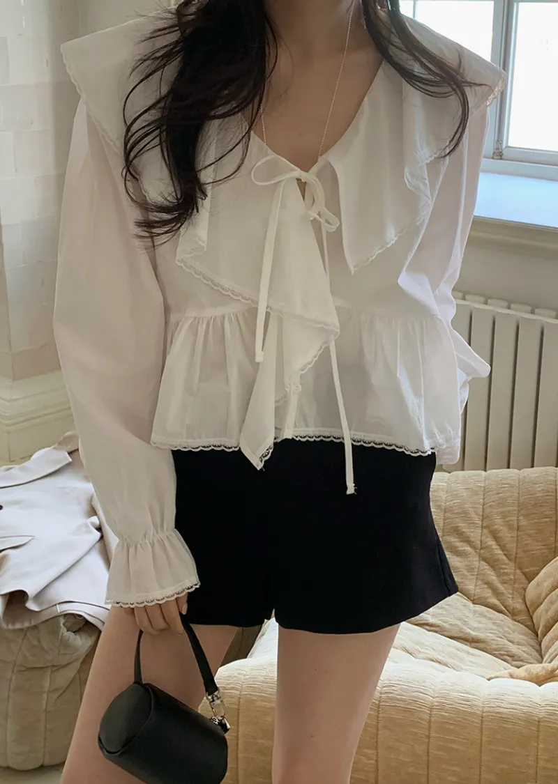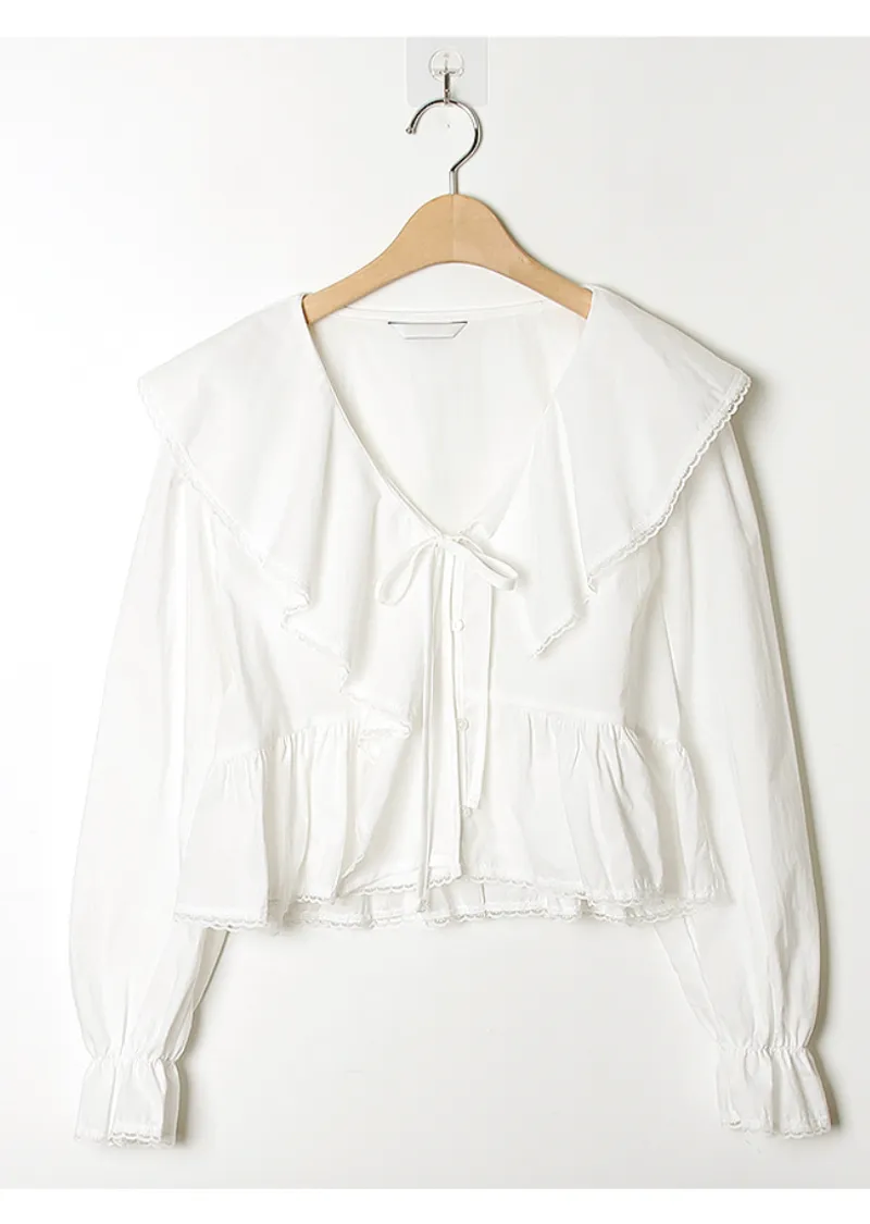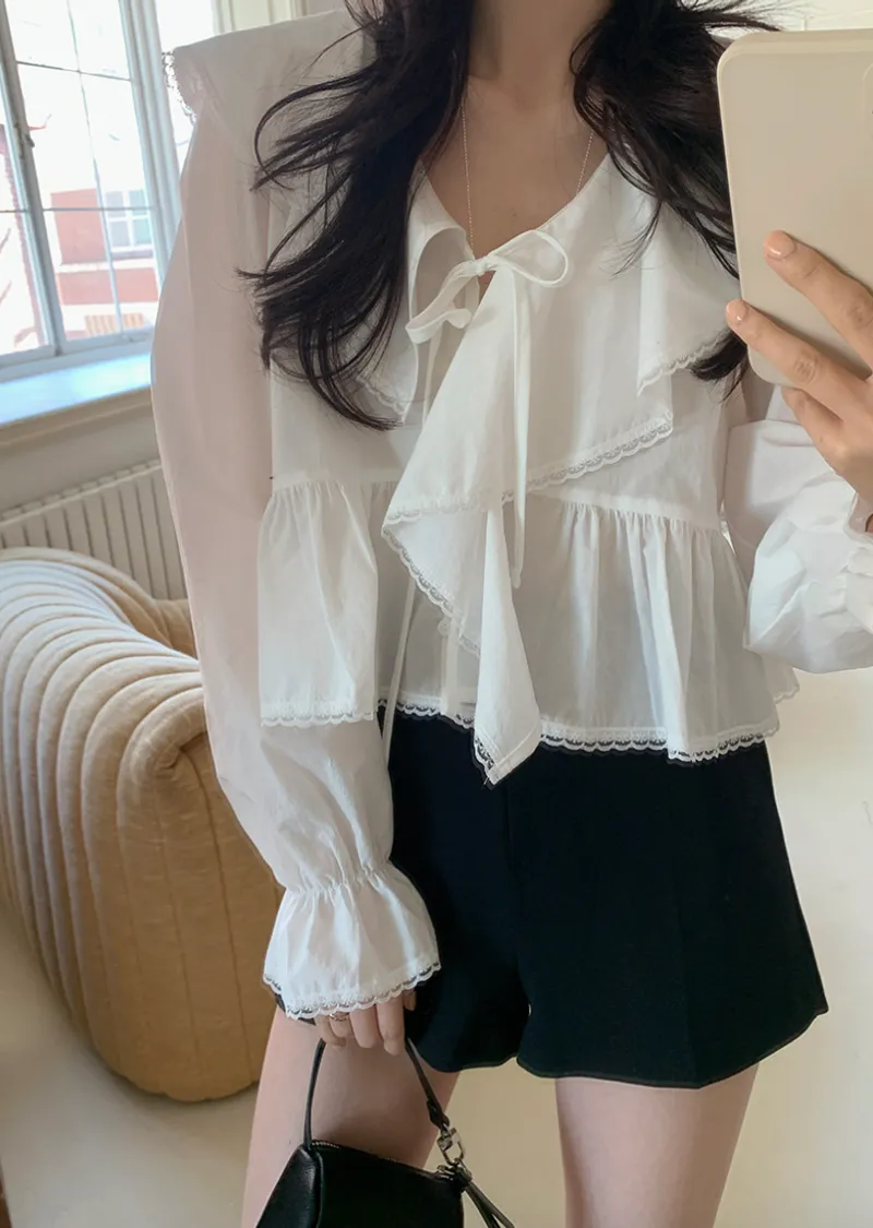 柔美垂墜荷葉邊領綁帶傘擺廓形蕾絲收邊排扣上衣