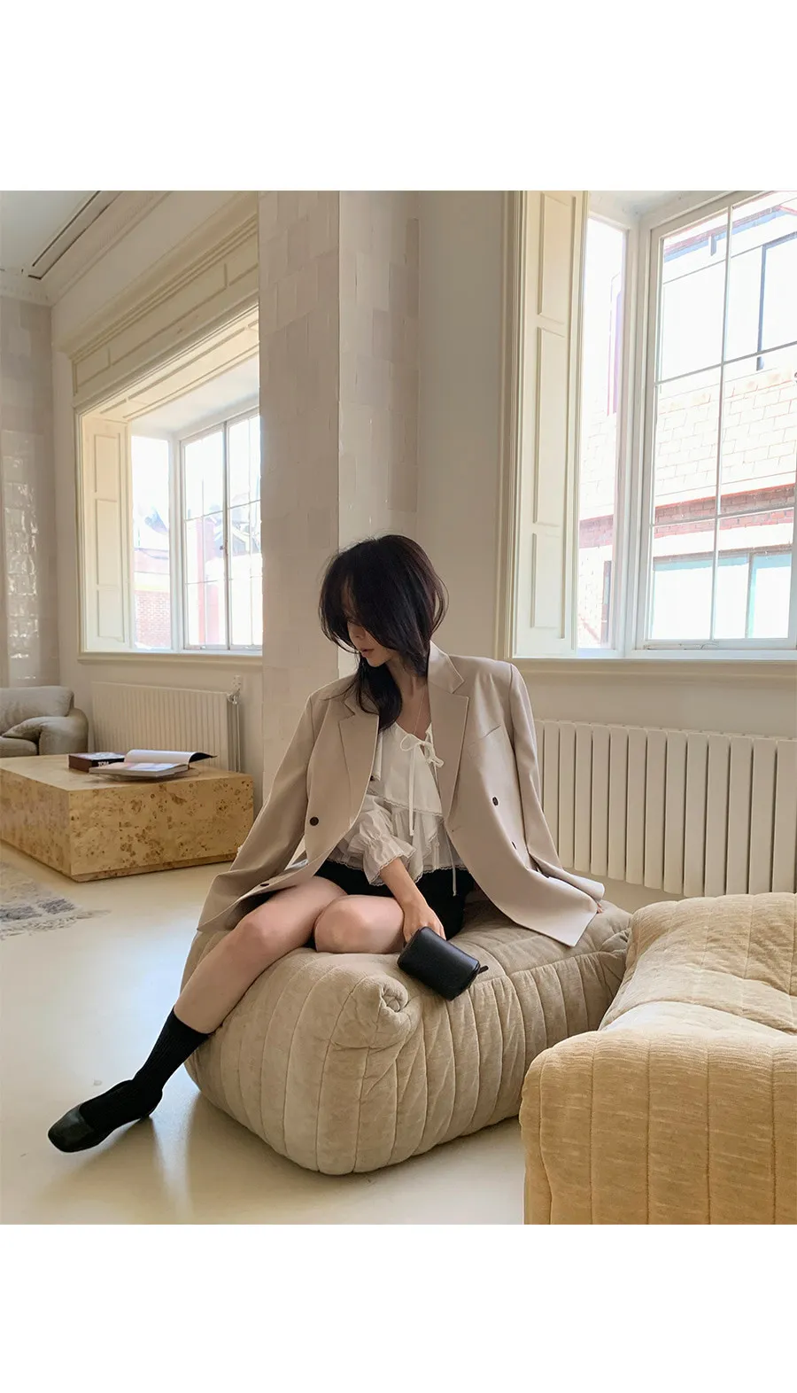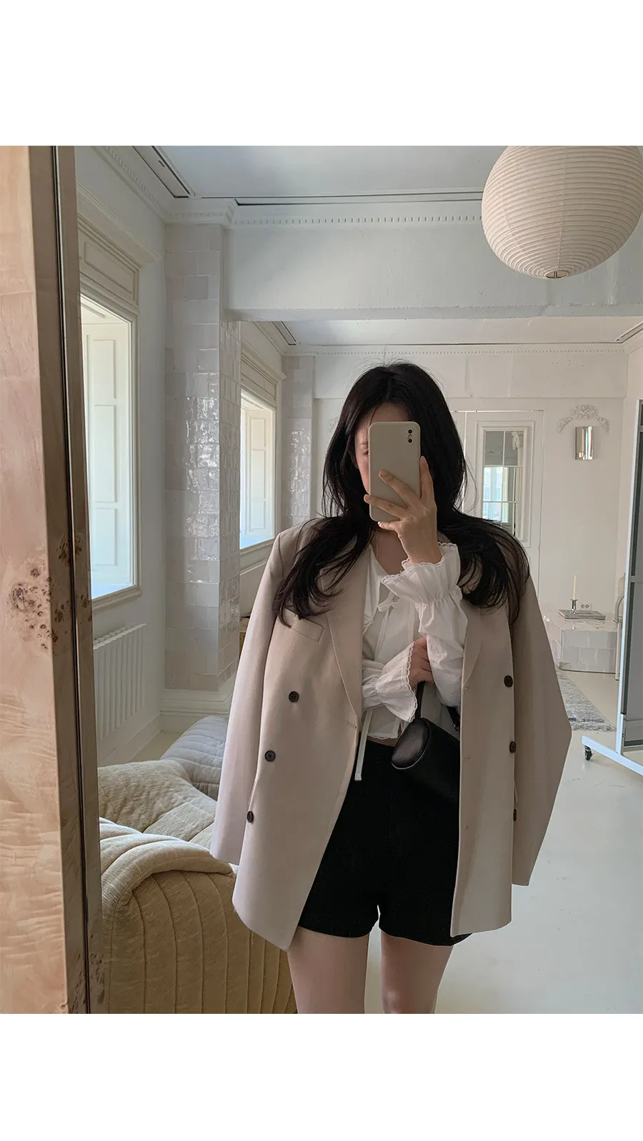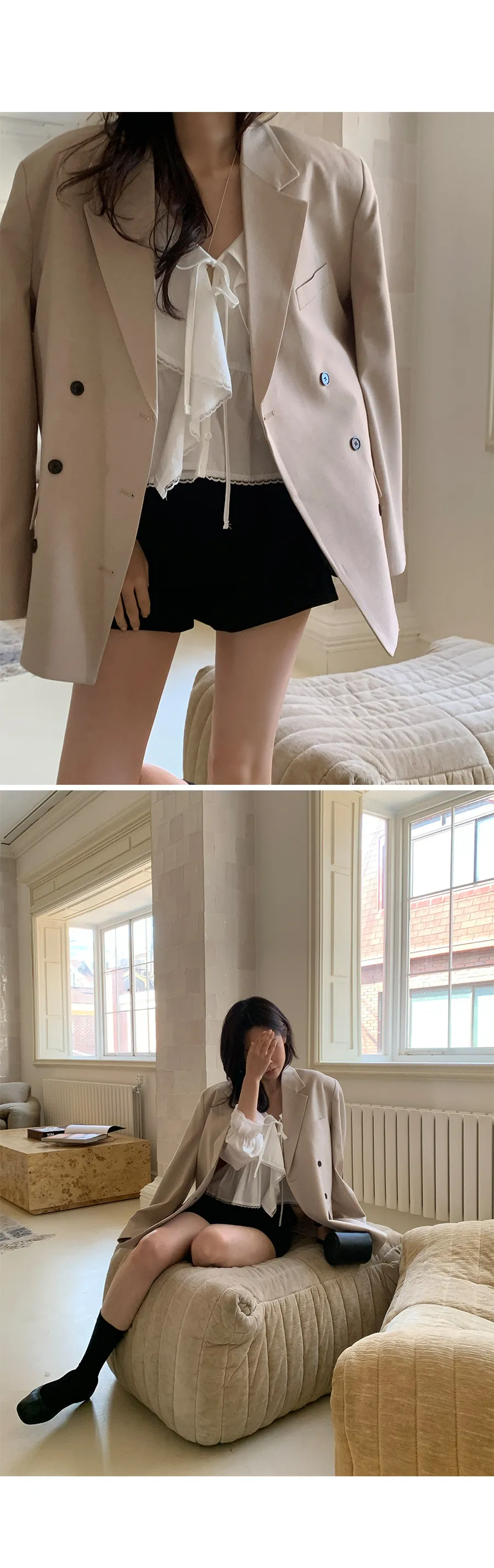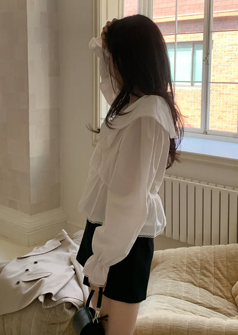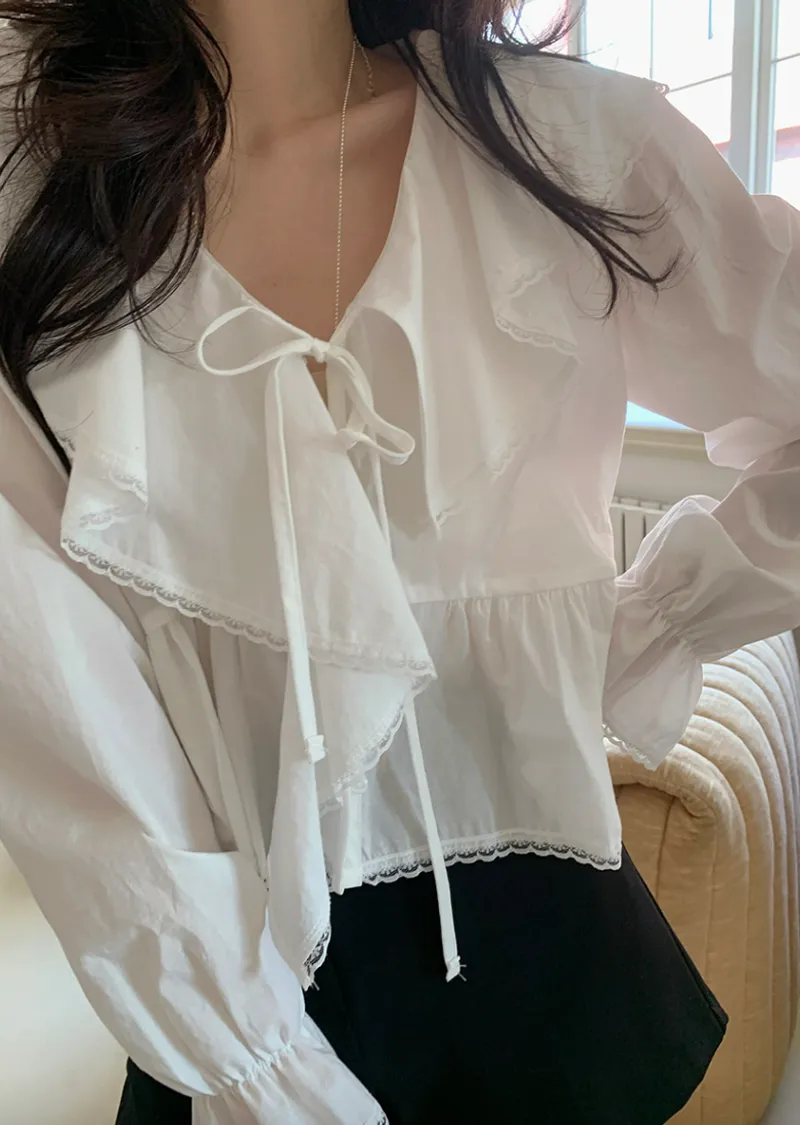柔美垂墜荷葉邊領綁帶傘擺廓形蕾絲收邊排扣上衣