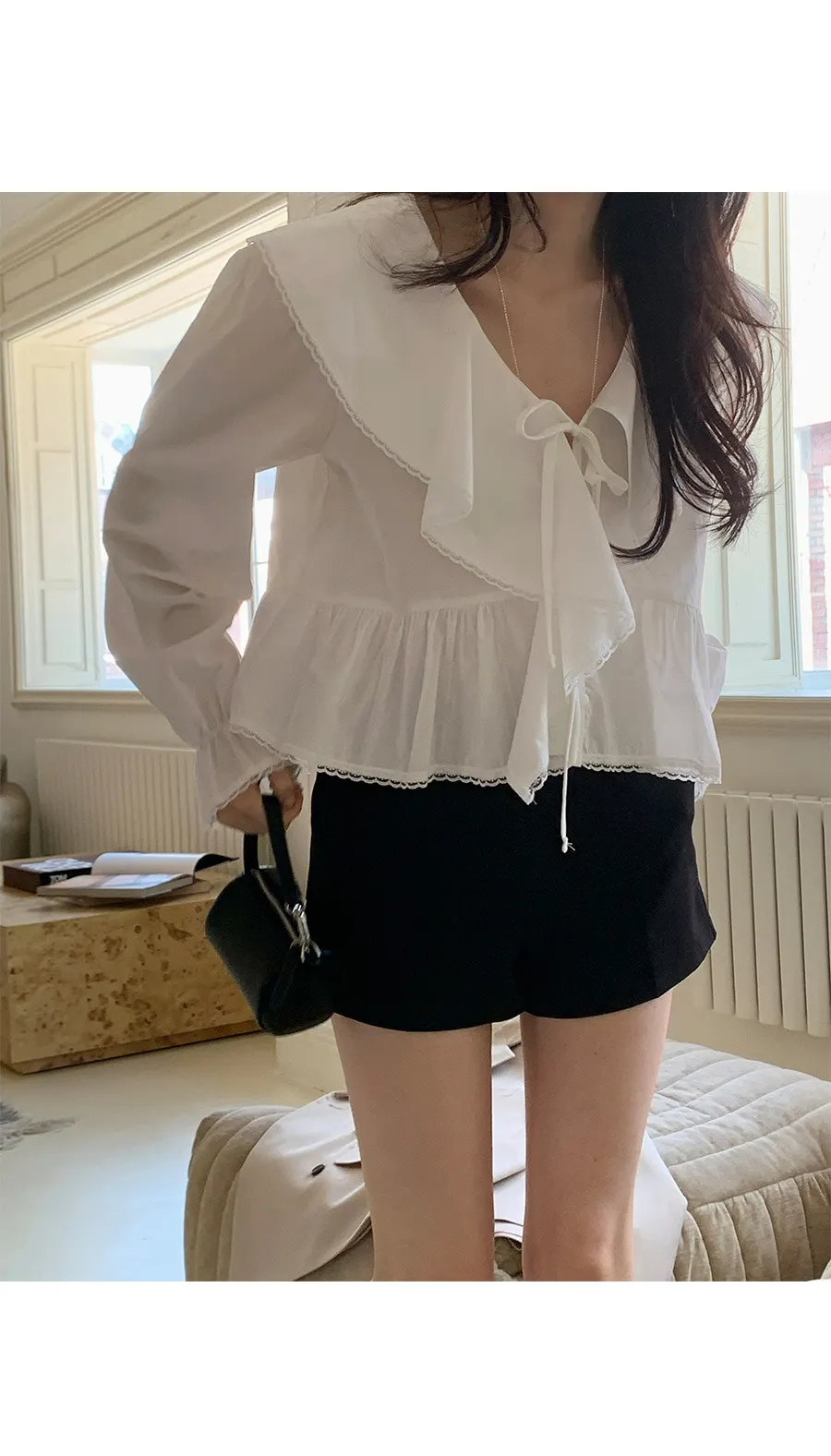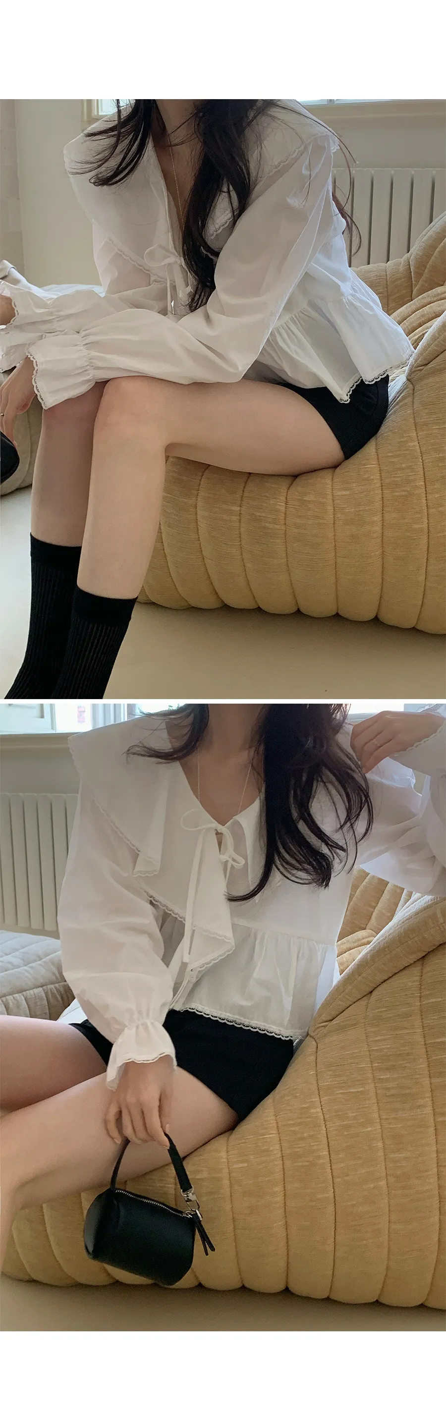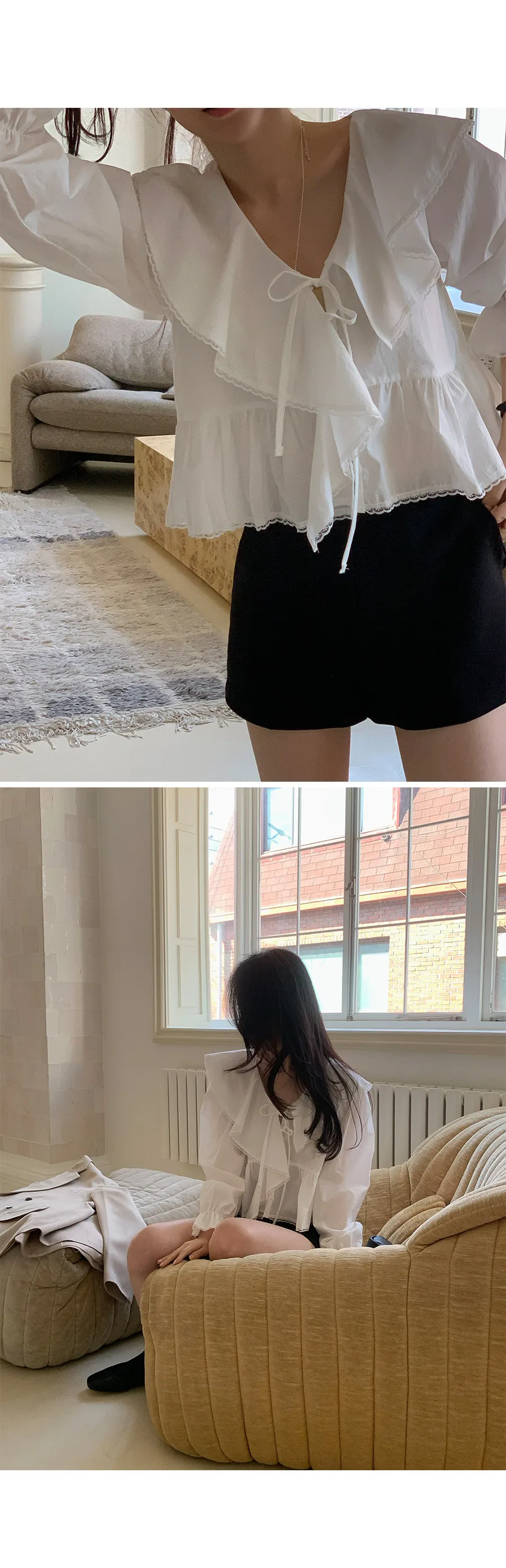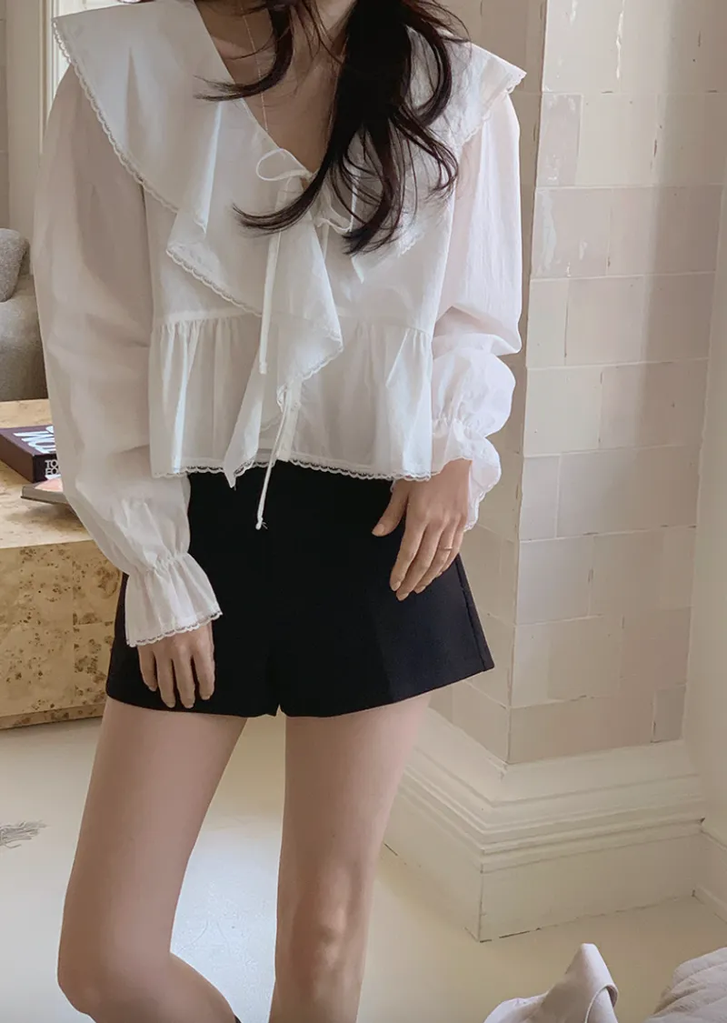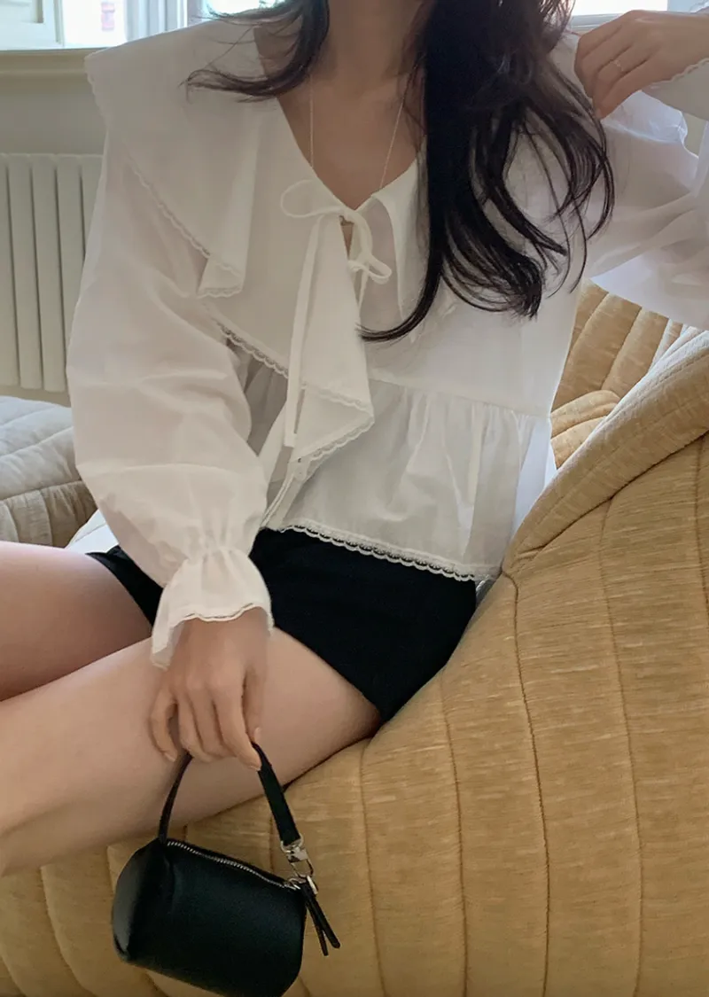 材質:100% 棉。飾有蓬鬆荷葉邊的可愛上衣 :)從領口延伸出的荷葉邊勾勒出女性柔美的輪廓,打造迷人造型♡ 胸前的繫綁緞帶, 更添幾分女性魅力 :) 從腰部開始的褶皺設計打造出更加可愛的傘擺形廓形,袖口的鬆緊帶則營造出鐘形袖口,散發出復古而又甜美的氣息!短款設計剛好到臀部上方,拉長腿部線條,蕾絲收邊細節更添復古甜美氣息:)