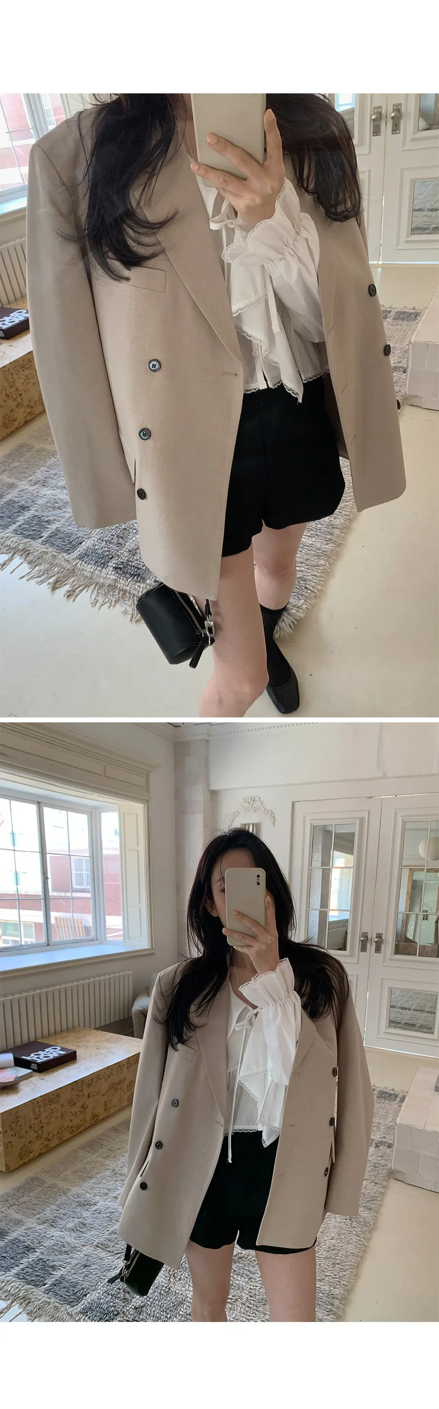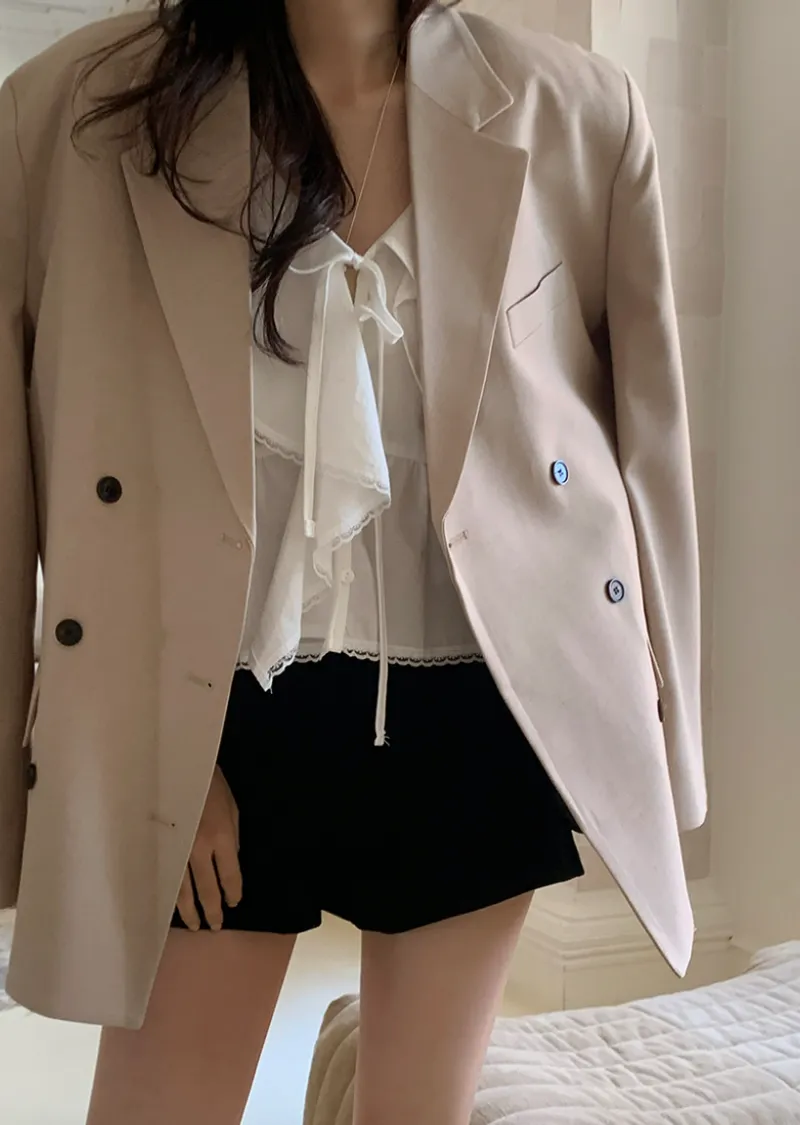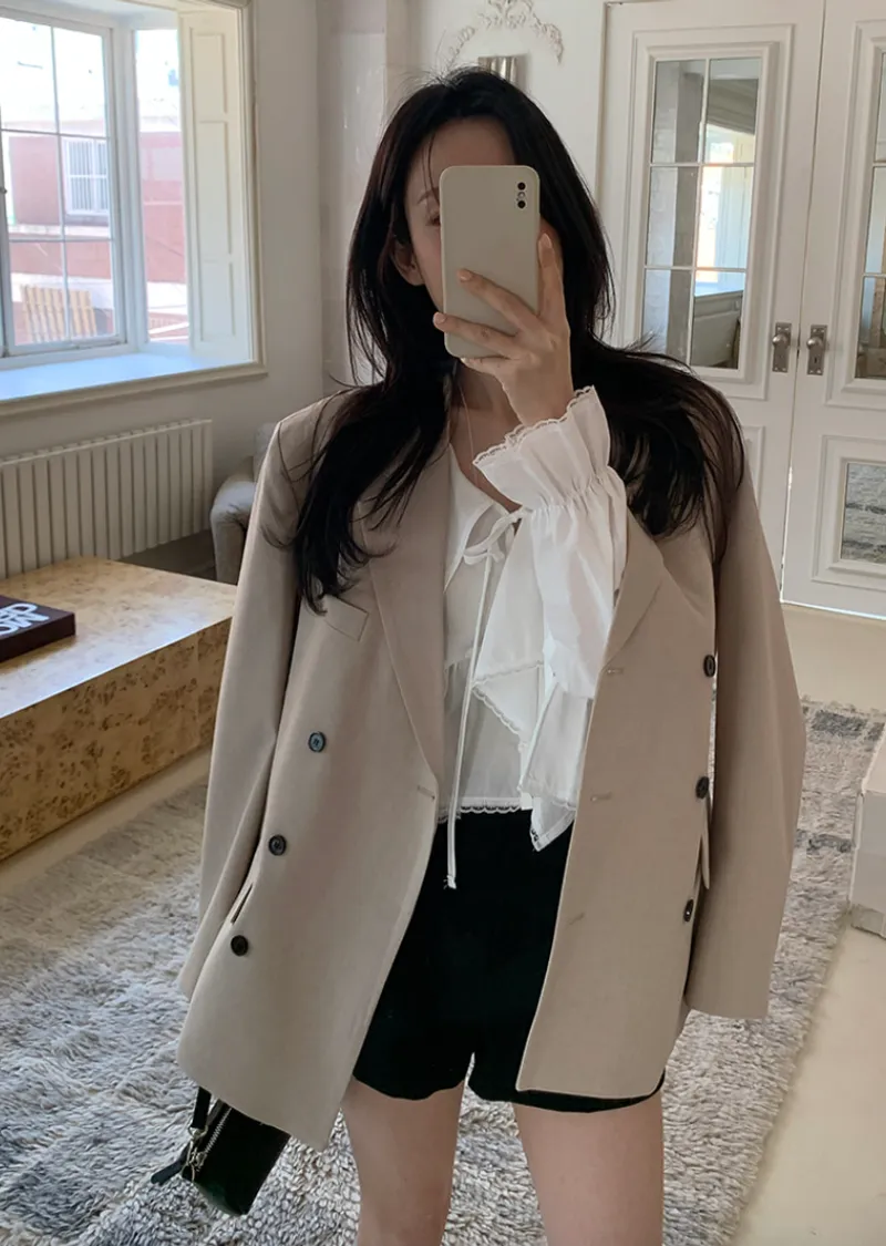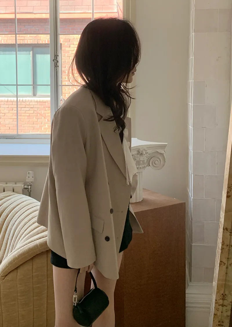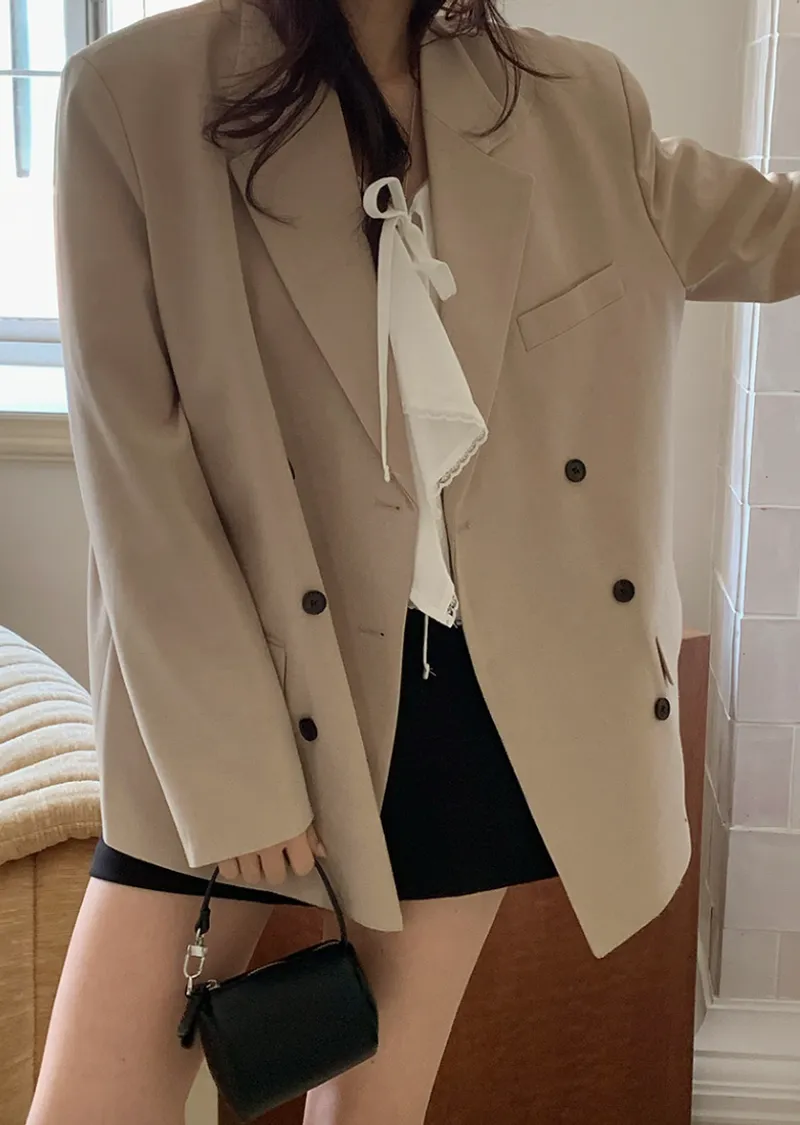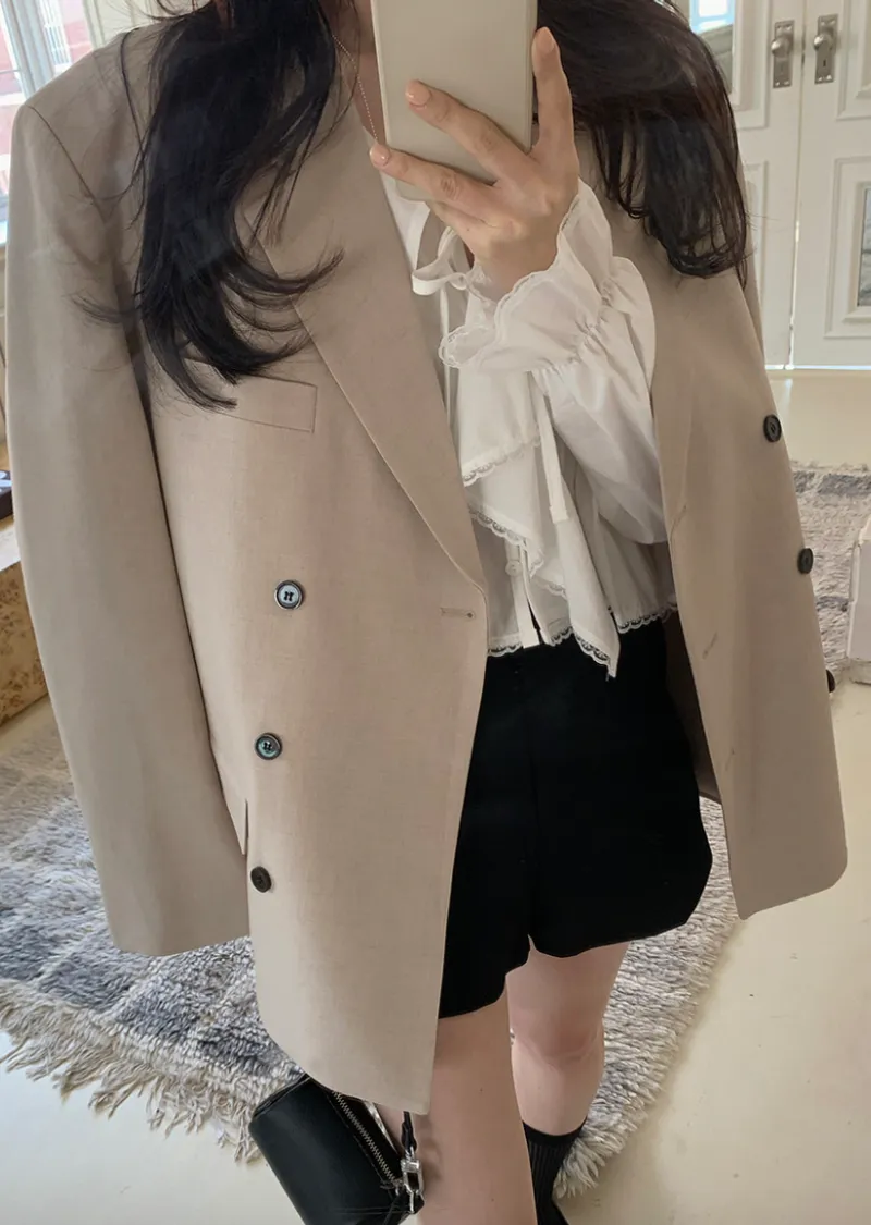 材質:聚酯纖維 56% + 人造絲 24% + 羊毛 18% + 氨綸 2%。這款品質卓越的雙排扣外套 !剪裁俐落,展現精緻優雅。肩部線條流暢自然,更添奢華質感。內建輕薄肩墊,有效固定肩部線條,打造更完美的身形。經典設計永不過時。設計翻蓋口袋和胸袋,實用性極強!寬鬆舒適的版型和簡約的設計,使其成為換季時節的必備日常外套。