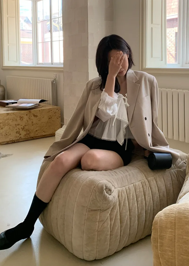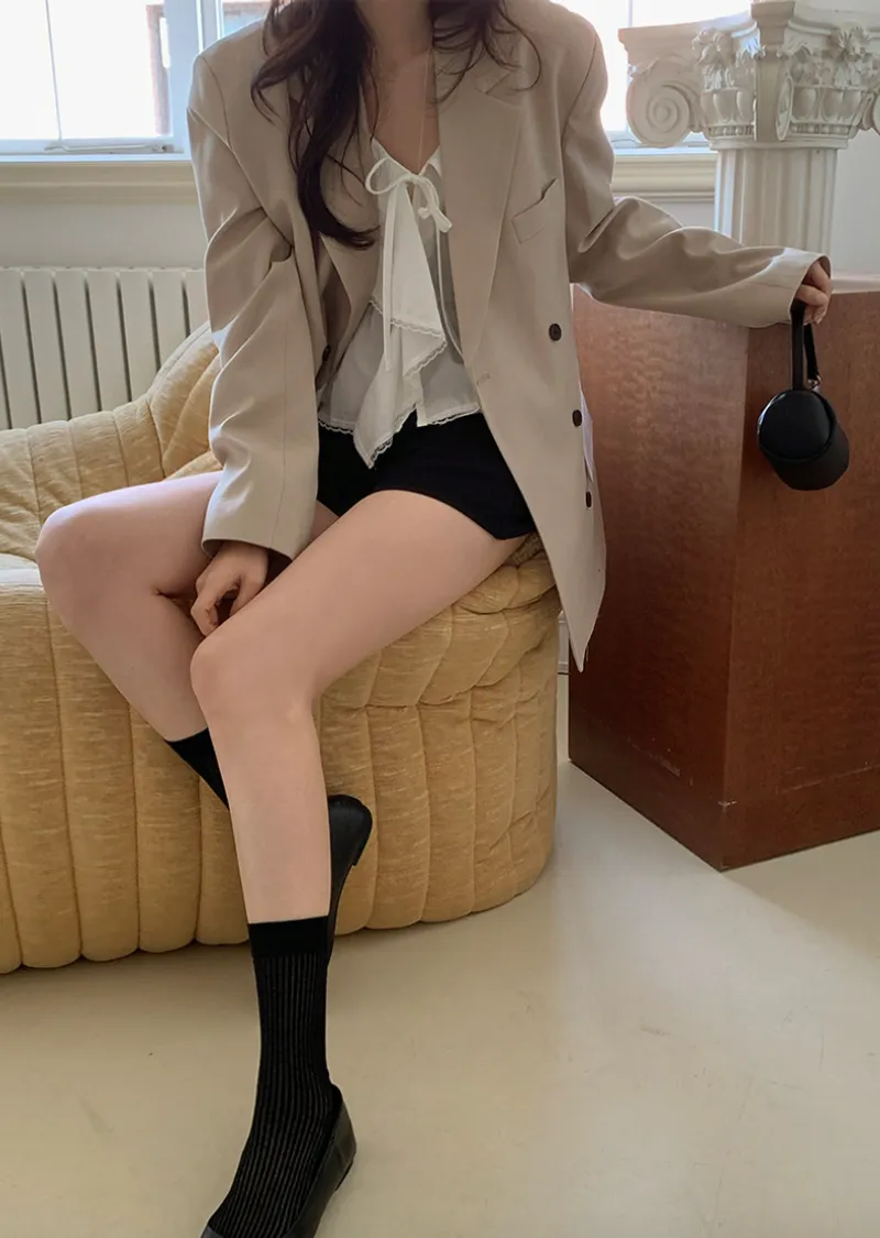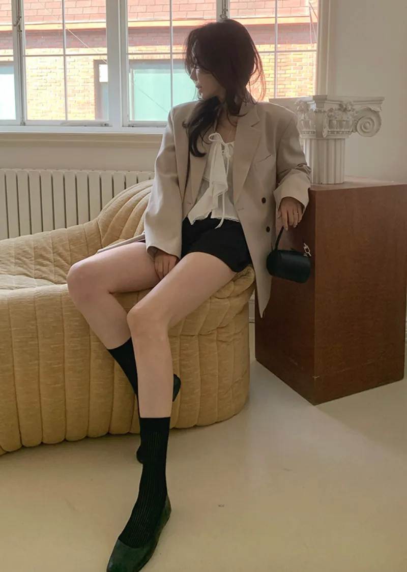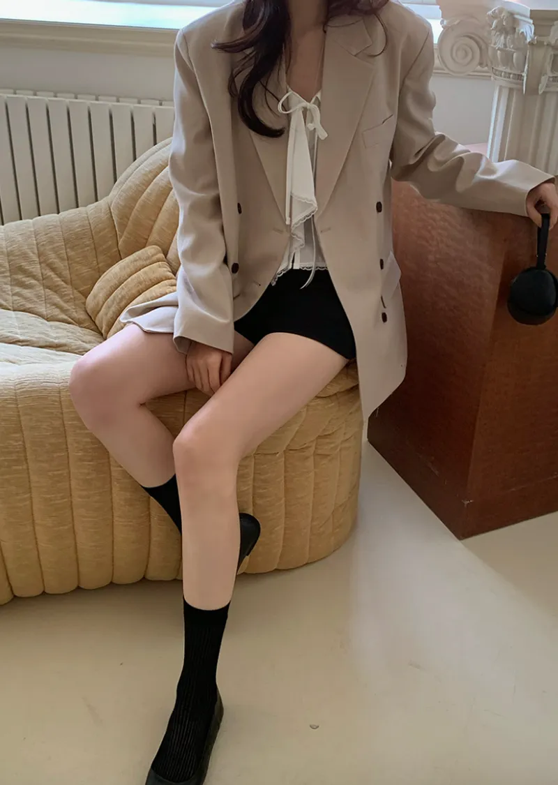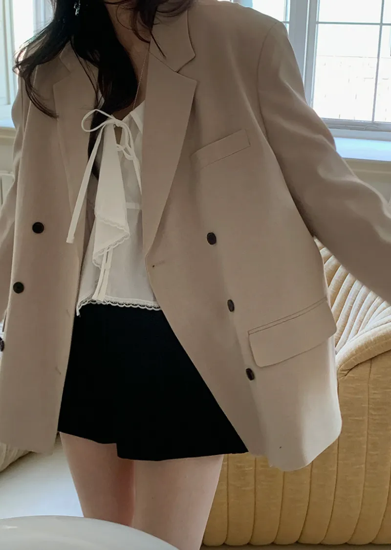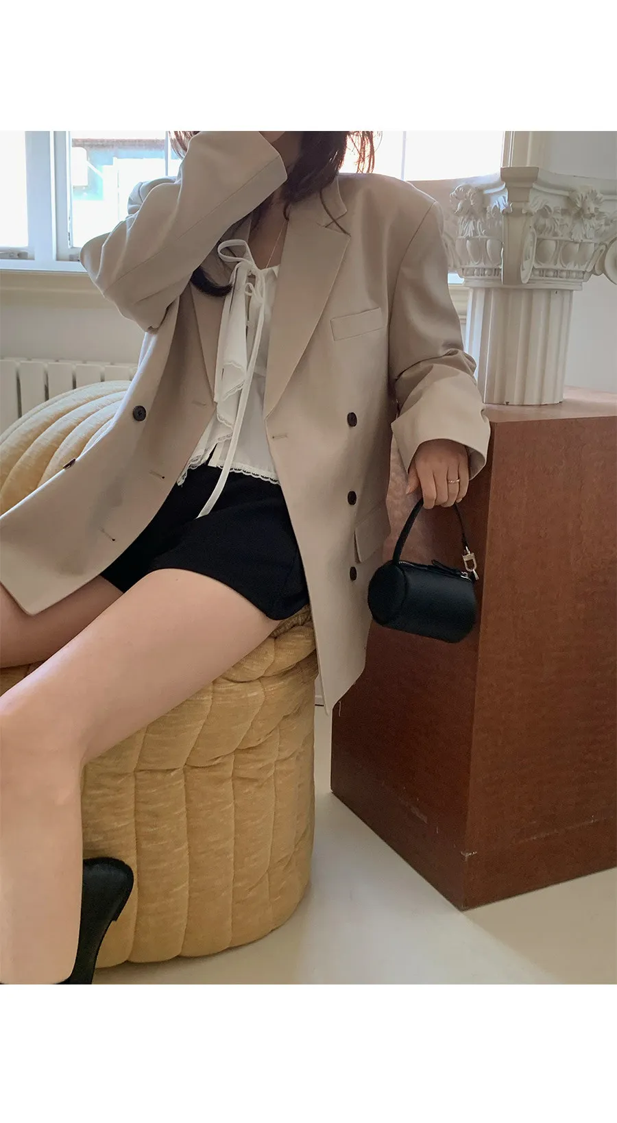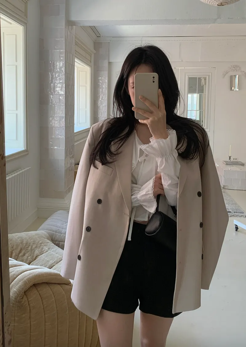 材質:聚酯纖維 56% + 人造絲 24% + 羊毛 18% + 氨綸 2%。這款品質卓越的雙排扣外套 !剪裁俐落,展現精緻優雅。肩部線條流暢自然,更添奢華質感。內建輕薄肩墊,有效固定肩部線條,打造更完美的身形。經典設計永不過時。設計翻蓋口袋和胸袋,實用性極強!寬鬆舒適的版型和簡約的設計,使其成為換季時節的必備日常外套。