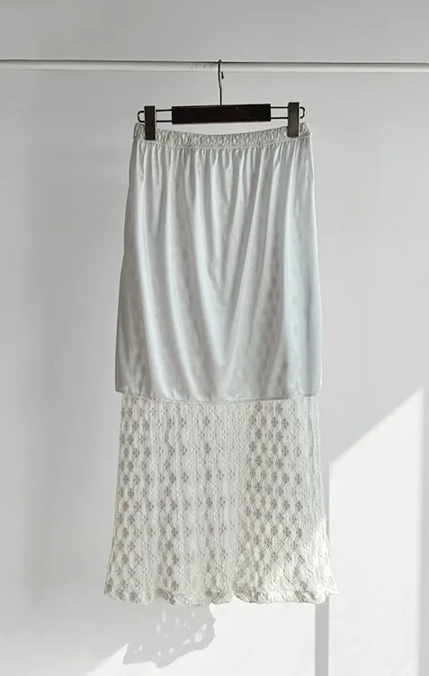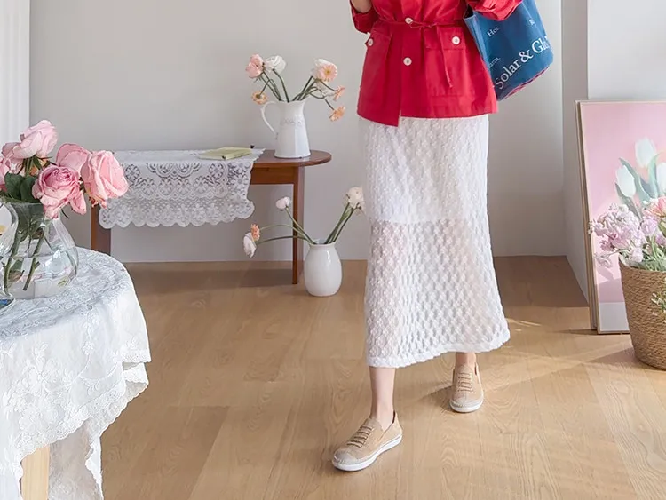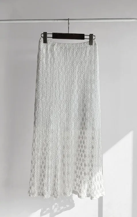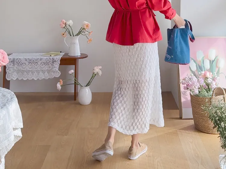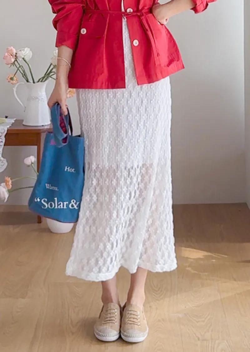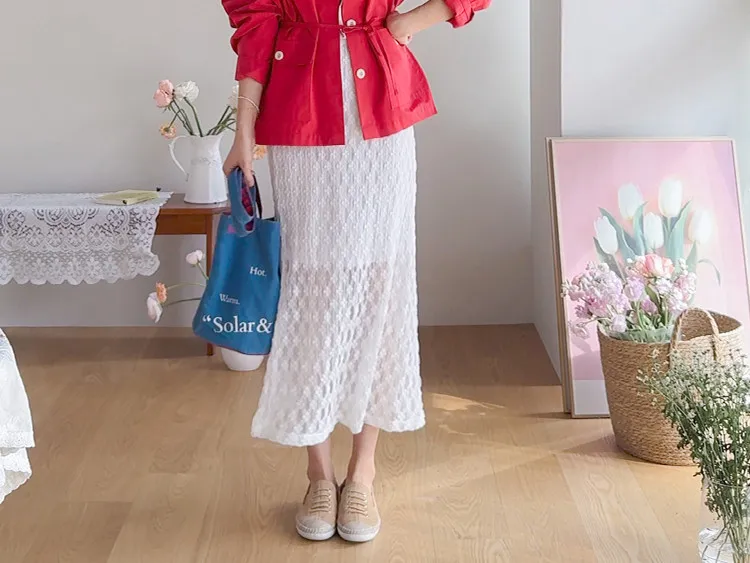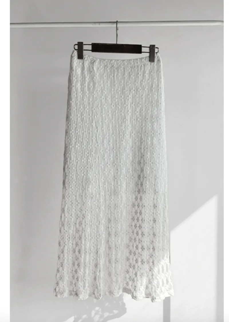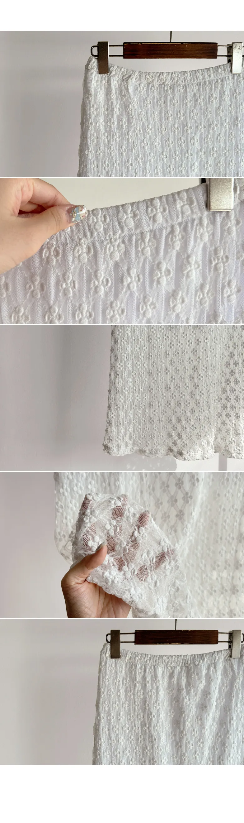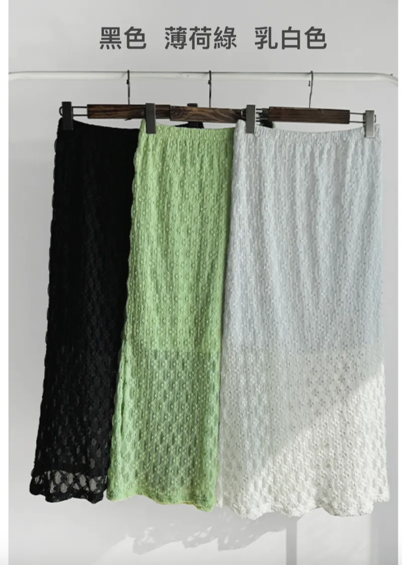 材質:尼龍 47%,棉 43%,氨綸 10%(外層),聚酯纖維 100%(內層)【花卉蕾絲圖案,獨具特色♡】【輕盈飄逸,略帶透視質感】【自然傘擺廓形,荷葉邊下擺細節】【彈性腰帶,穿著舒適】