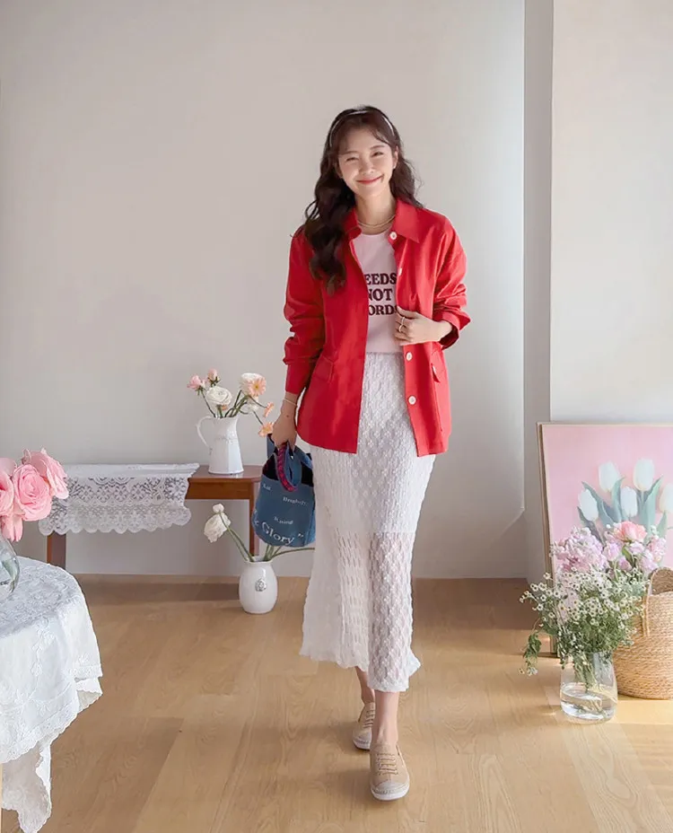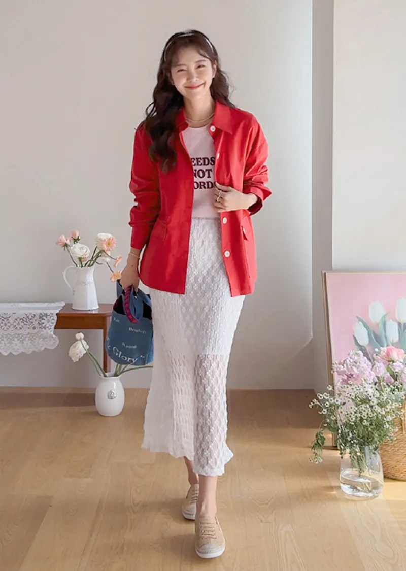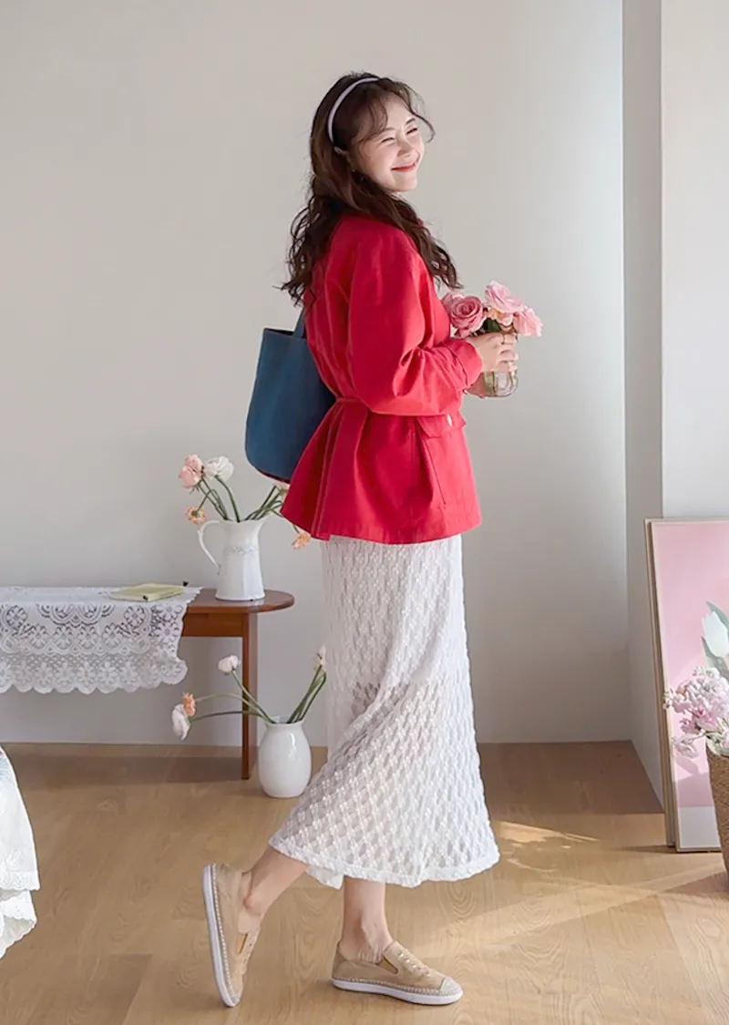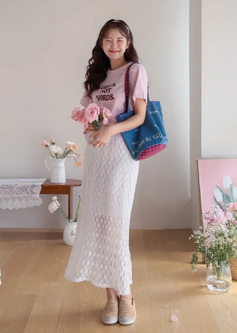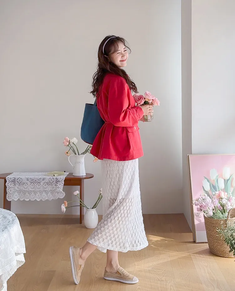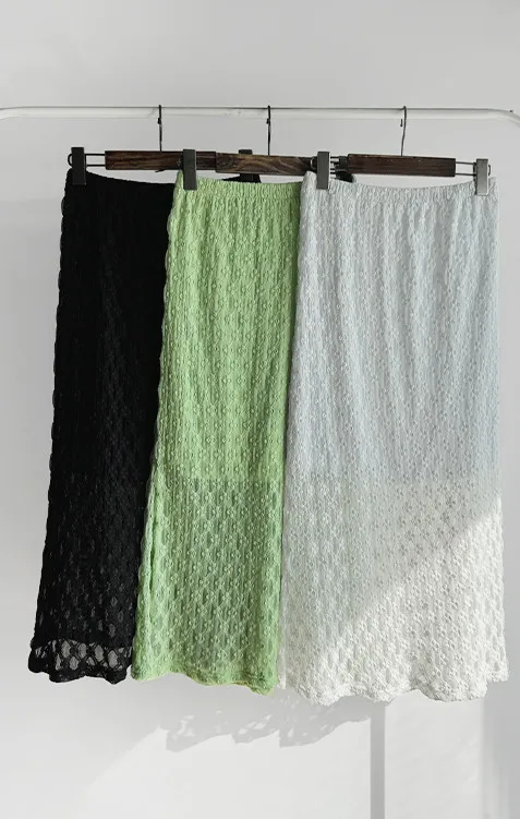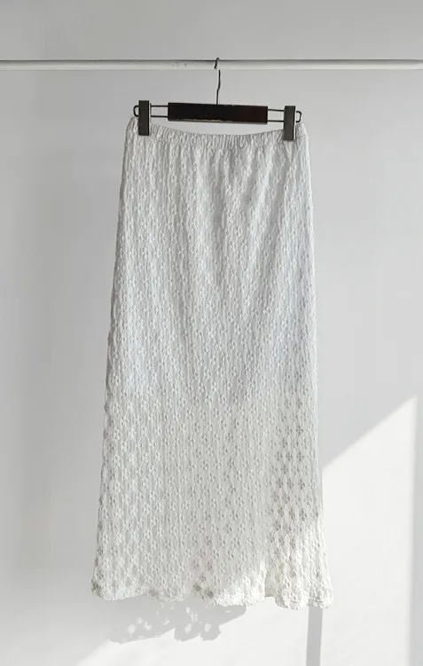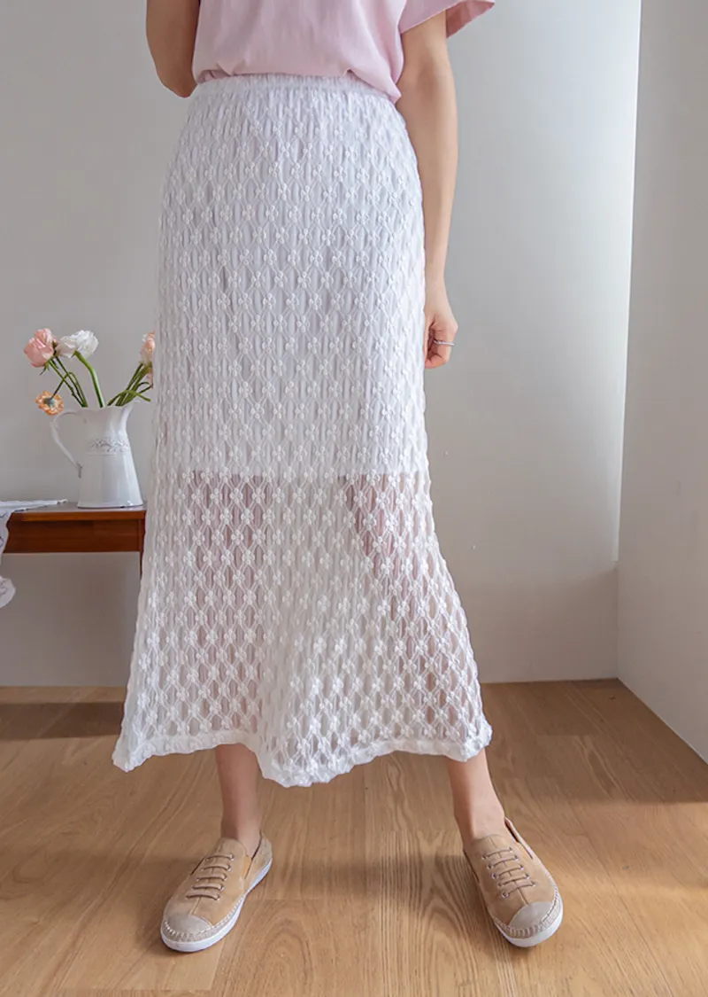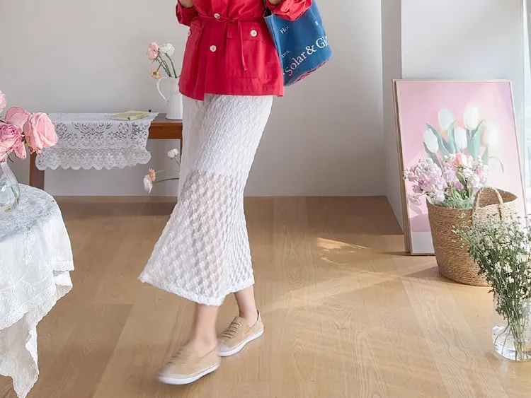材質:尼龍 47%,棉 43%,氨綸 10%(外層),聚酯纖維 100%(內層)【花卉蕾絲圖案,獨具特色♡】【輕盈飄逸,略帶透視質感】【自然傘擺廓形,荷葉邊下擺細節】【彈性腰帶,穿著舒適】