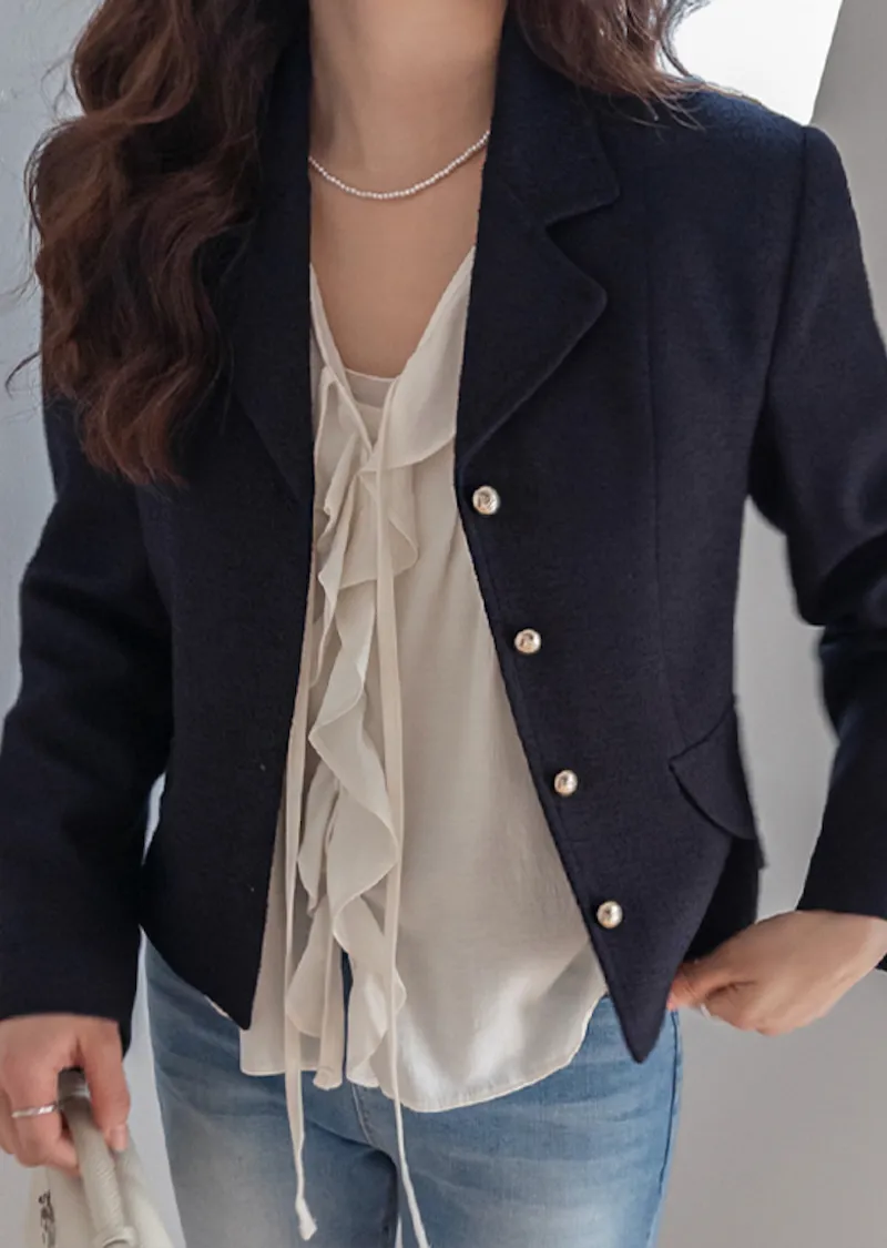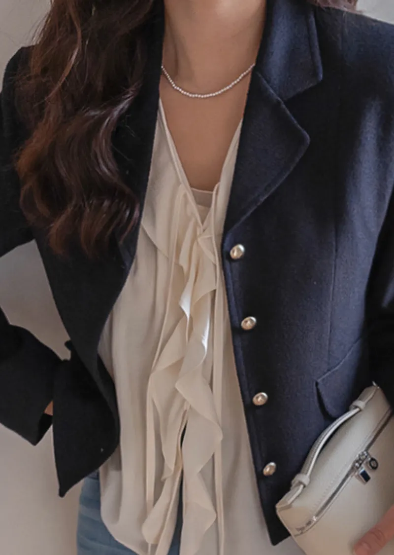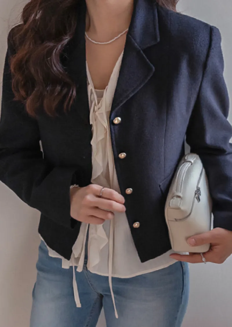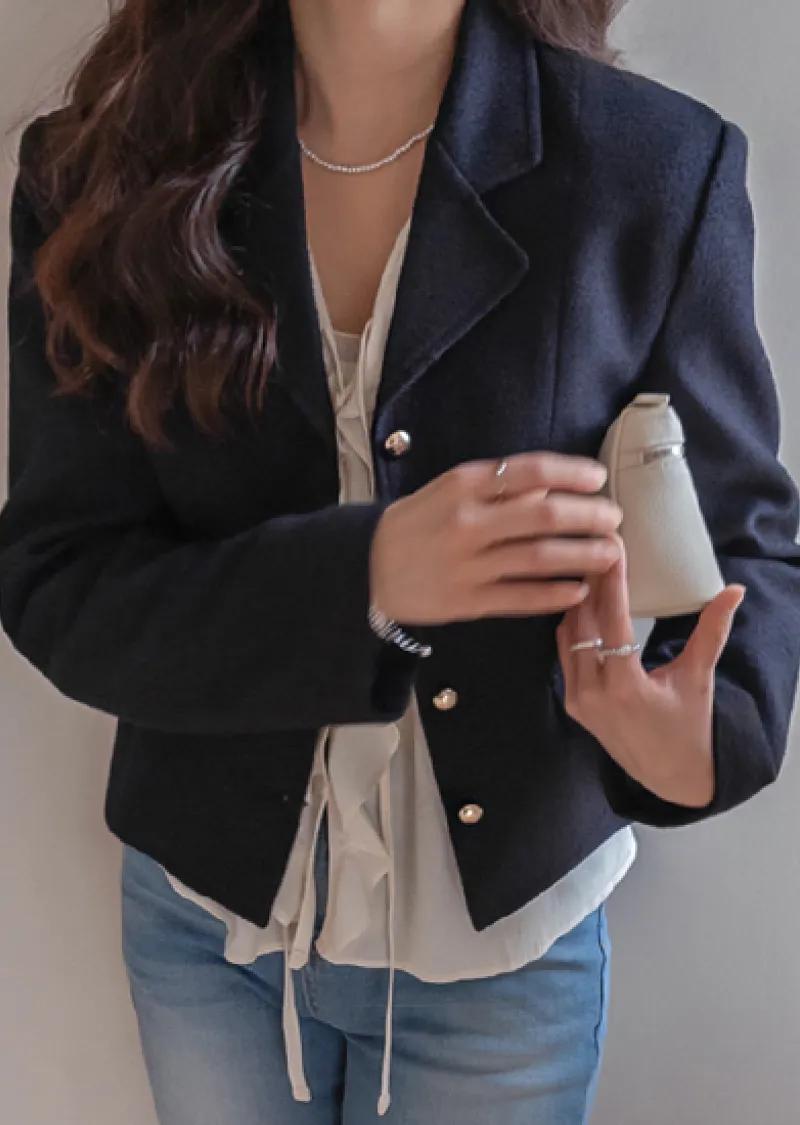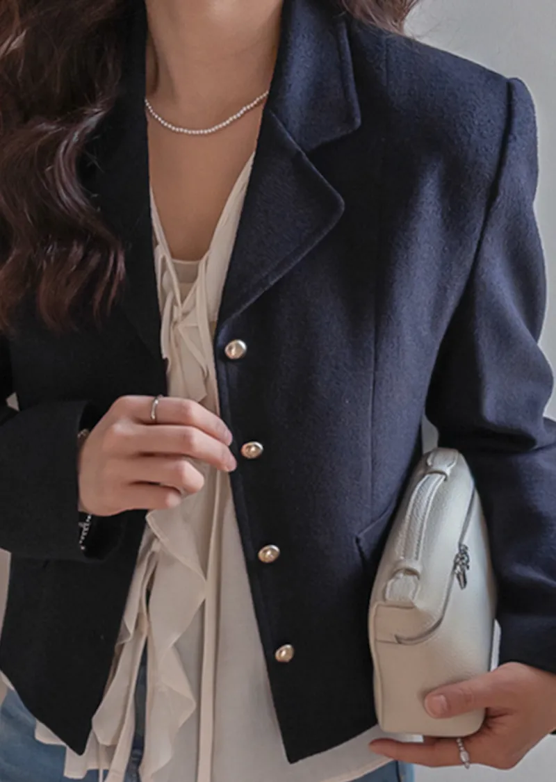 【飾有經典金色連結鈕扣的奢華外套】【精緻的廓形,短款設計凸顯身材比例】【內建襯裡,穿著舒適貼合】【巧妙的假口袋細節,避免單調感♡】
