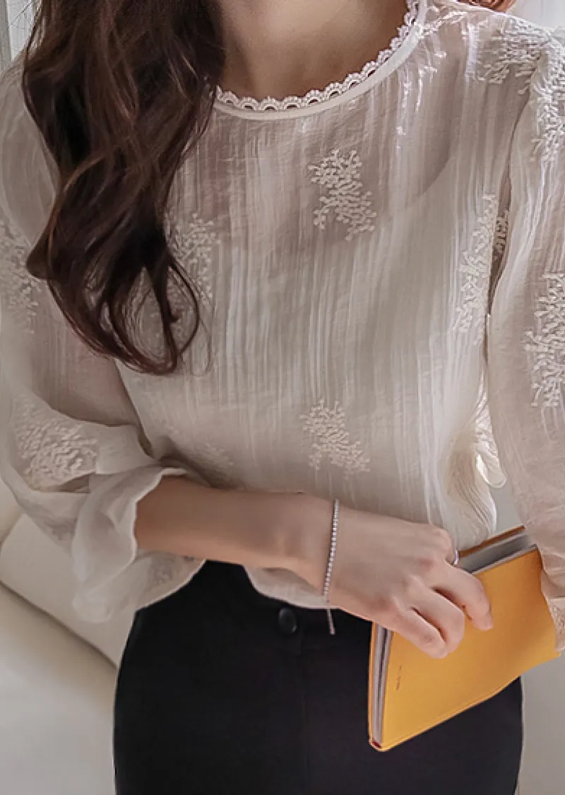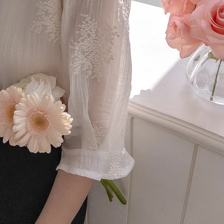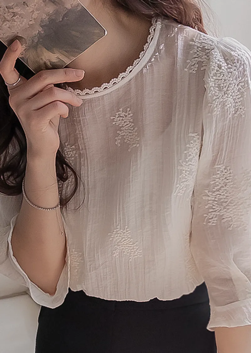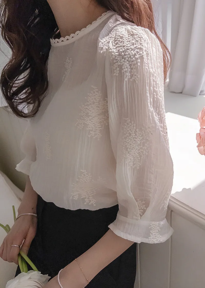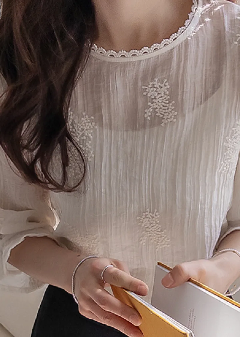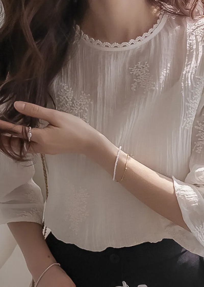 柔美氣息領口蕾絲花朵刺繡褶皺紋理上衣