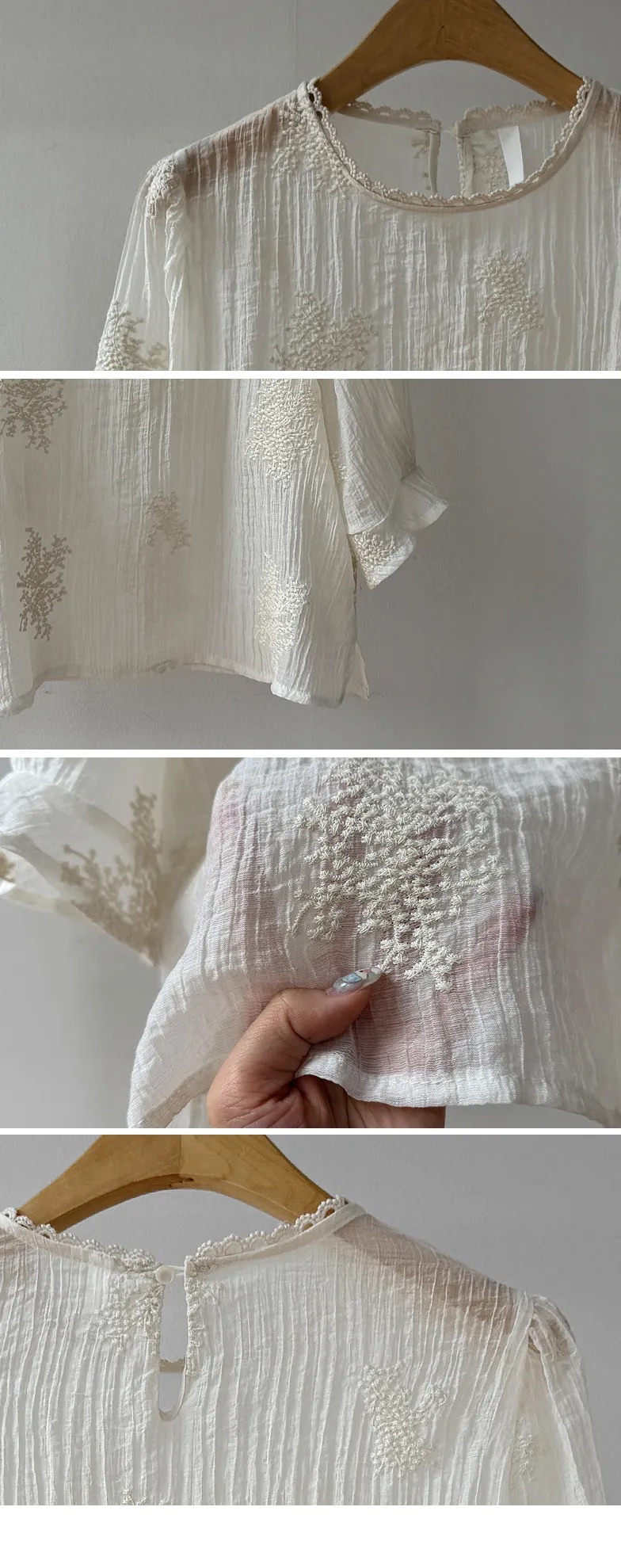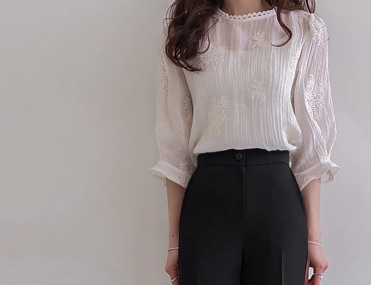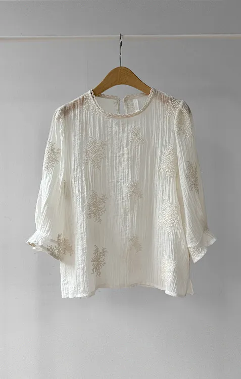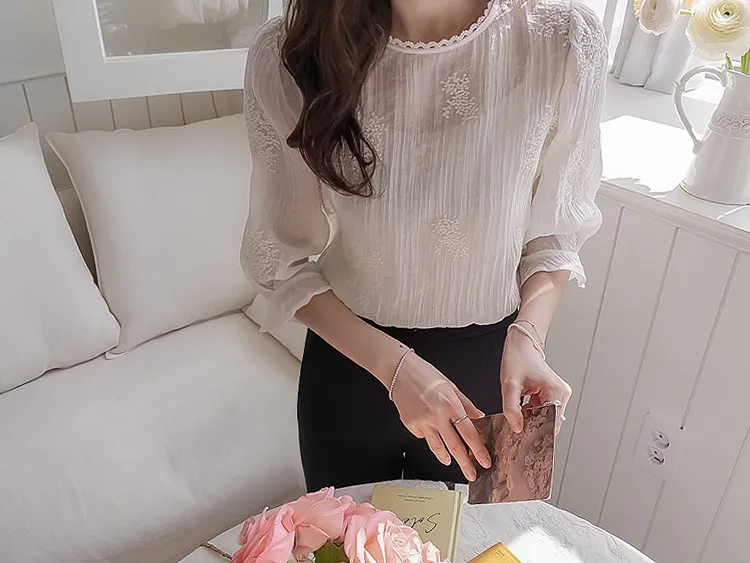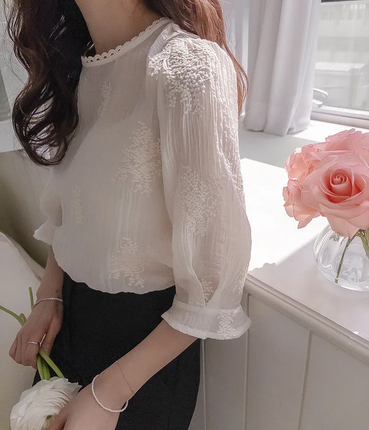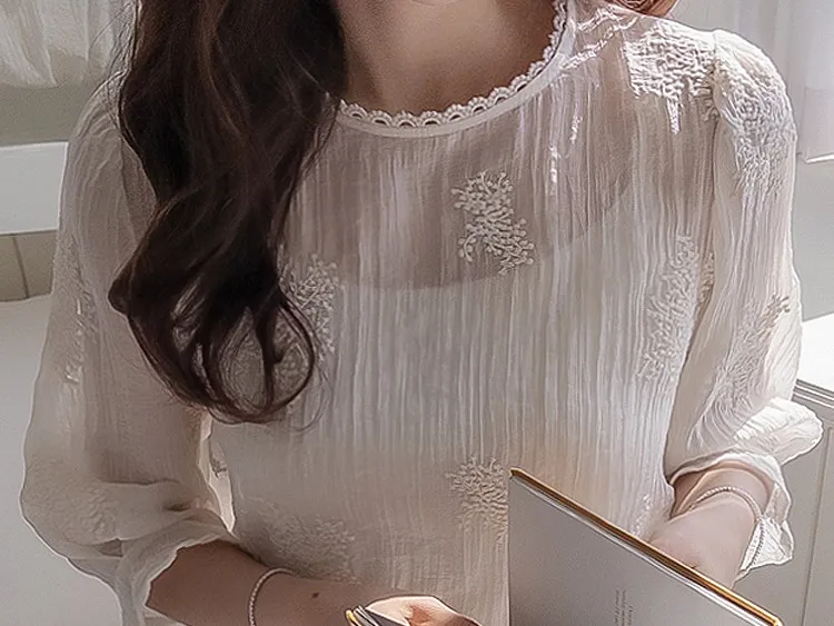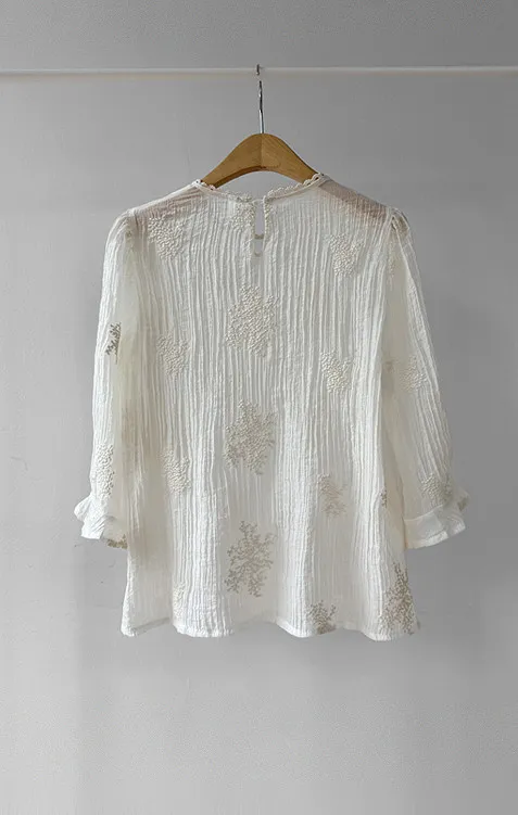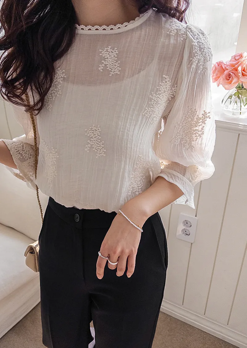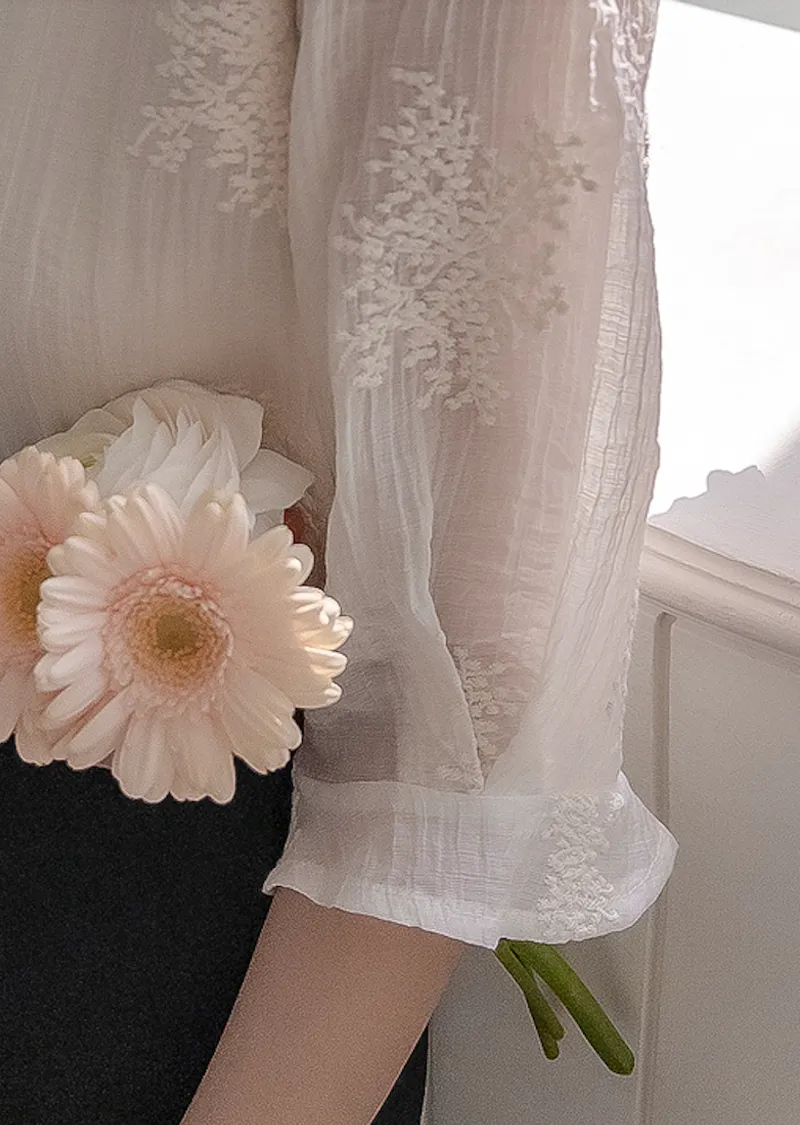柔美氣息領口蕾絲花朵刺繡褶皺紋理上衣