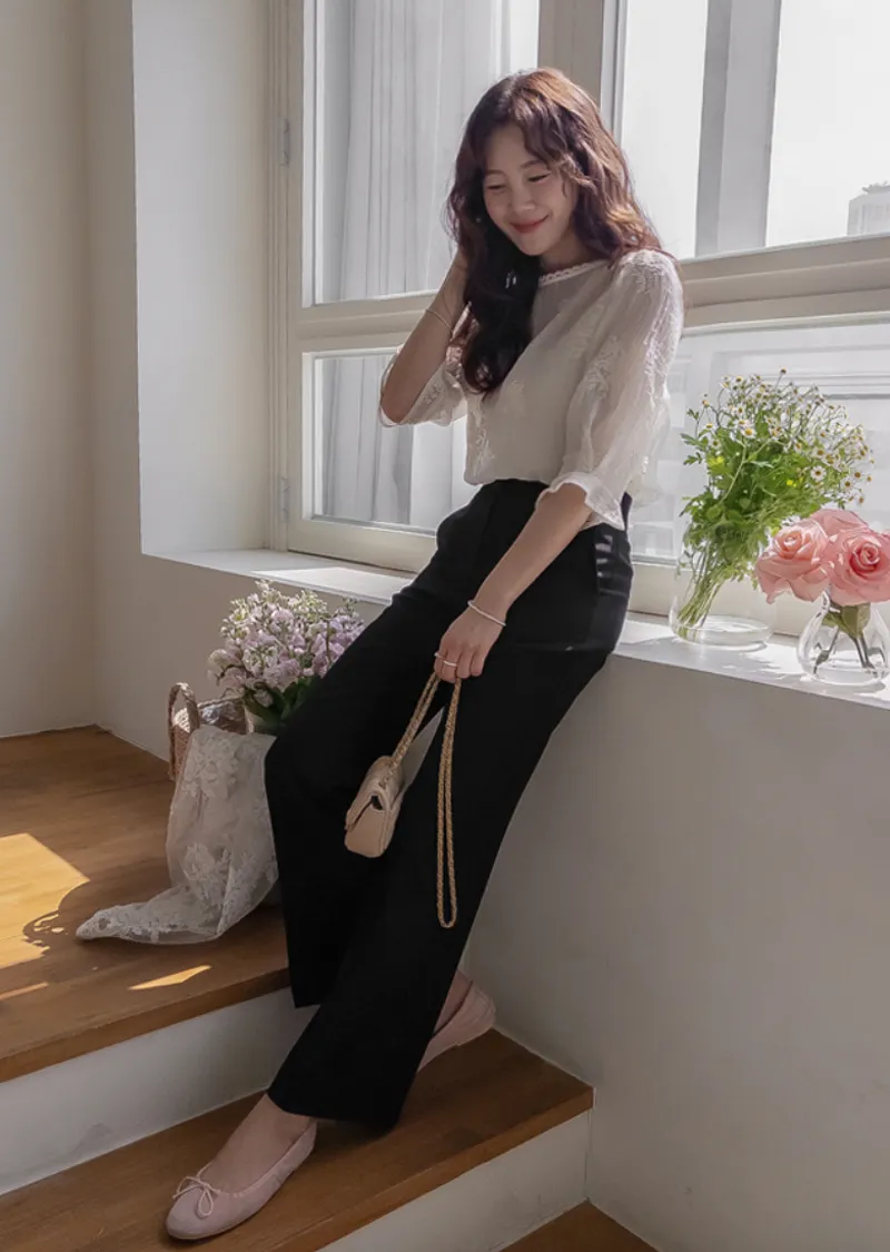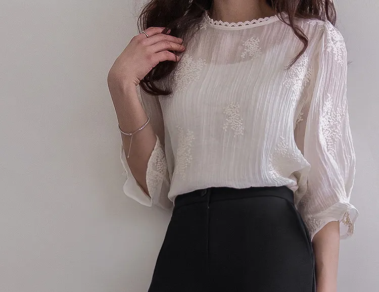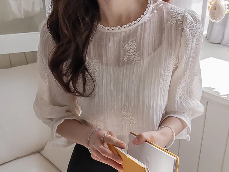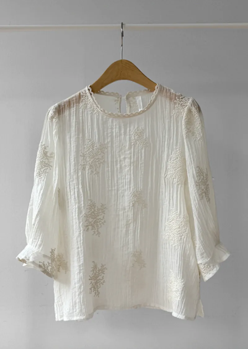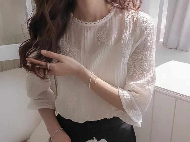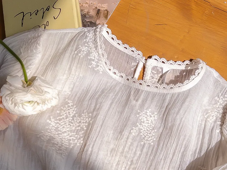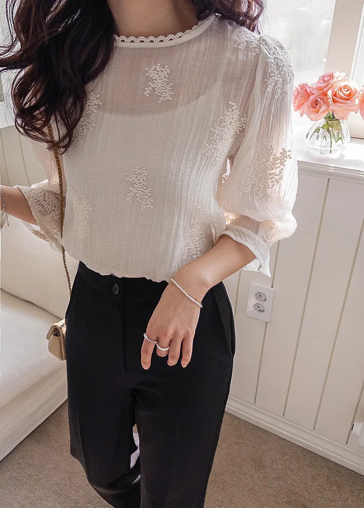 柔美氣息領口蕾絲花朵刺繡褶皺紋理上衣