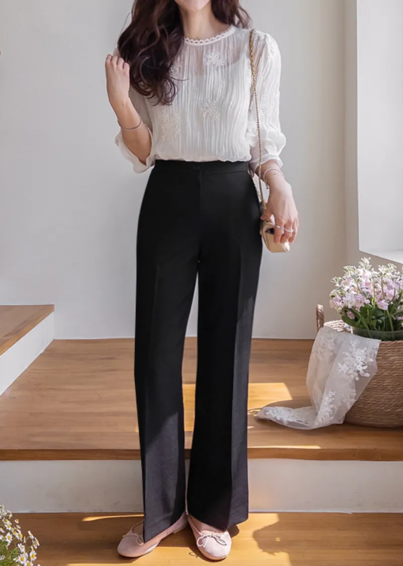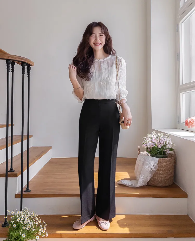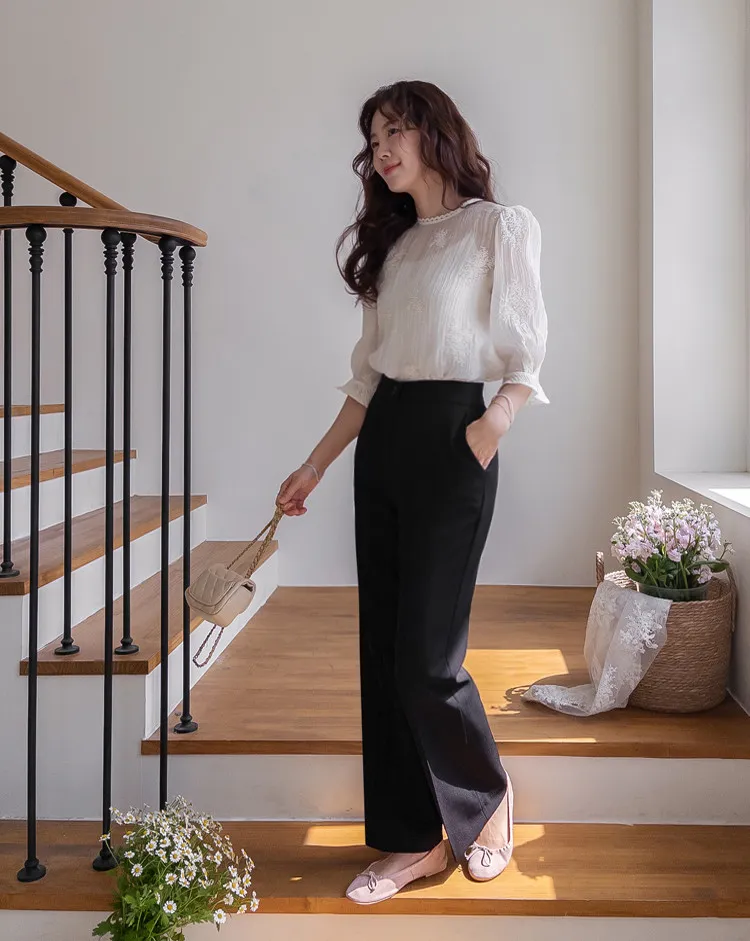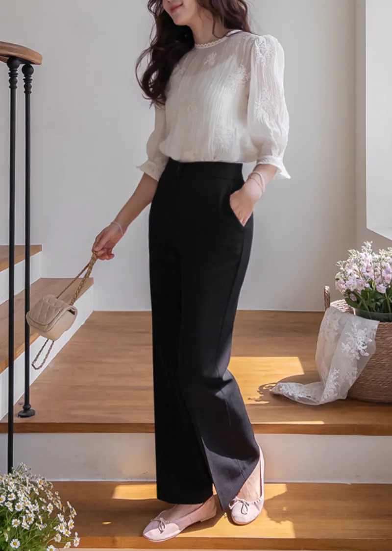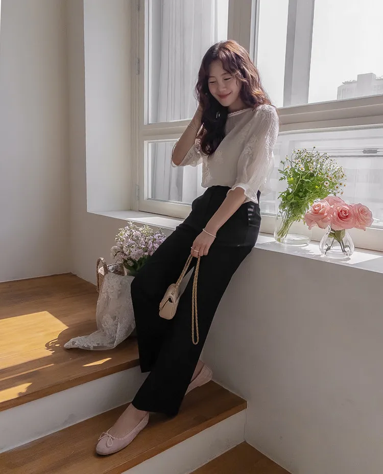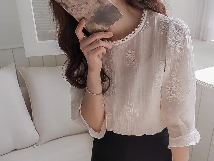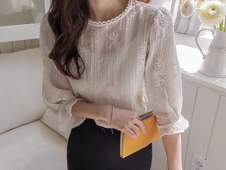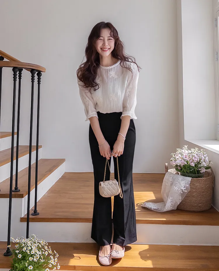 柔美氣息領口蕾絲花朵刺繡褶皺紋理上衣
