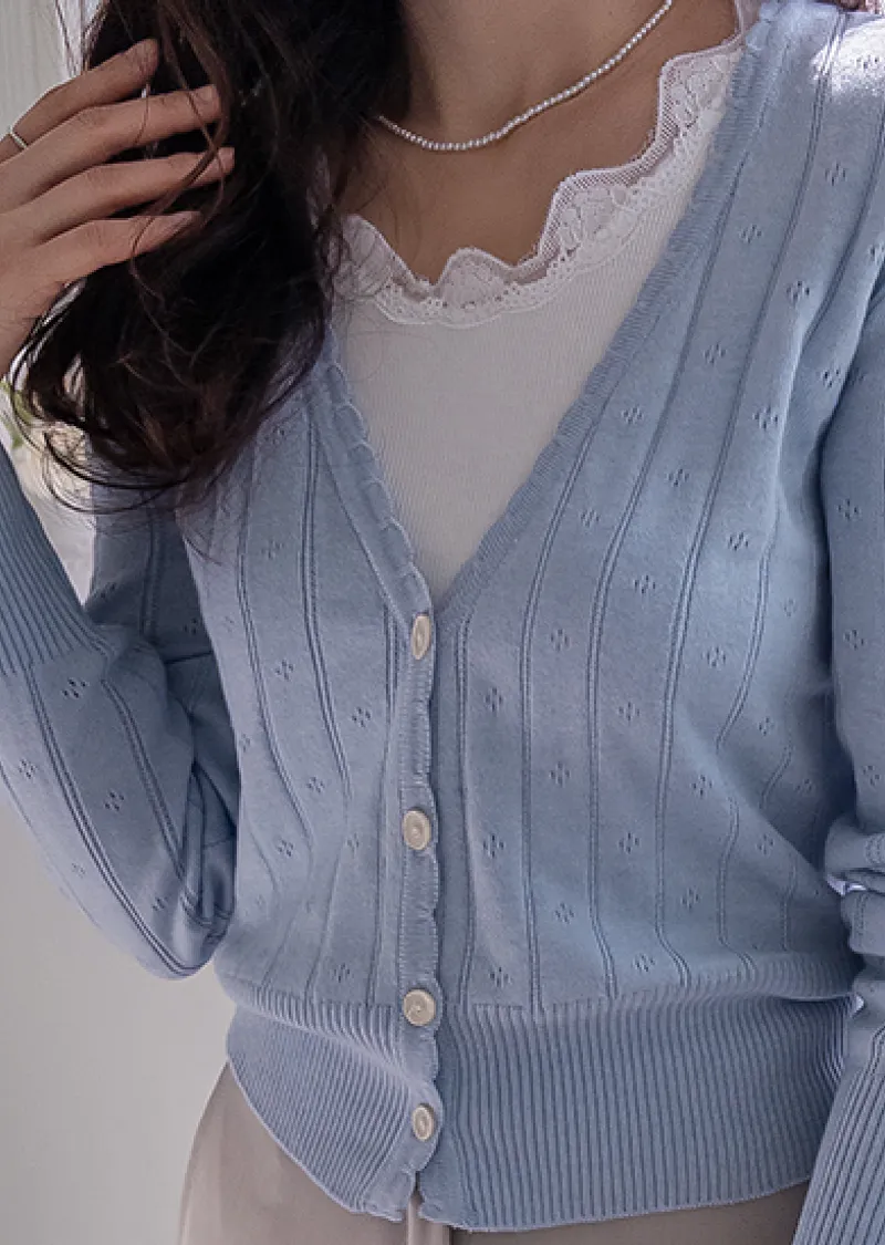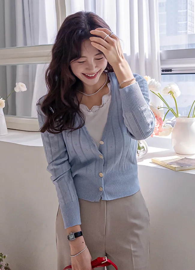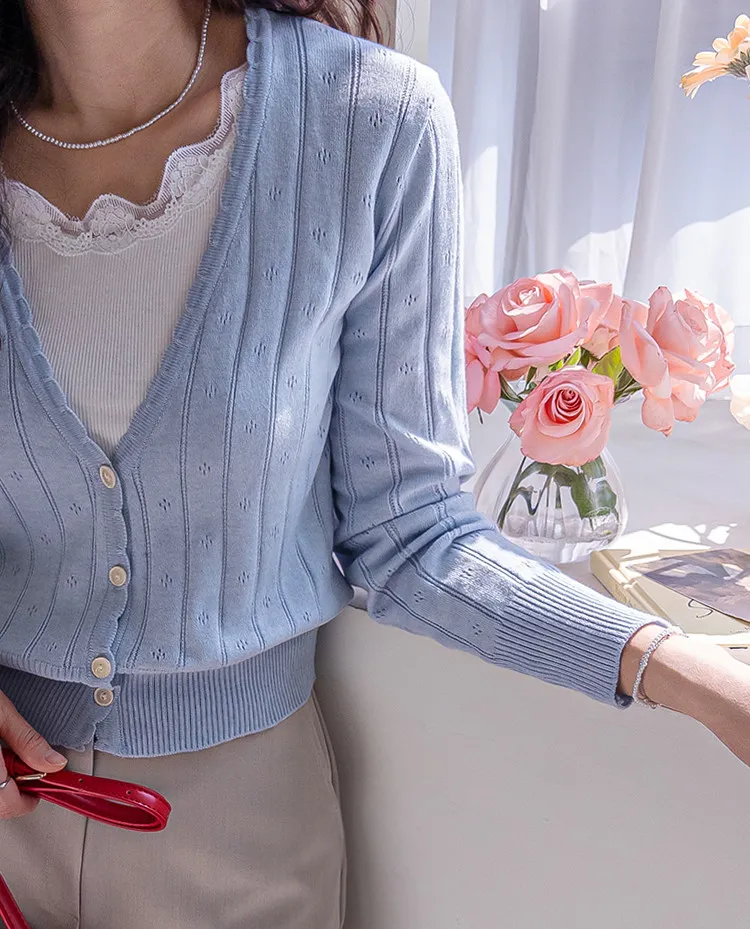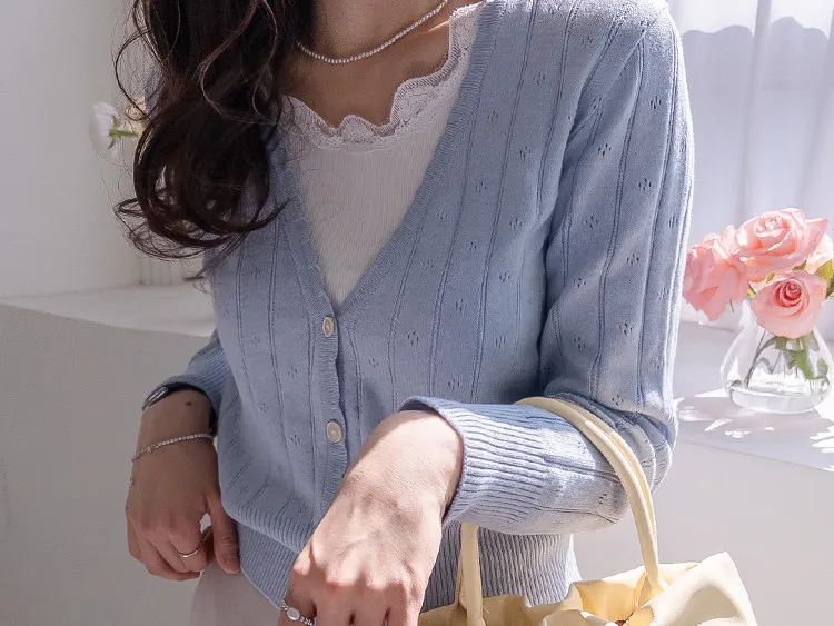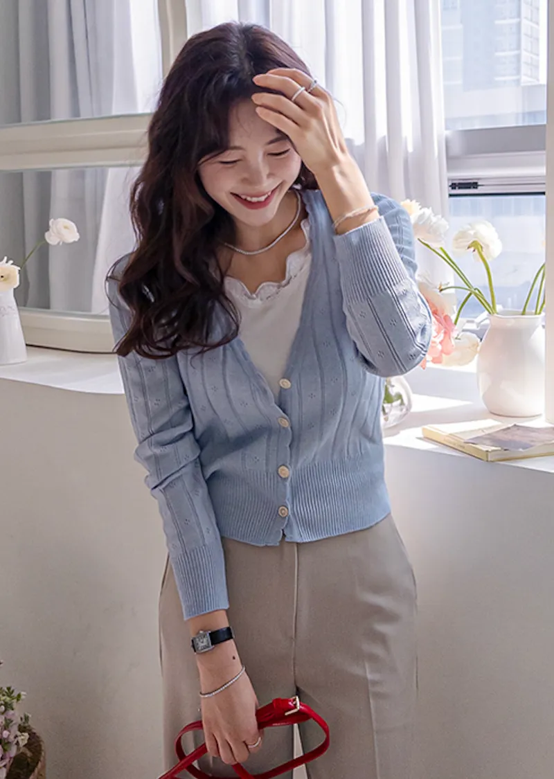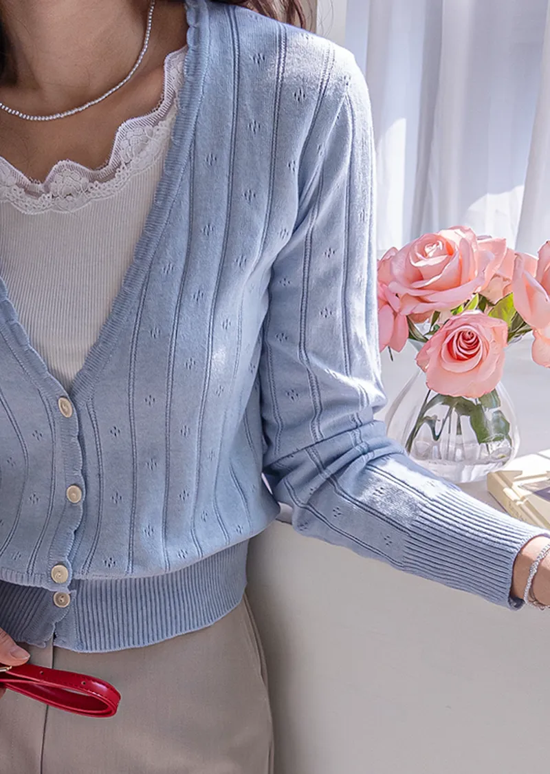 柔軟舒適領口鈕扣波浪襯邊精緻鏤空設計開衫