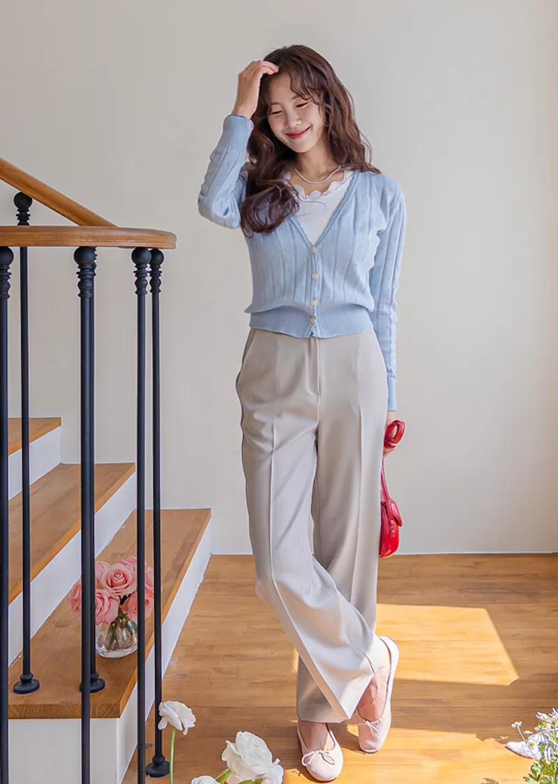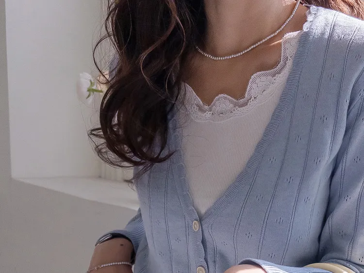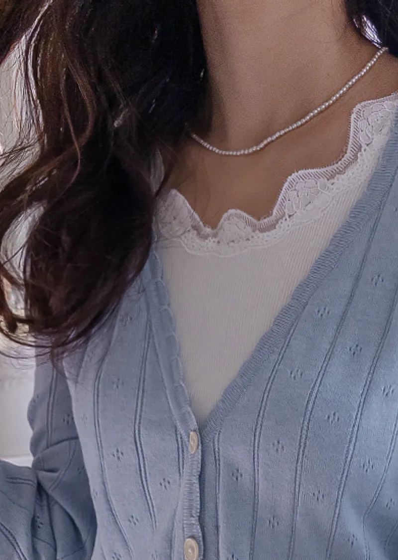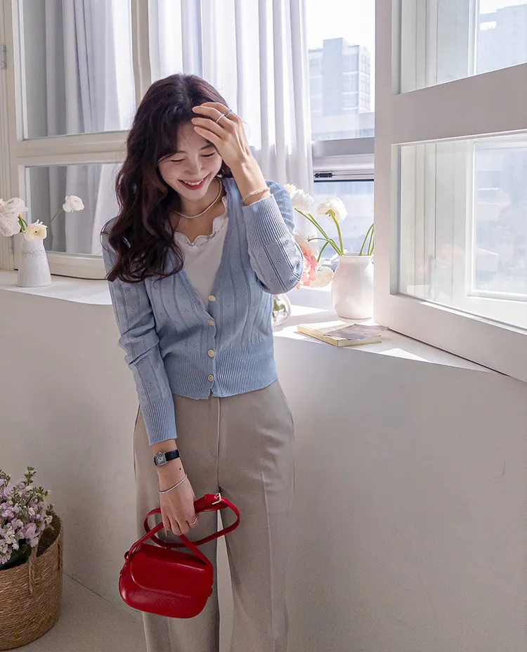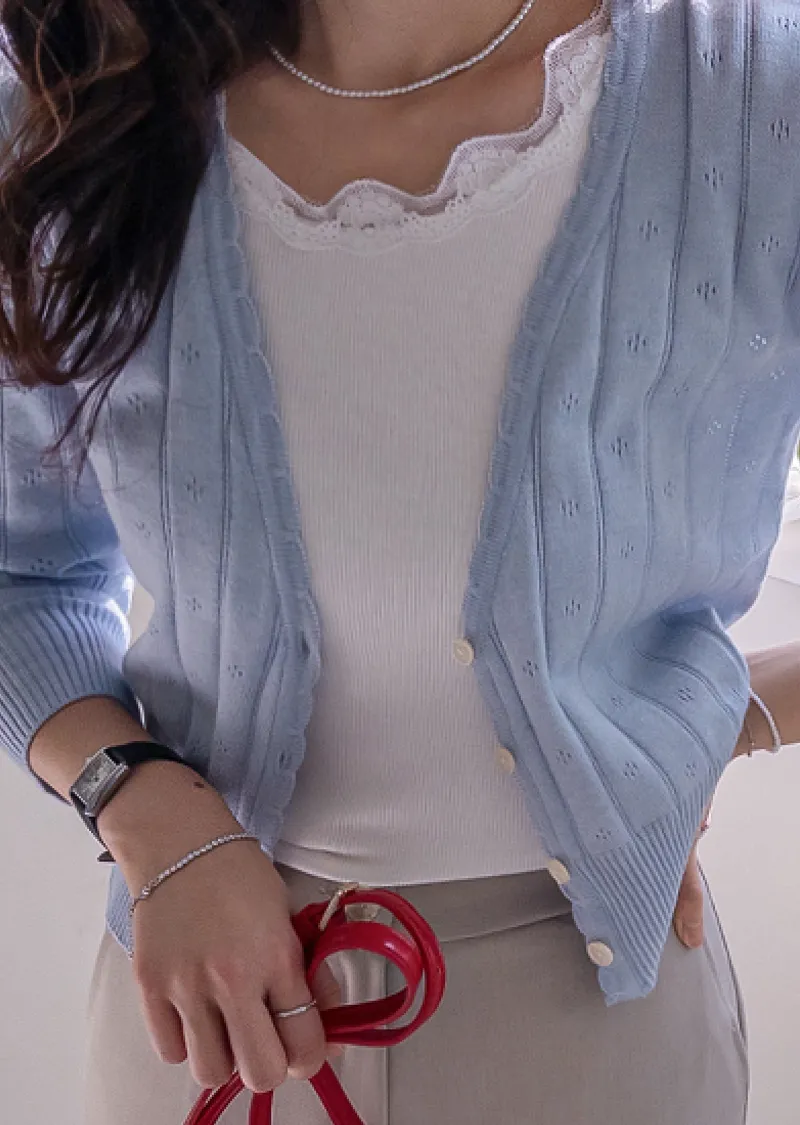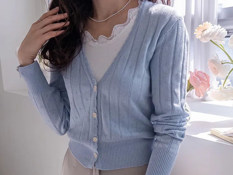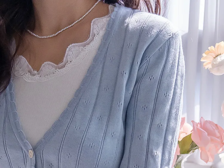柔軟舒適領口鈕扣波浪襯邊精緻鏤空設計開衫