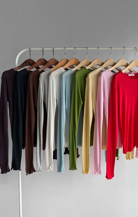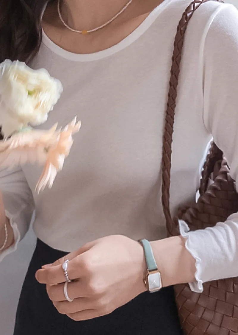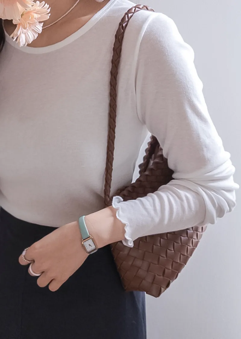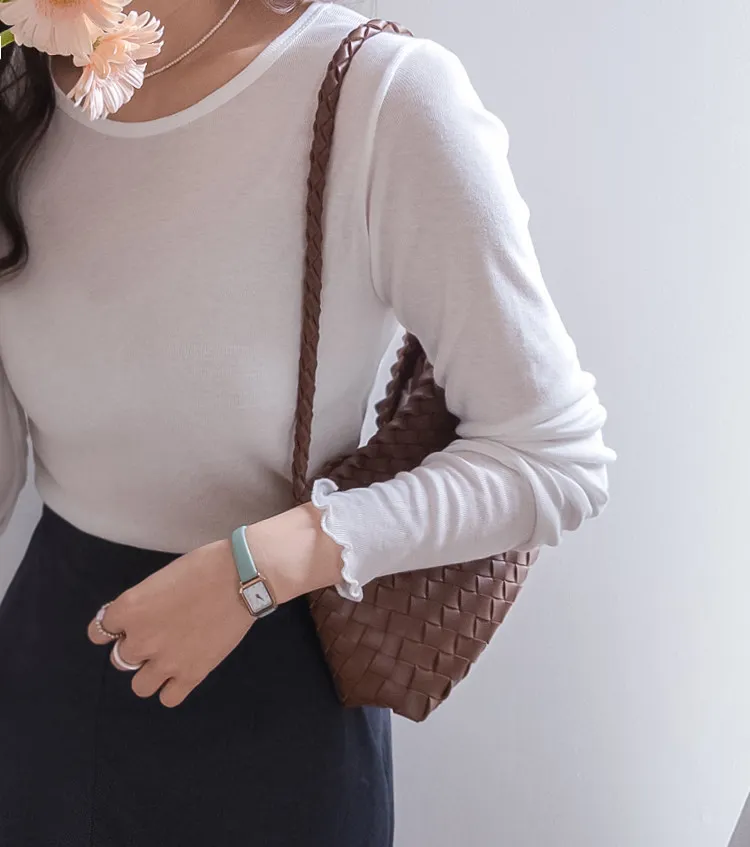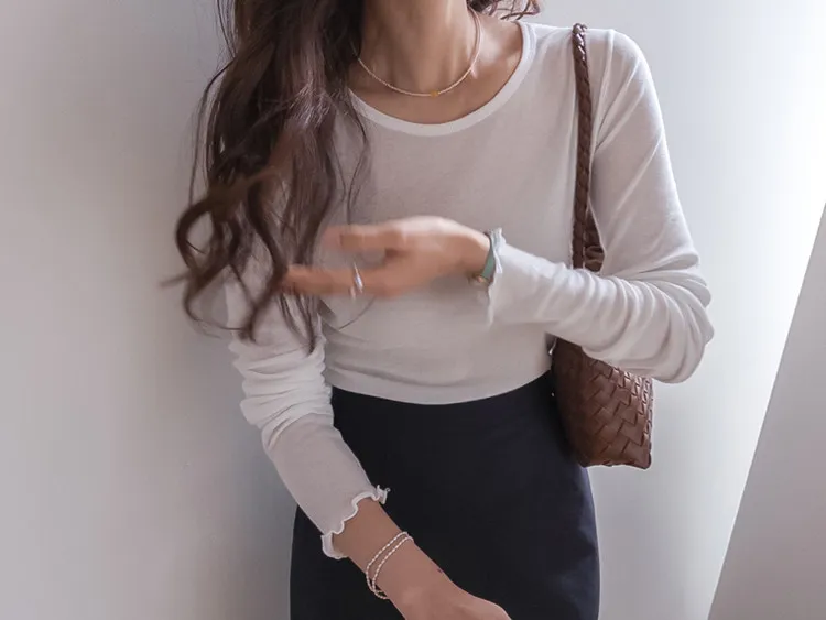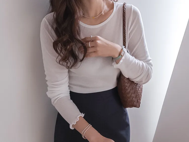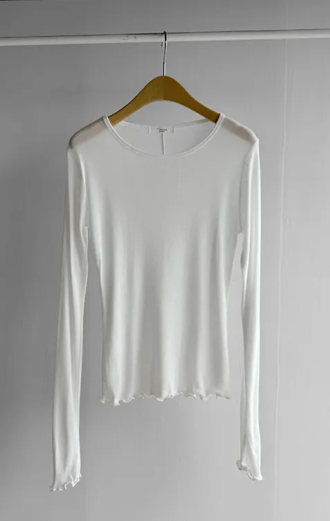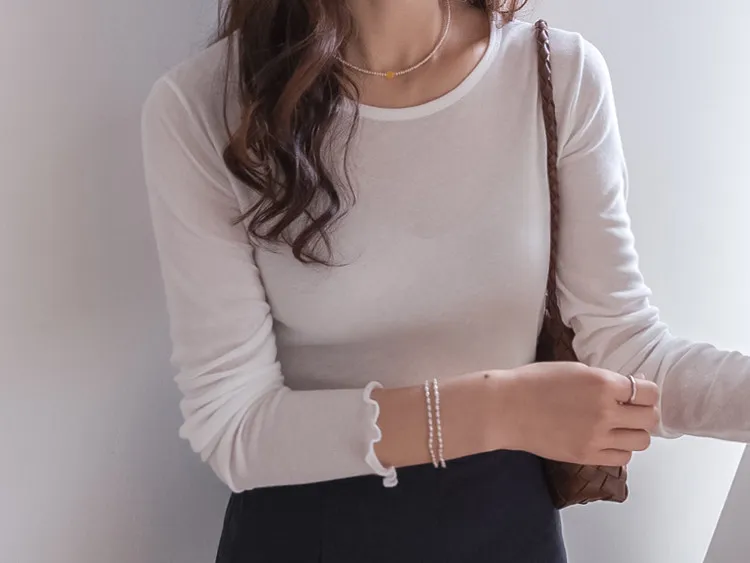 柔軟彈性天絲混紡點綴袖末下擺波浪邊上衣