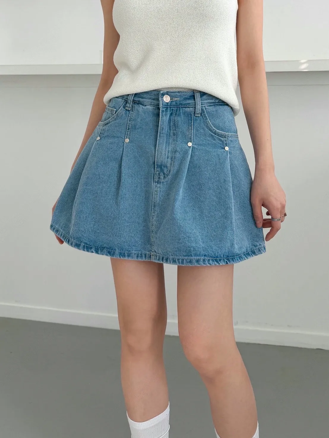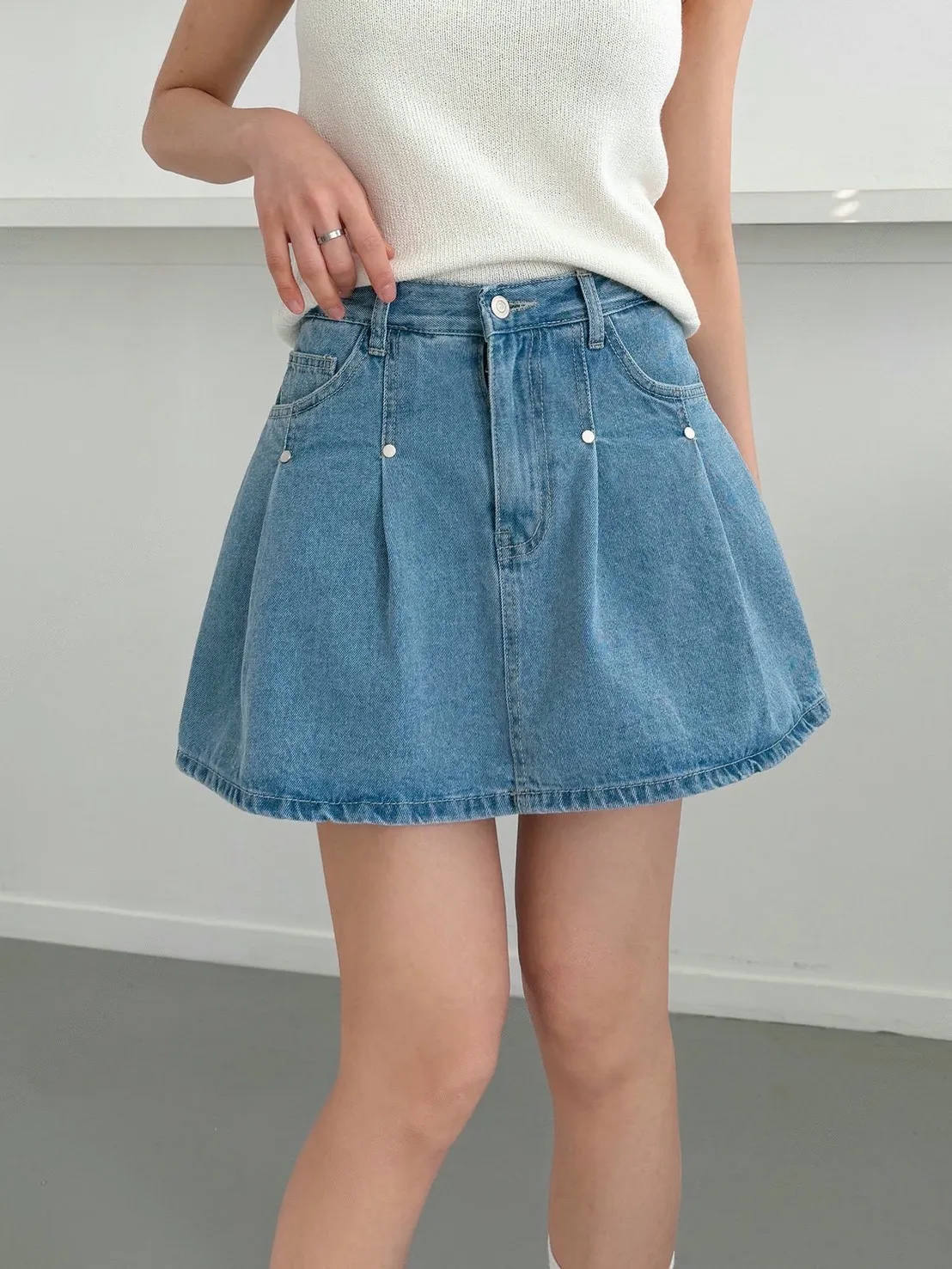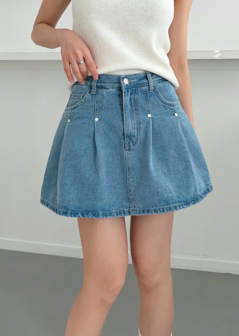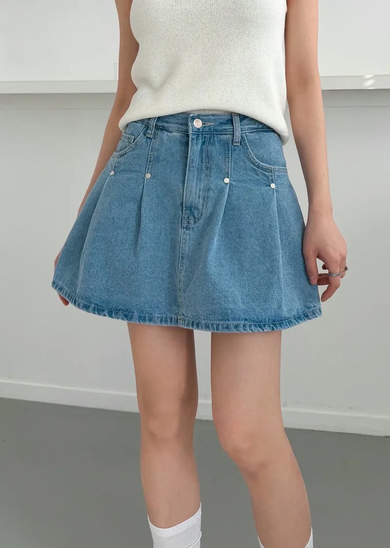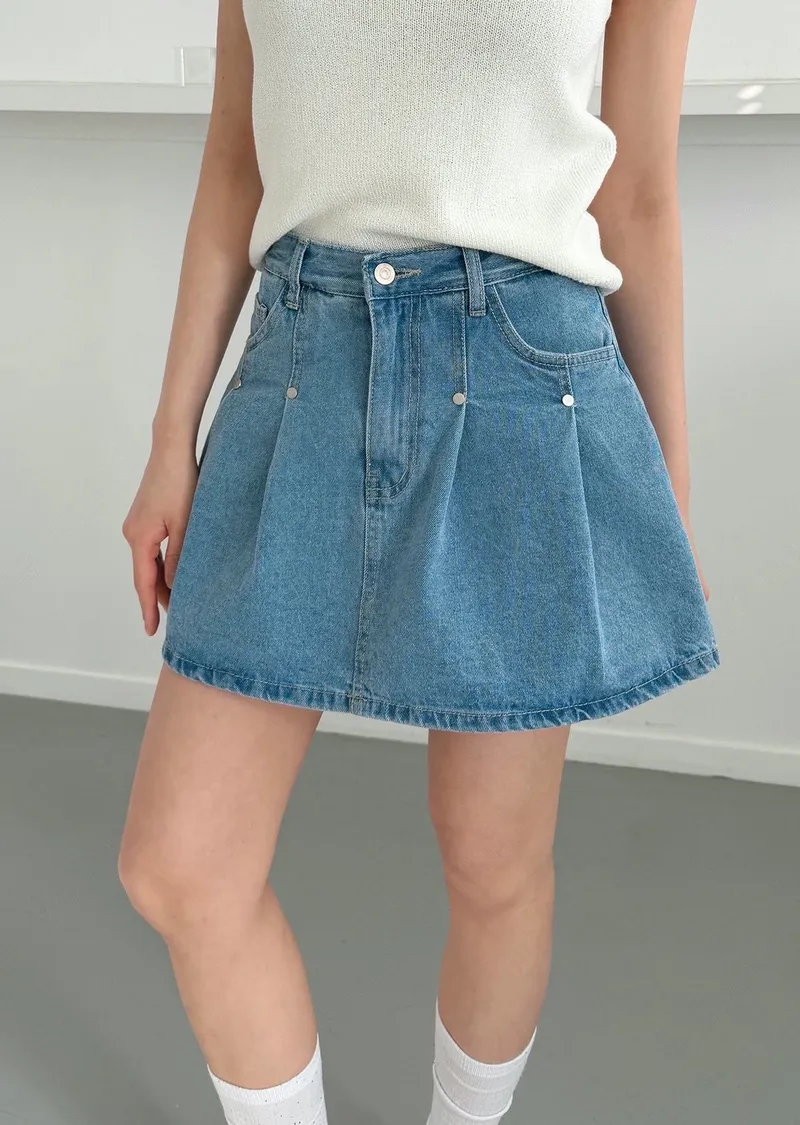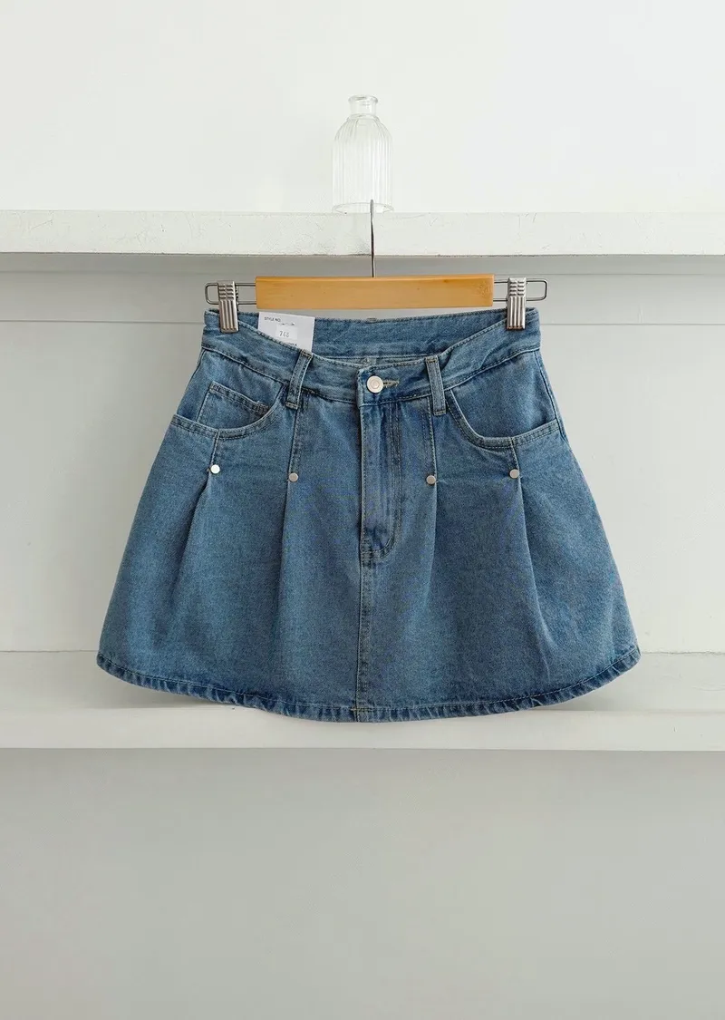 高腰鉚釘牛仔百褶褲裙