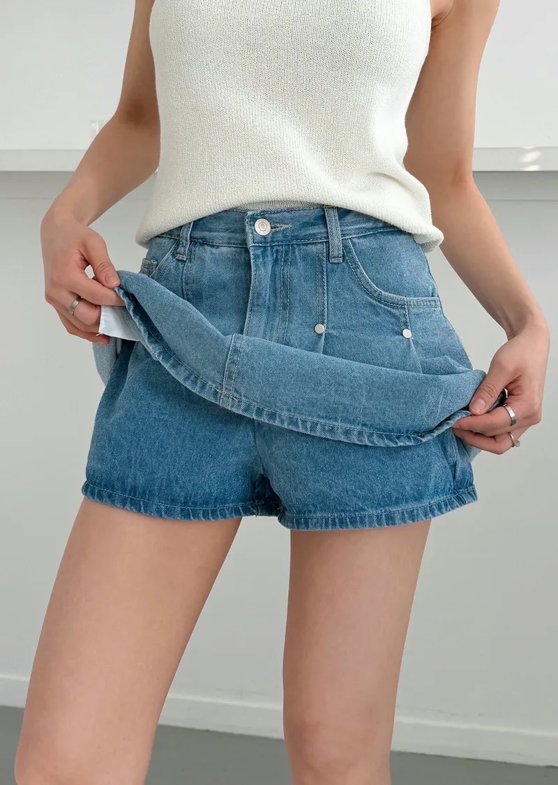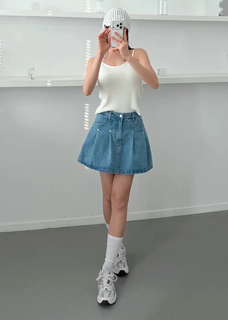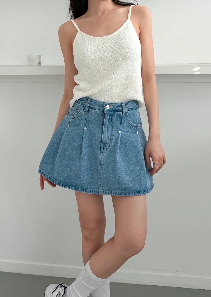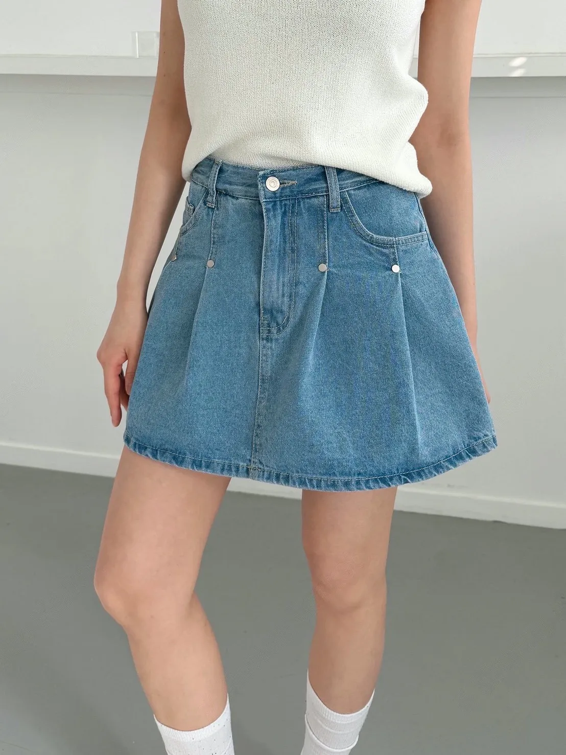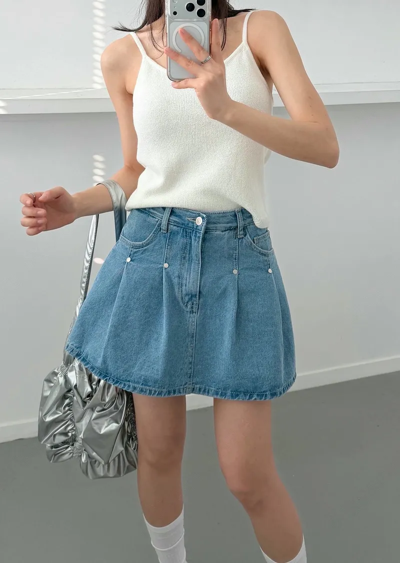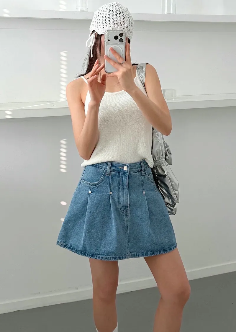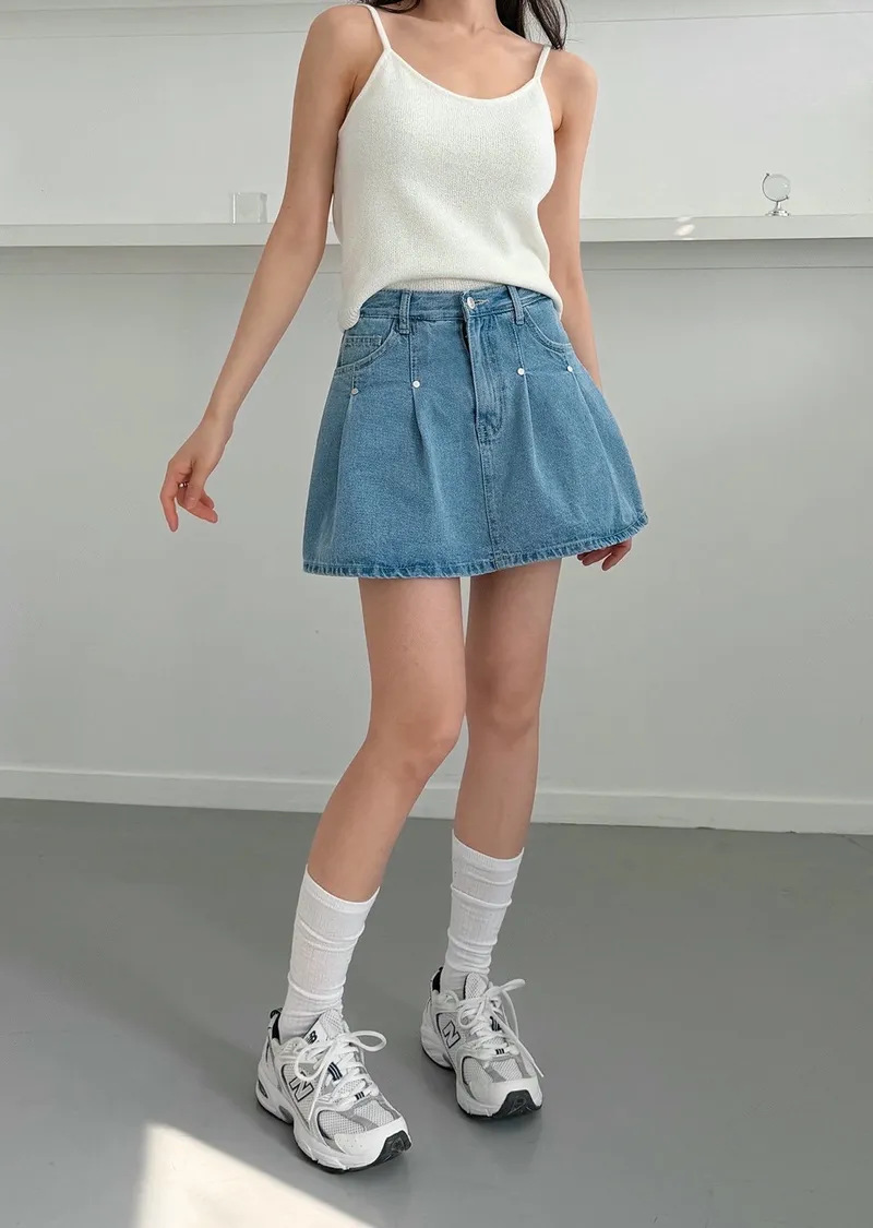 高腰鉚釘牛仔百褶褲裙