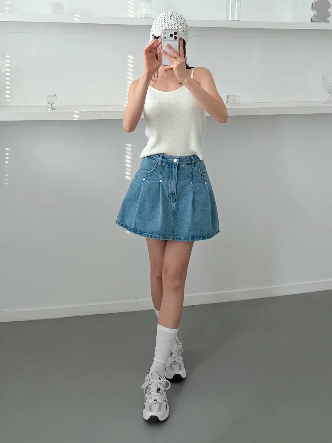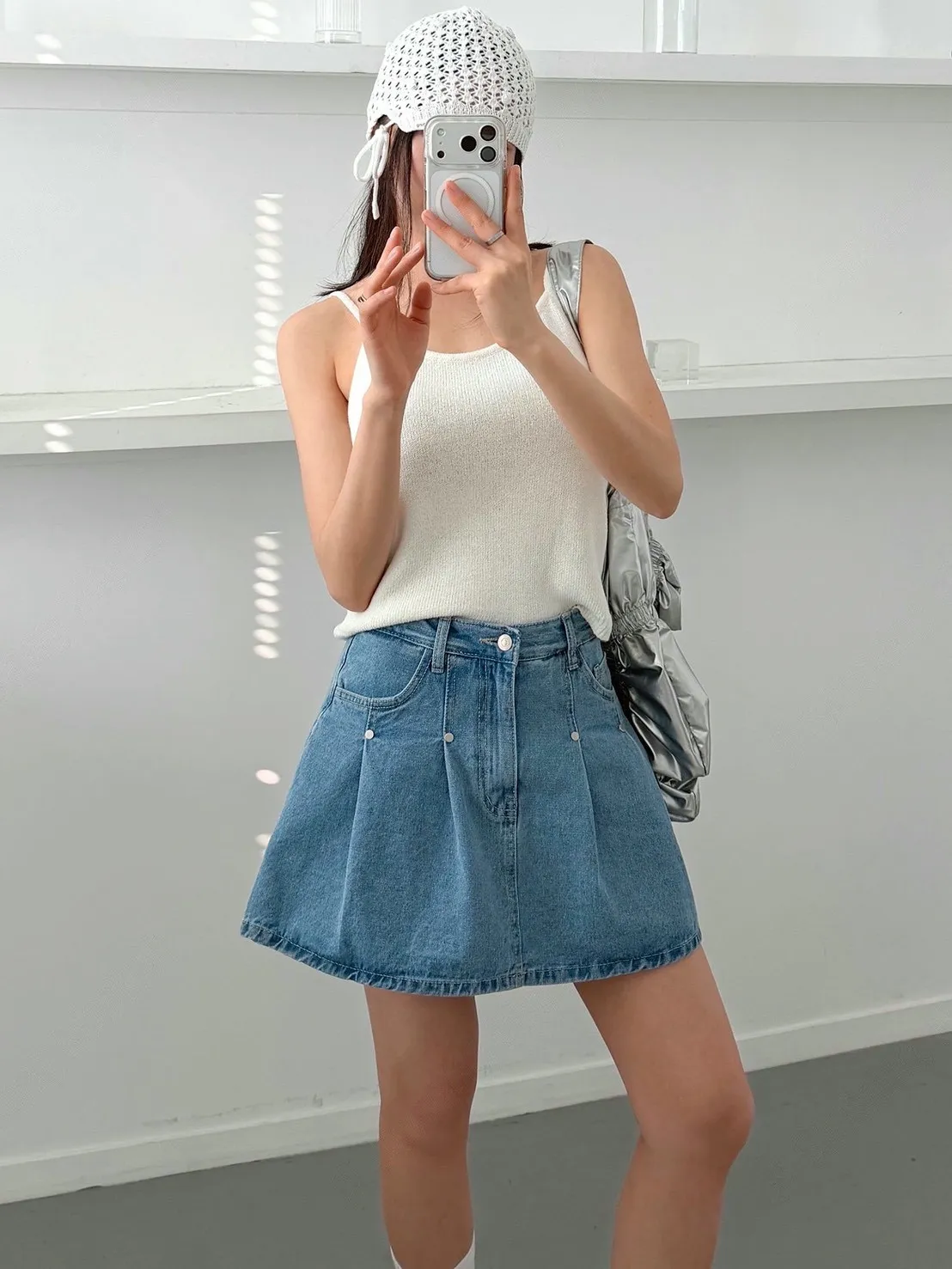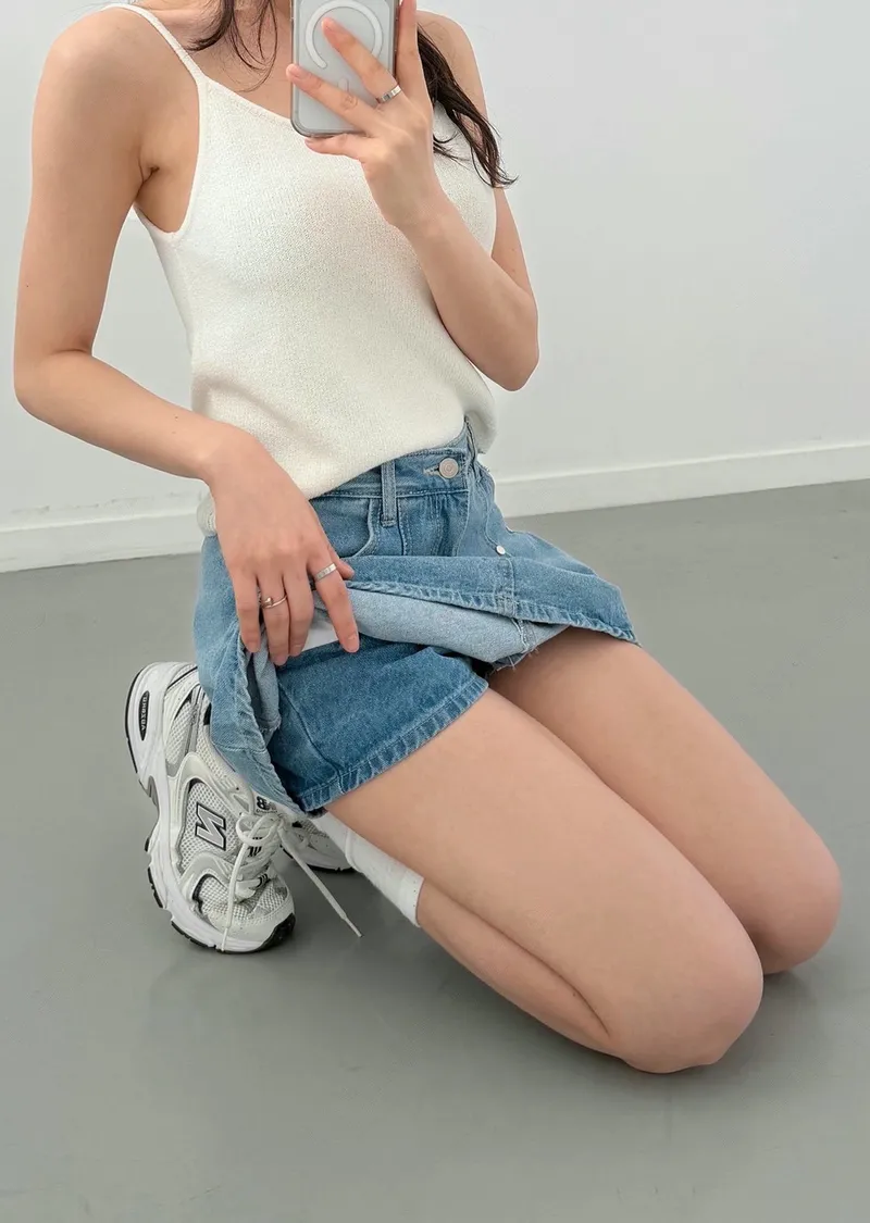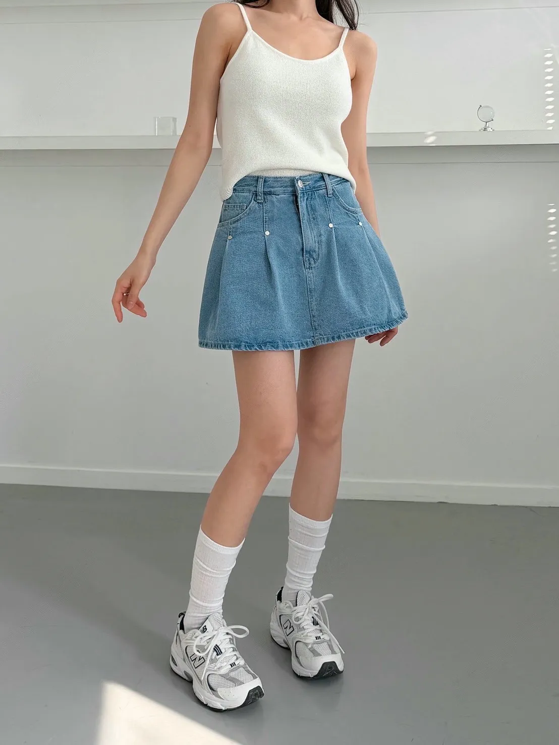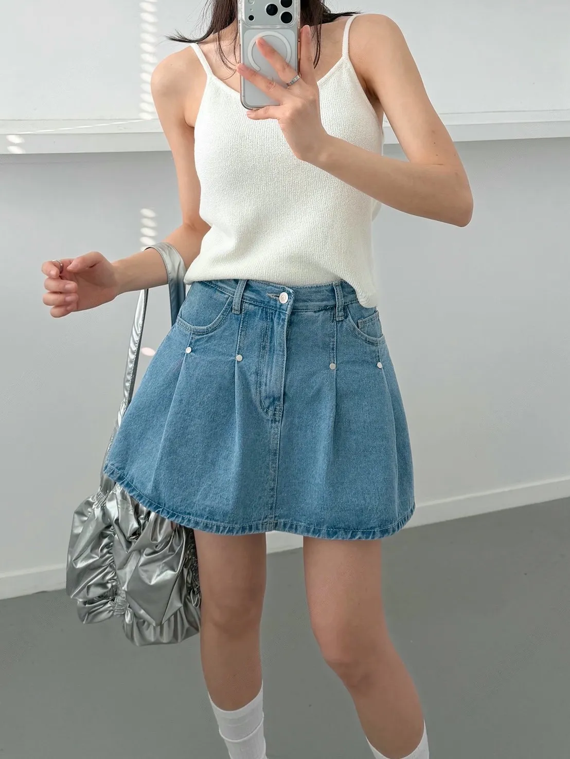 高腰鉚釘牛仔百褶褲裙