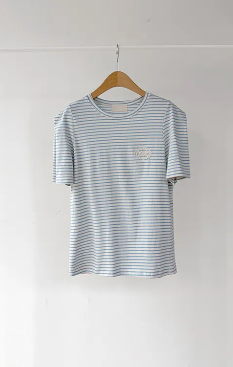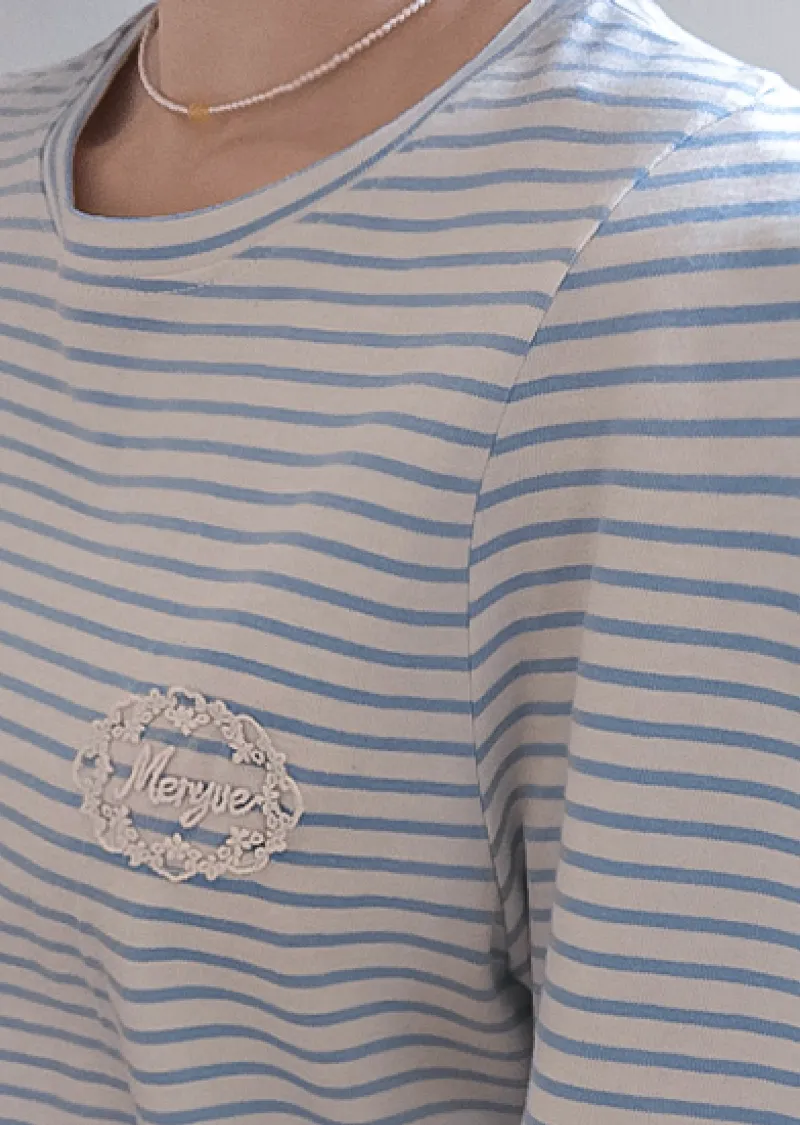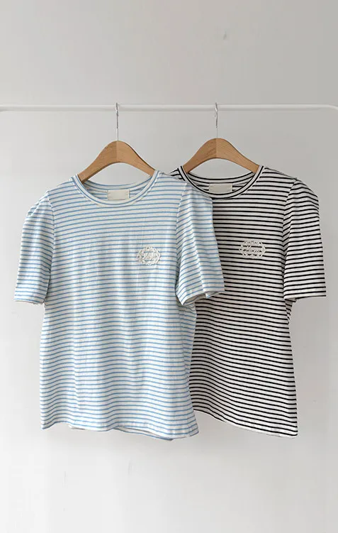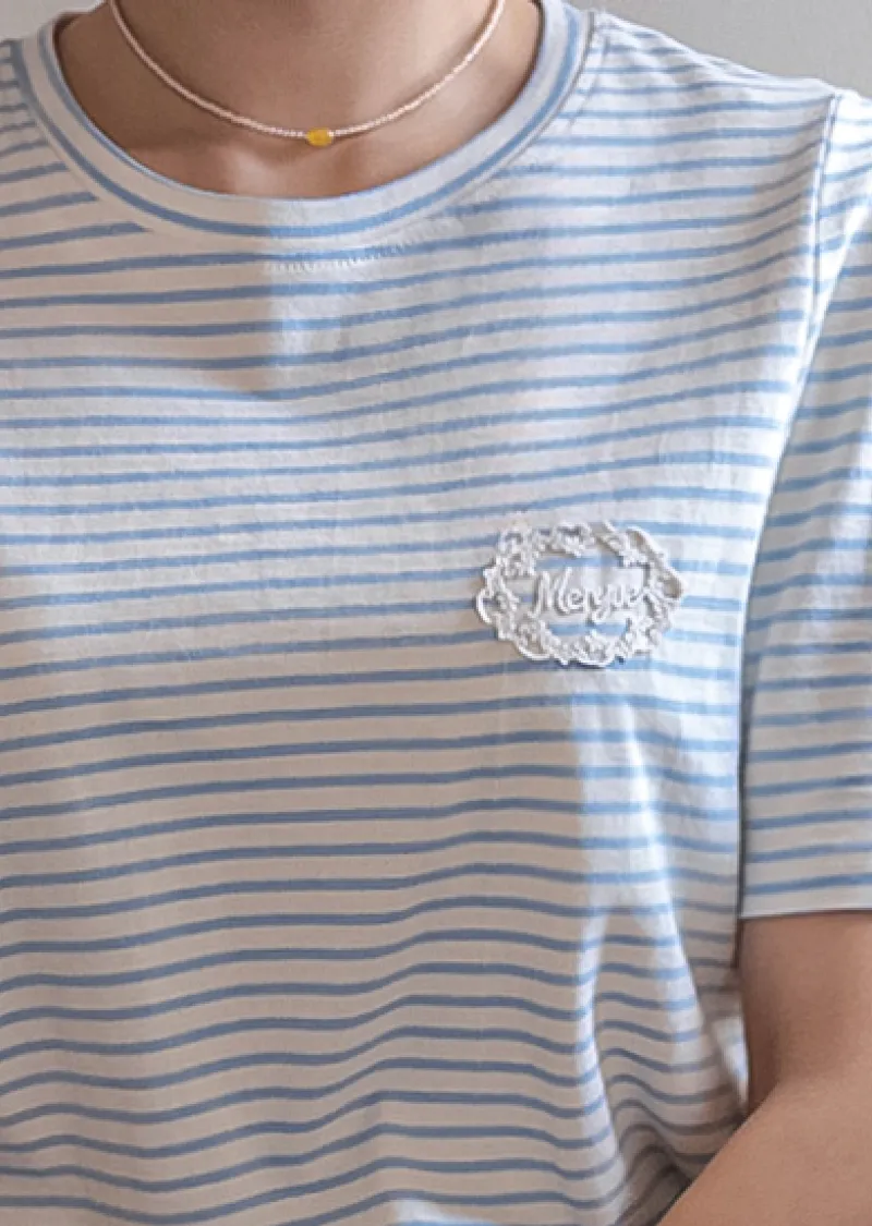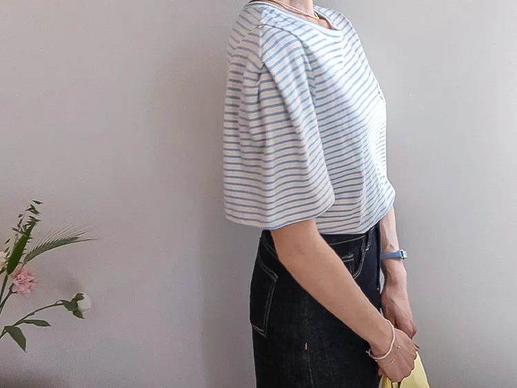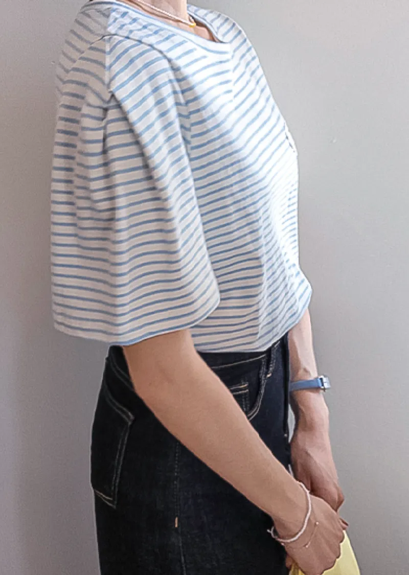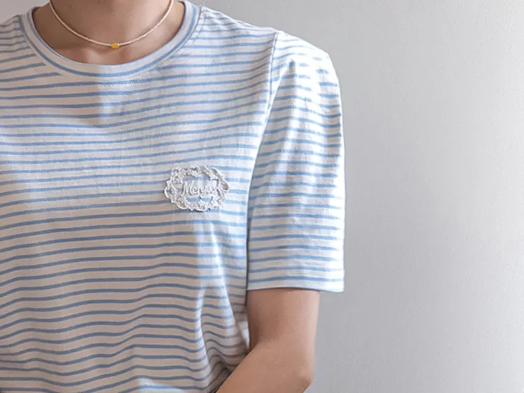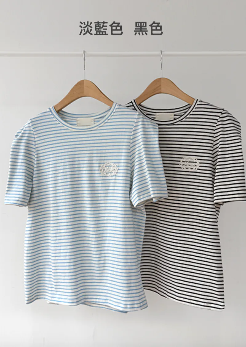 【清新氣息,飾以精緻條紋】【蓬鬆泡泡袖,飾有褶襉細節】【胸前飾有蕾絲貼花】【基礎長度,適合日常穿著】