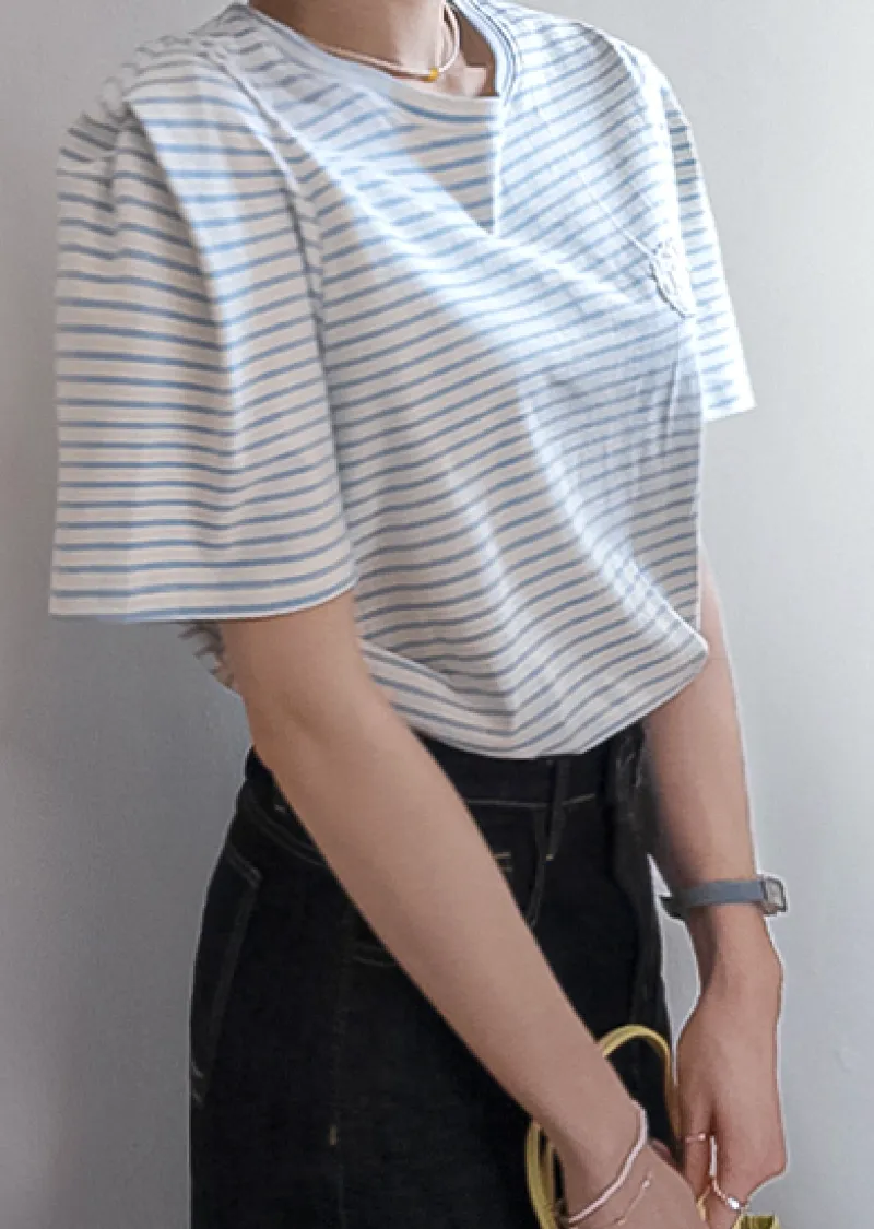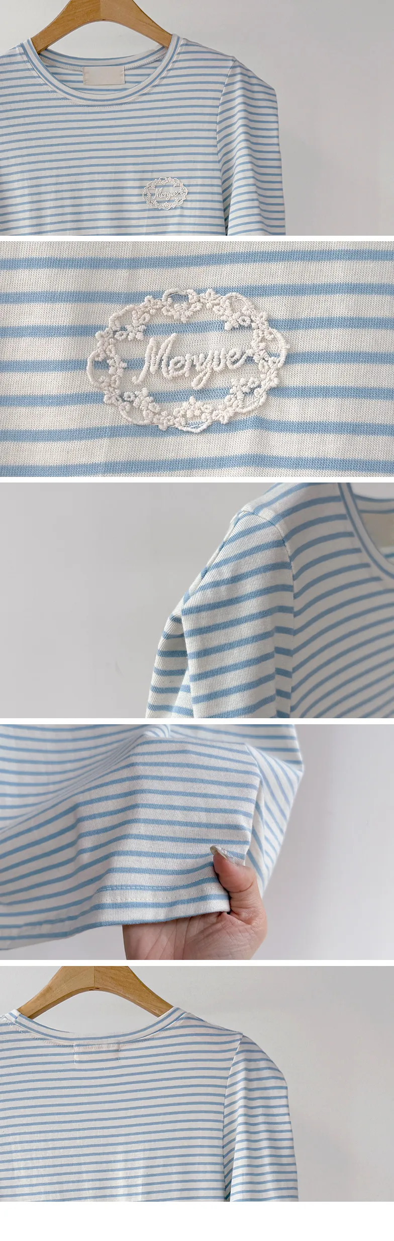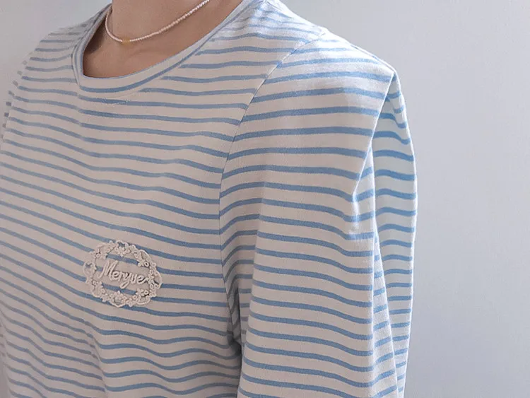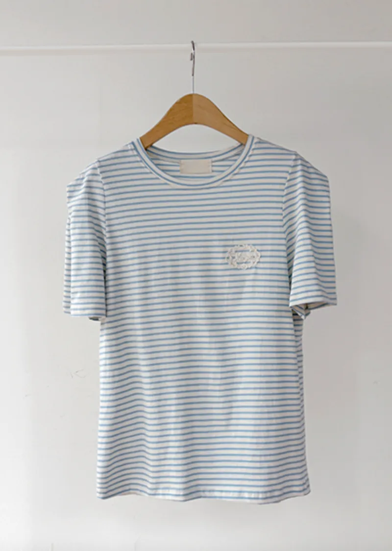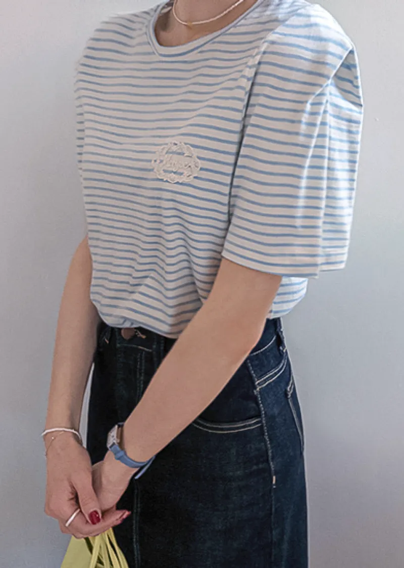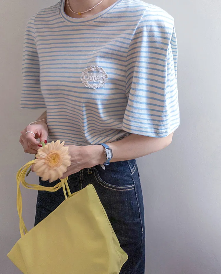 【清新氣息,飾以精緻條紋】【蓬鬆泡泡袖,飾有褶襉細節】【胸前飾有蕾絲貼花】【基礎長度,適合日常穿著】