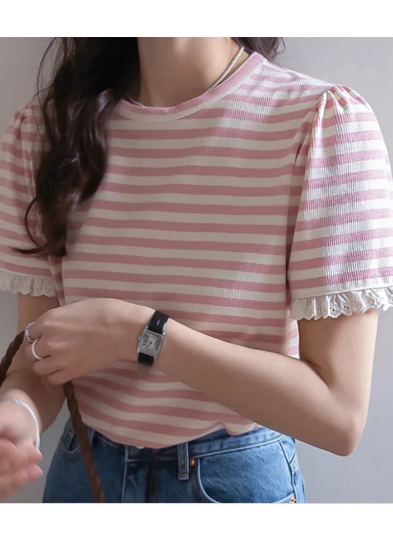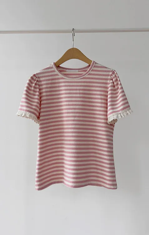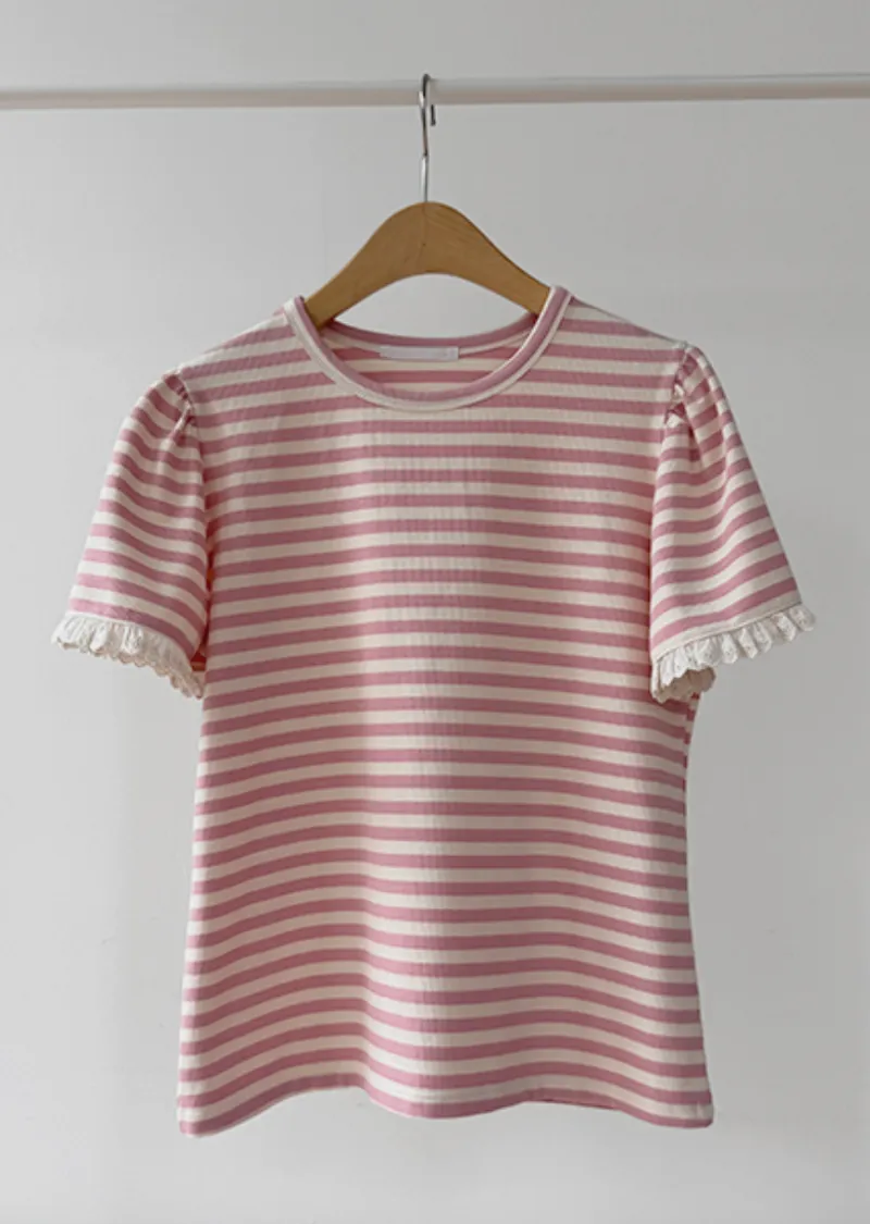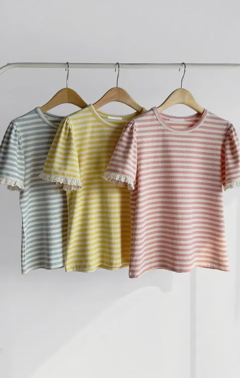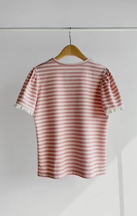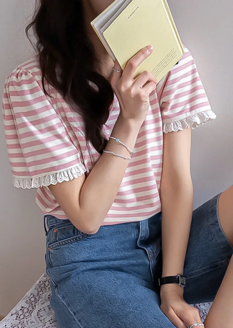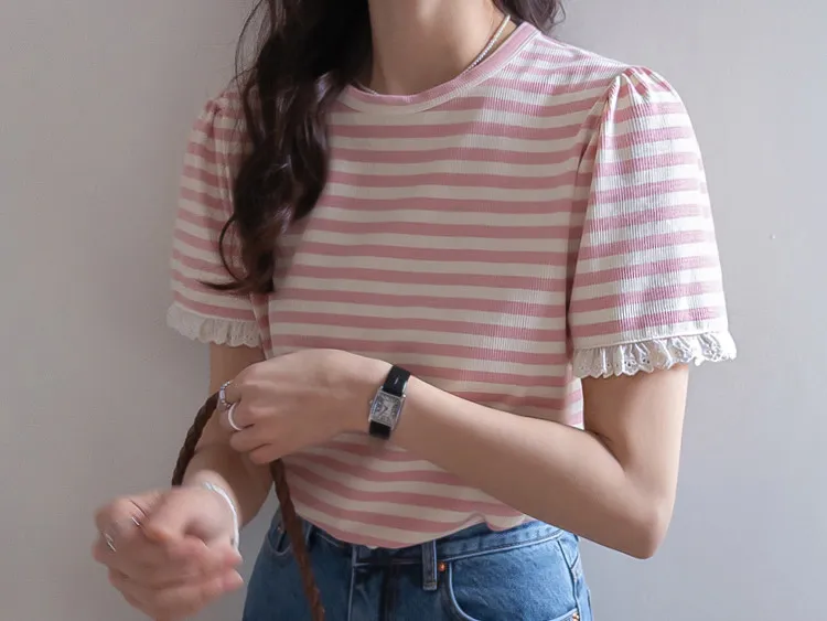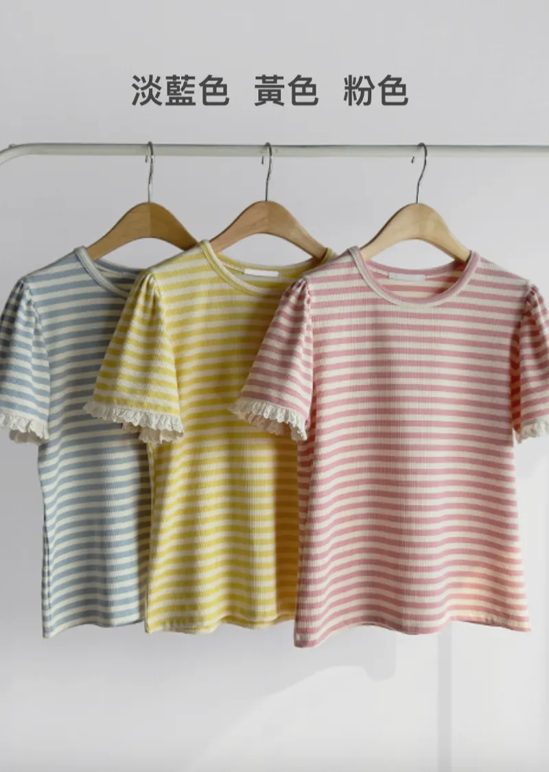 清新淡雅點綴袖末蕾絲花邊條紋上衣