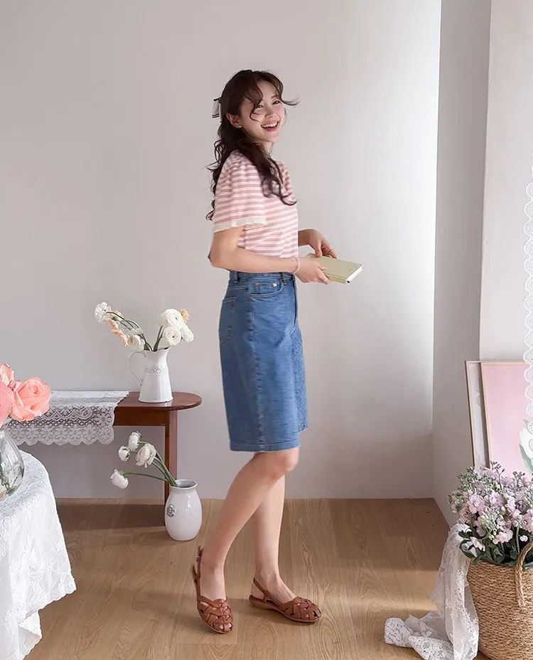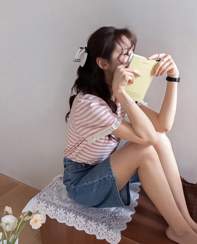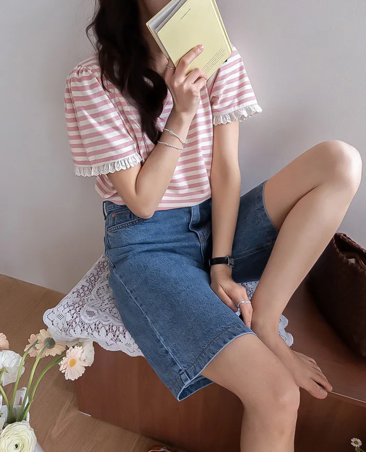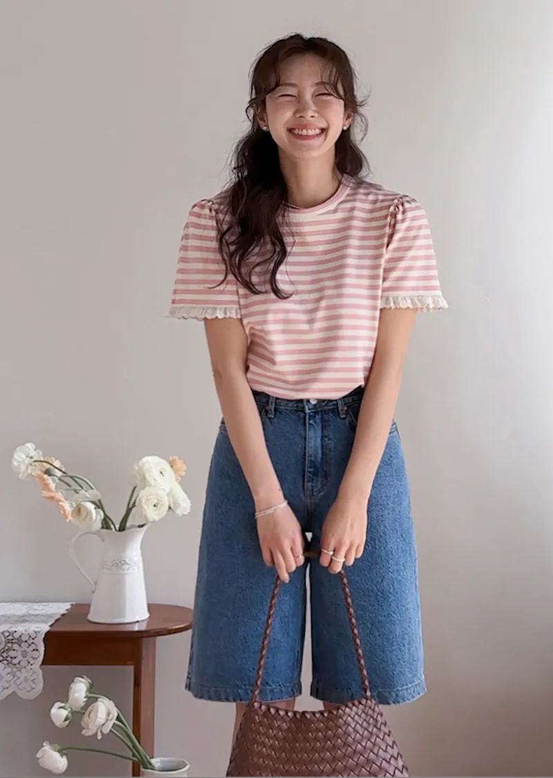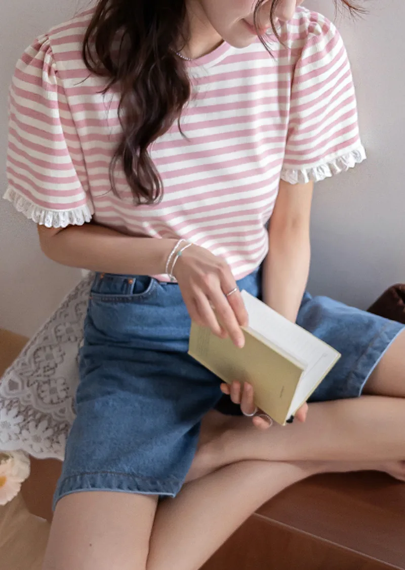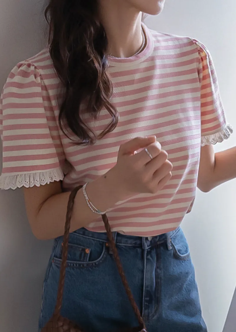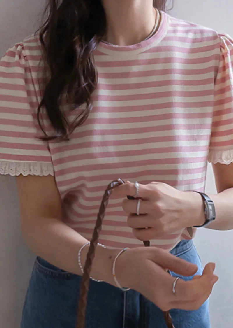 清新淡雅點綴袖末蕾絲花邊條紋上衣