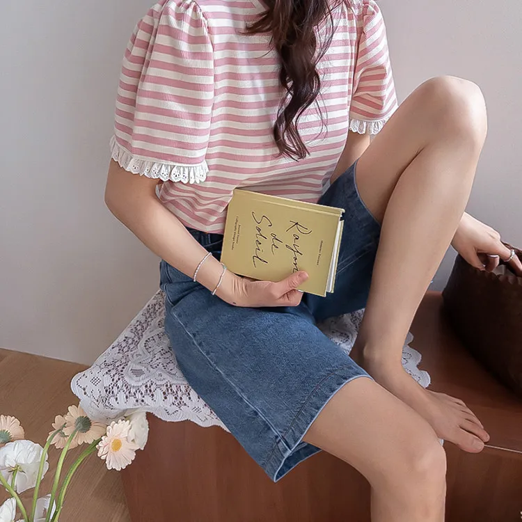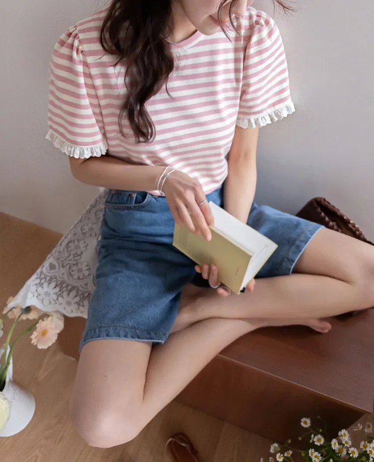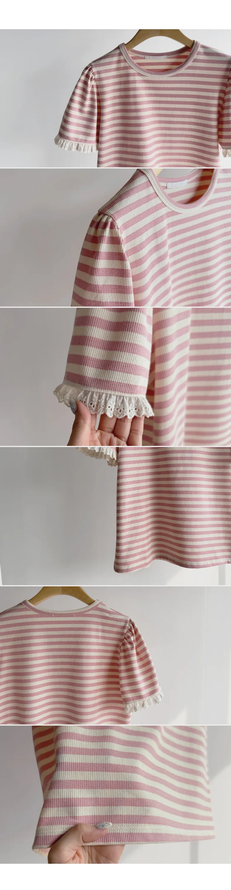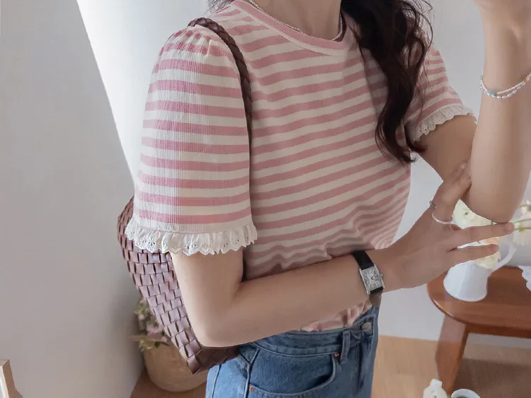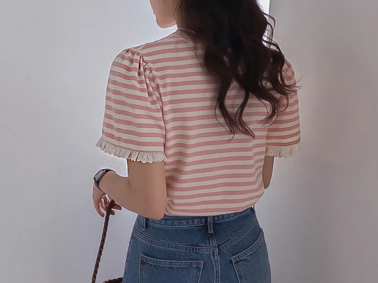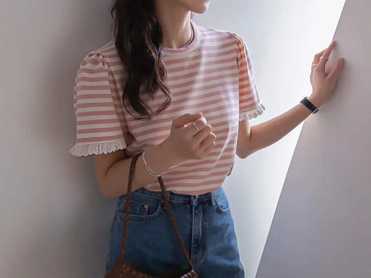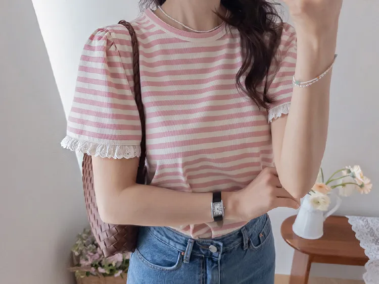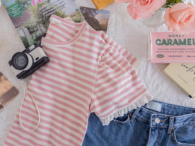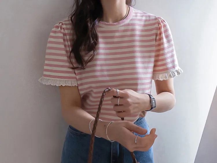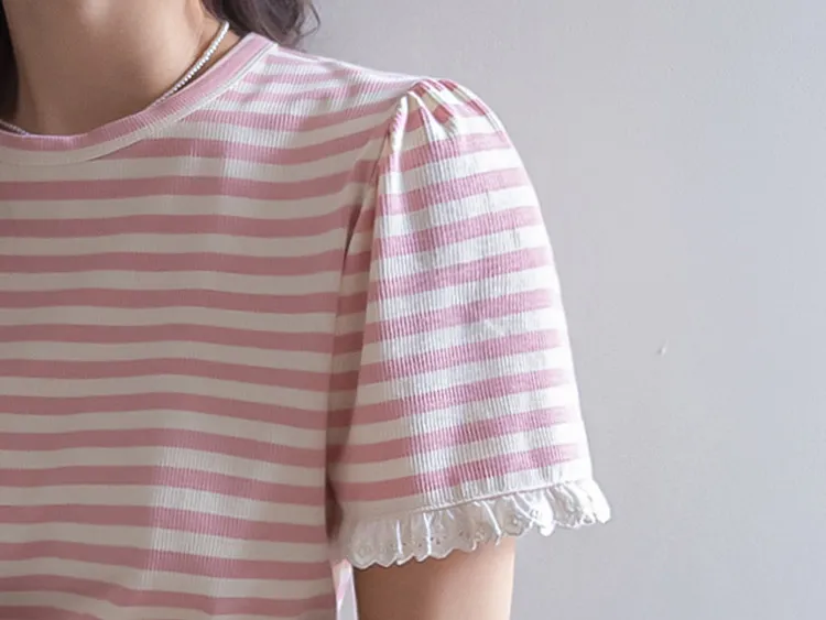 【清新淡雅的條紋】【袖口褶皺設計+蕾絲細節點綴】【簡潔圓領設計】【日常穿著的理想之選】