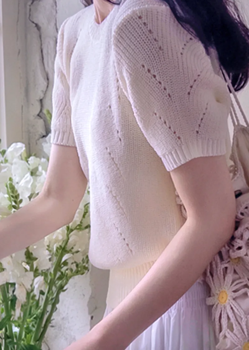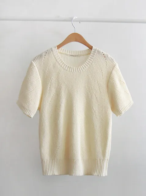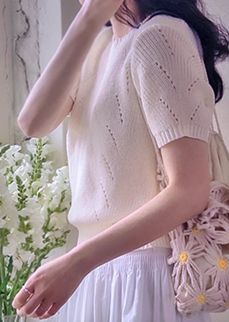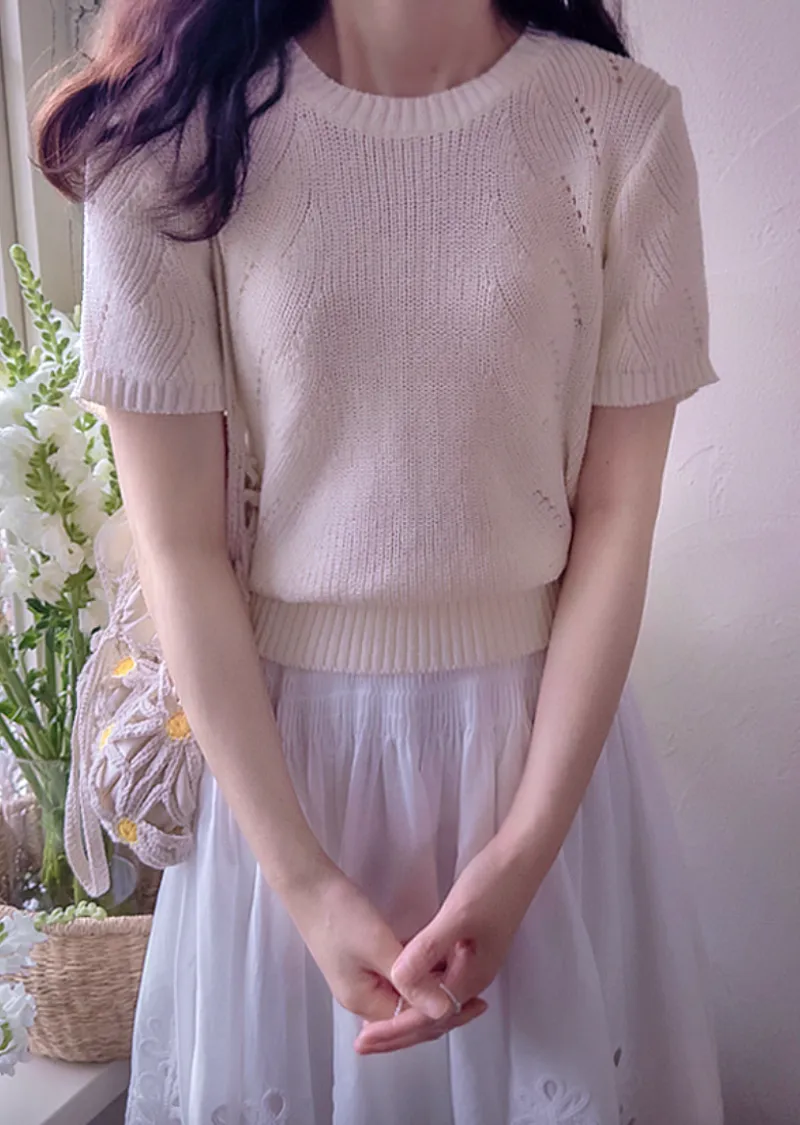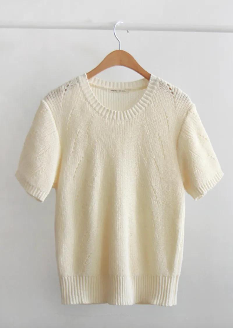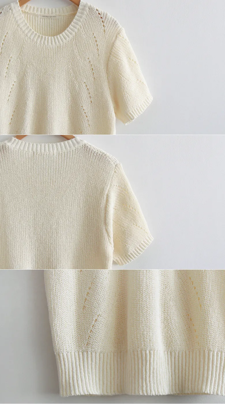 材質:100% 聚酯纖維【亮彩針織衫,觸感涼爽】【袖子和衣身的鏤空設計,春夏的理想之選】【優雅圓領針織衫非常適合日常穿著】【推薦這款帶有精緻鏤空細節的短袖針織衫】