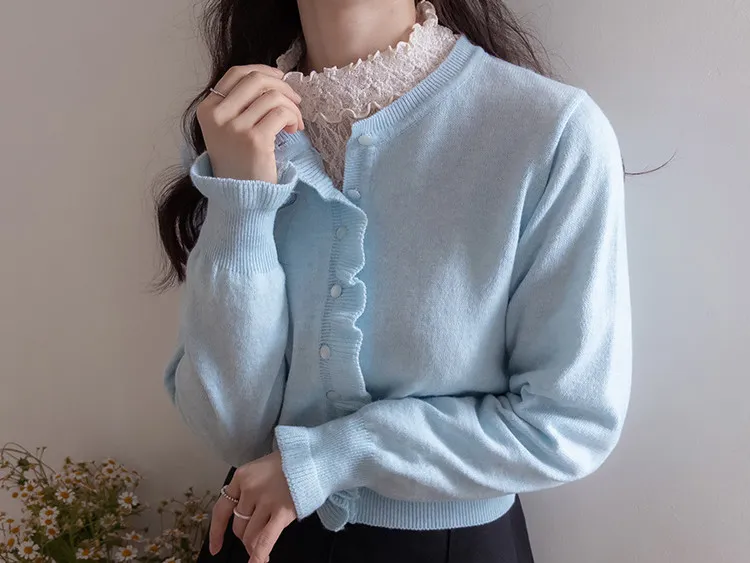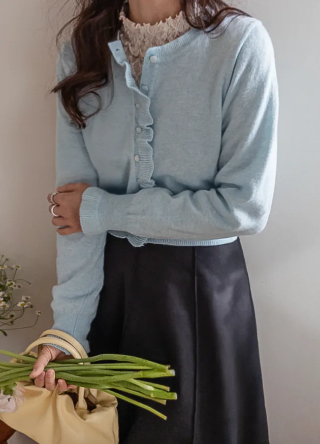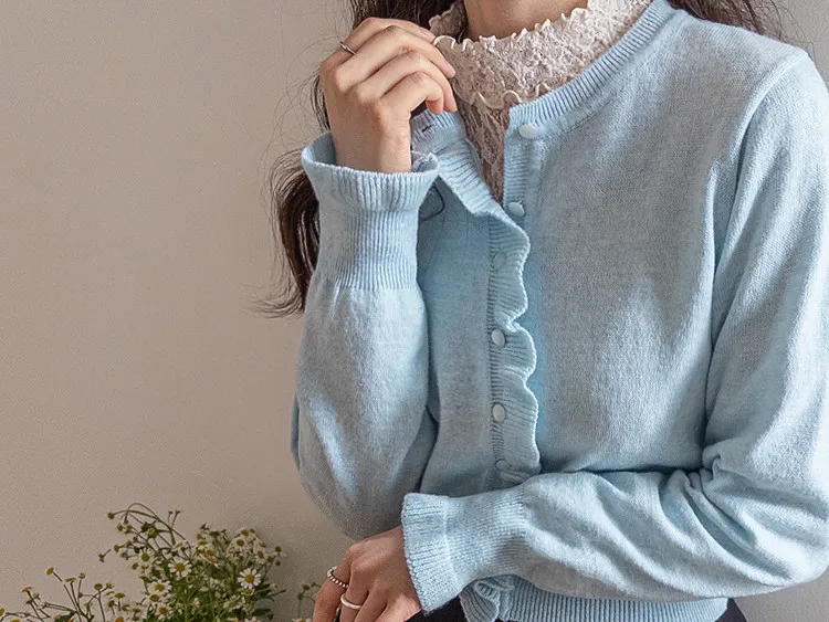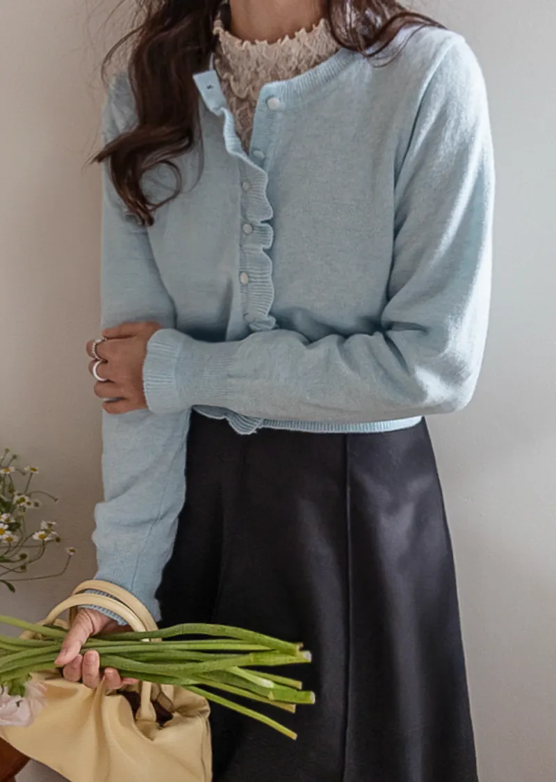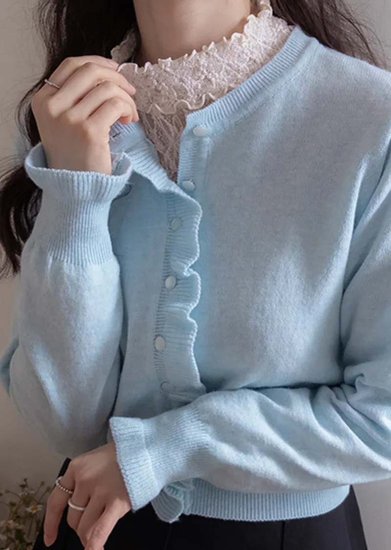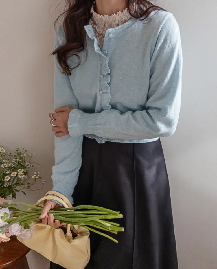 魅力鈕扣荷葉襯邊優雅袖末摺邊開衫