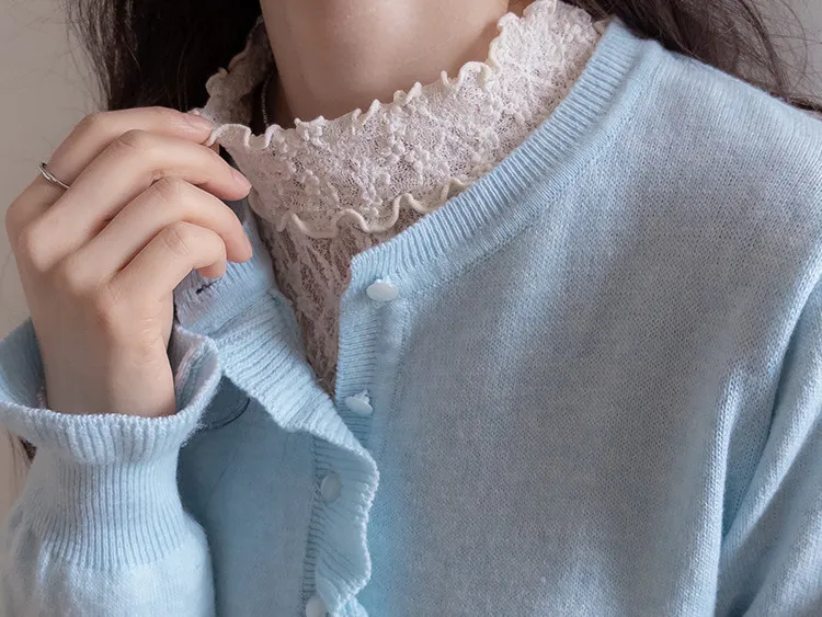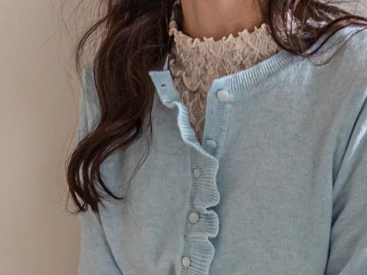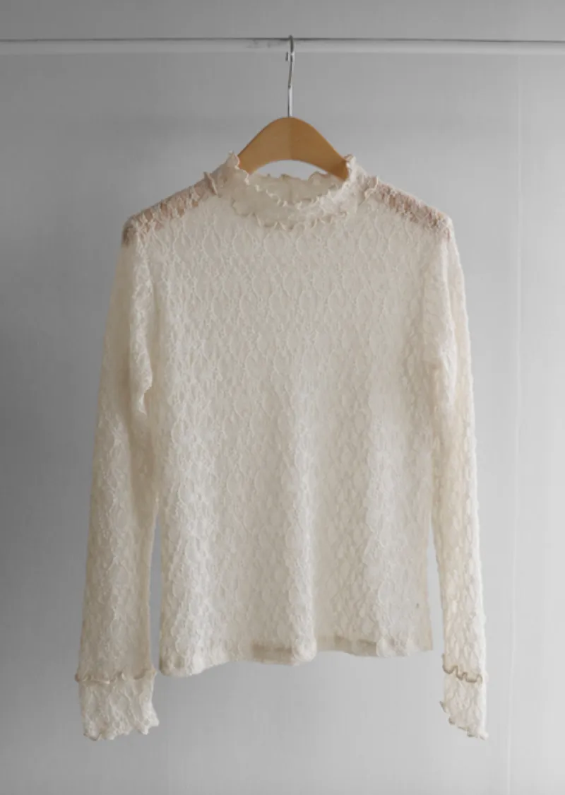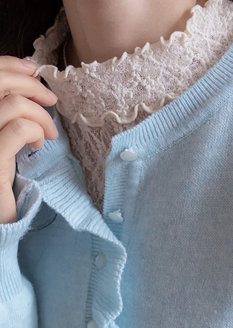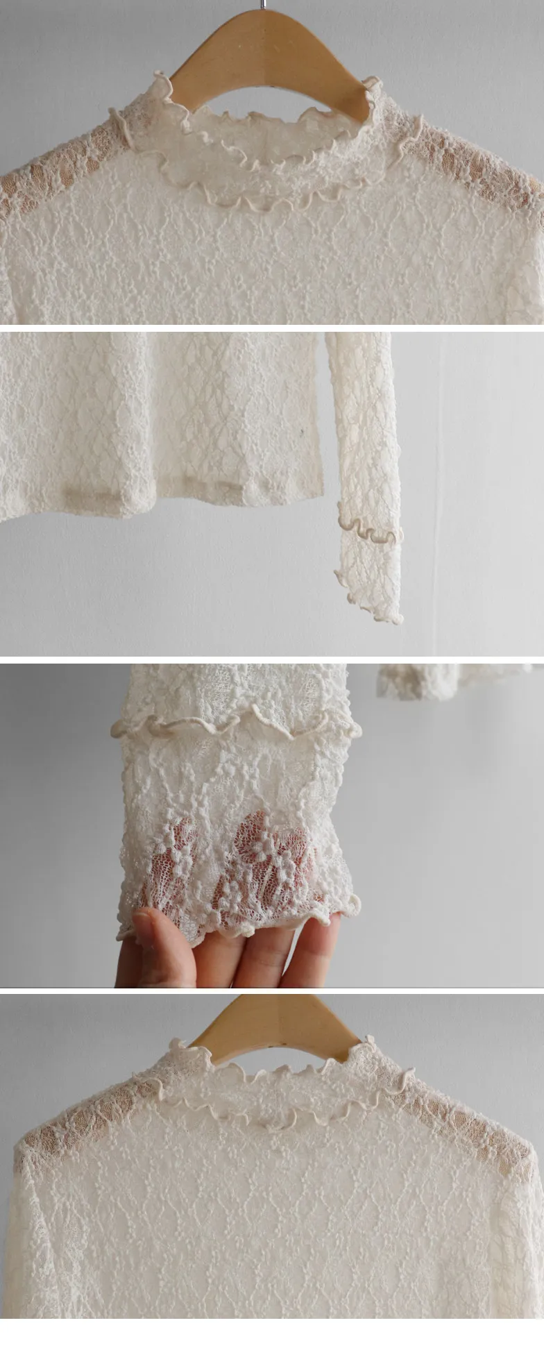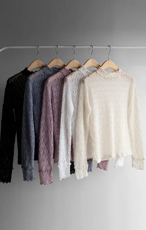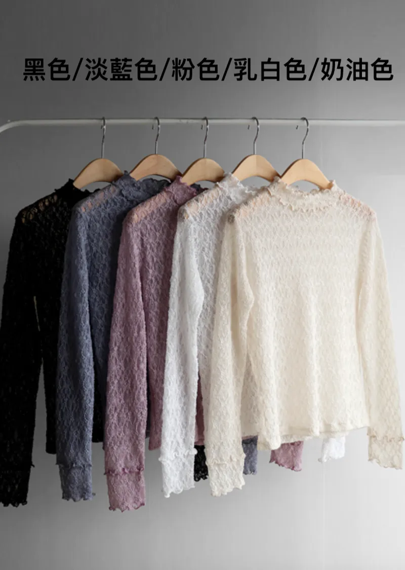 【精緻蕾絲紋理,展現柔美氣質】【修身剪裁,完美貼合身形,非常適合疊穿!】【領口和袖口飾以荷葉摺邊】【每款顏色都值得擁有♡】