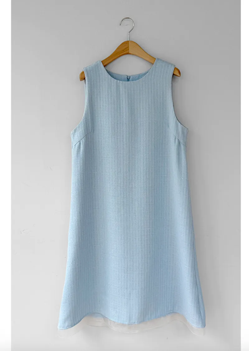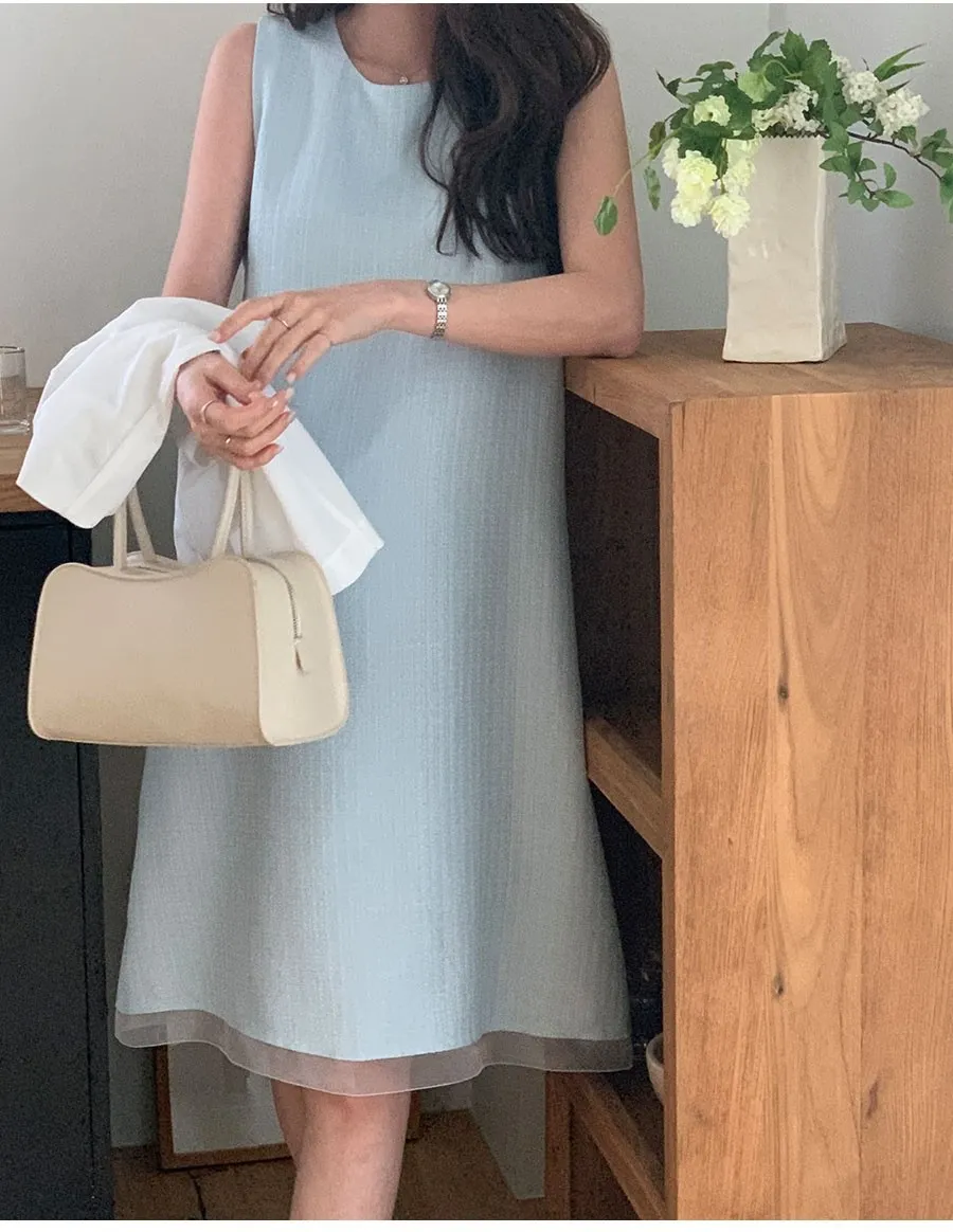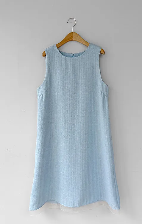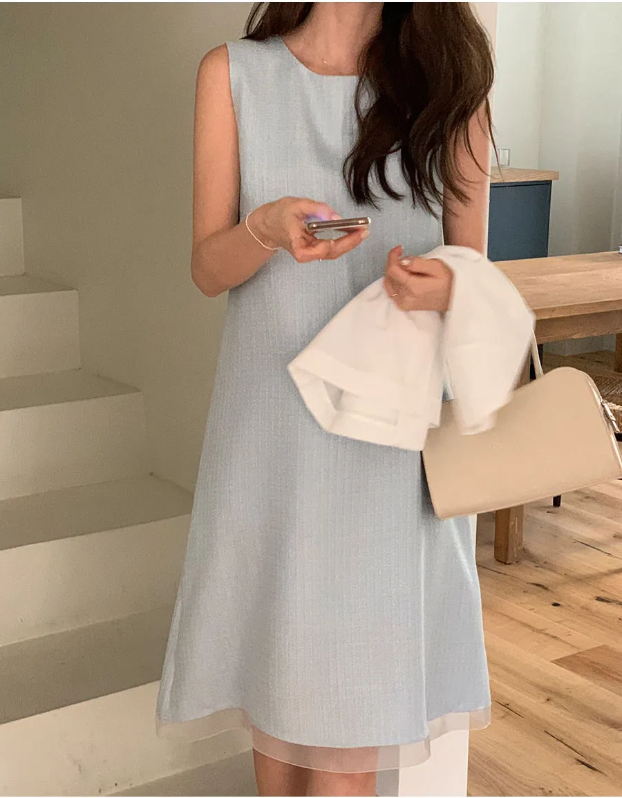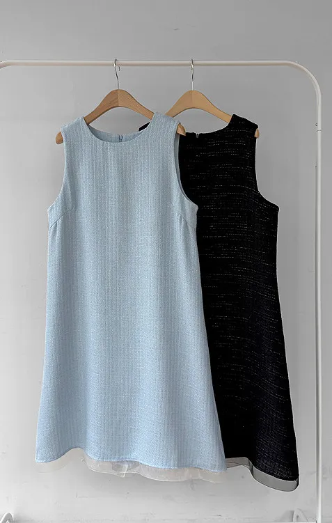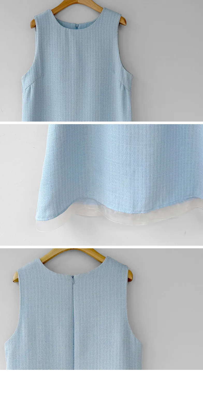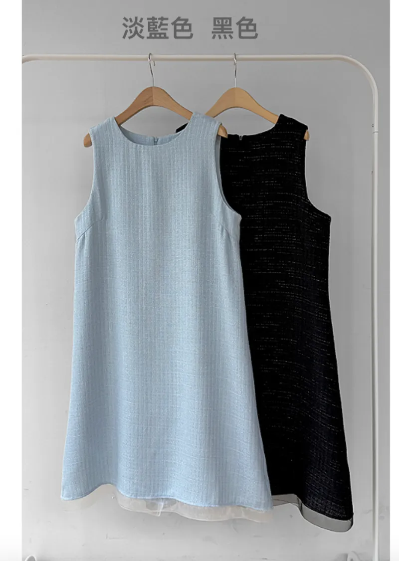 柔美下擺薄紗層疊A字輪廓無袖花呢連身裙